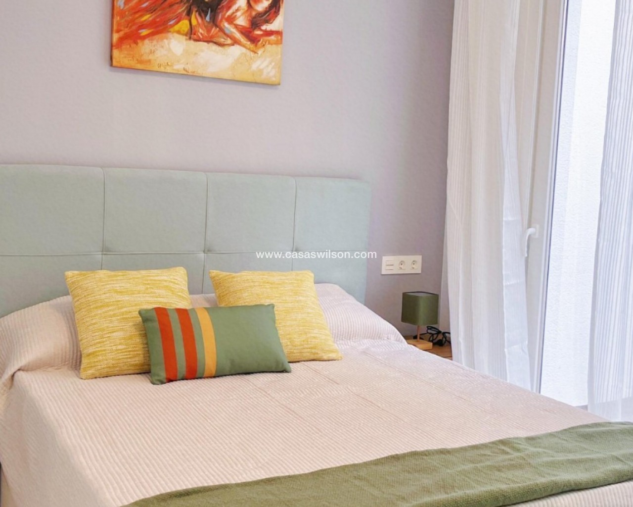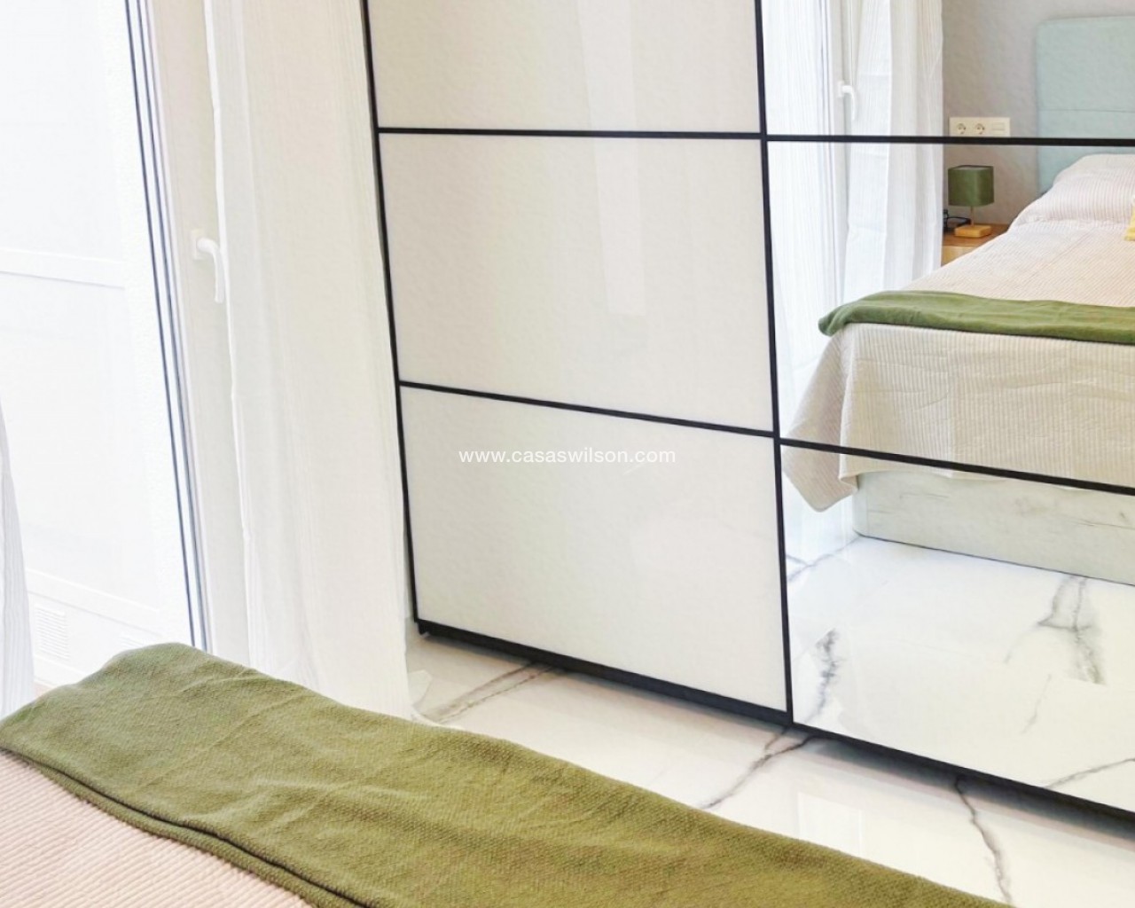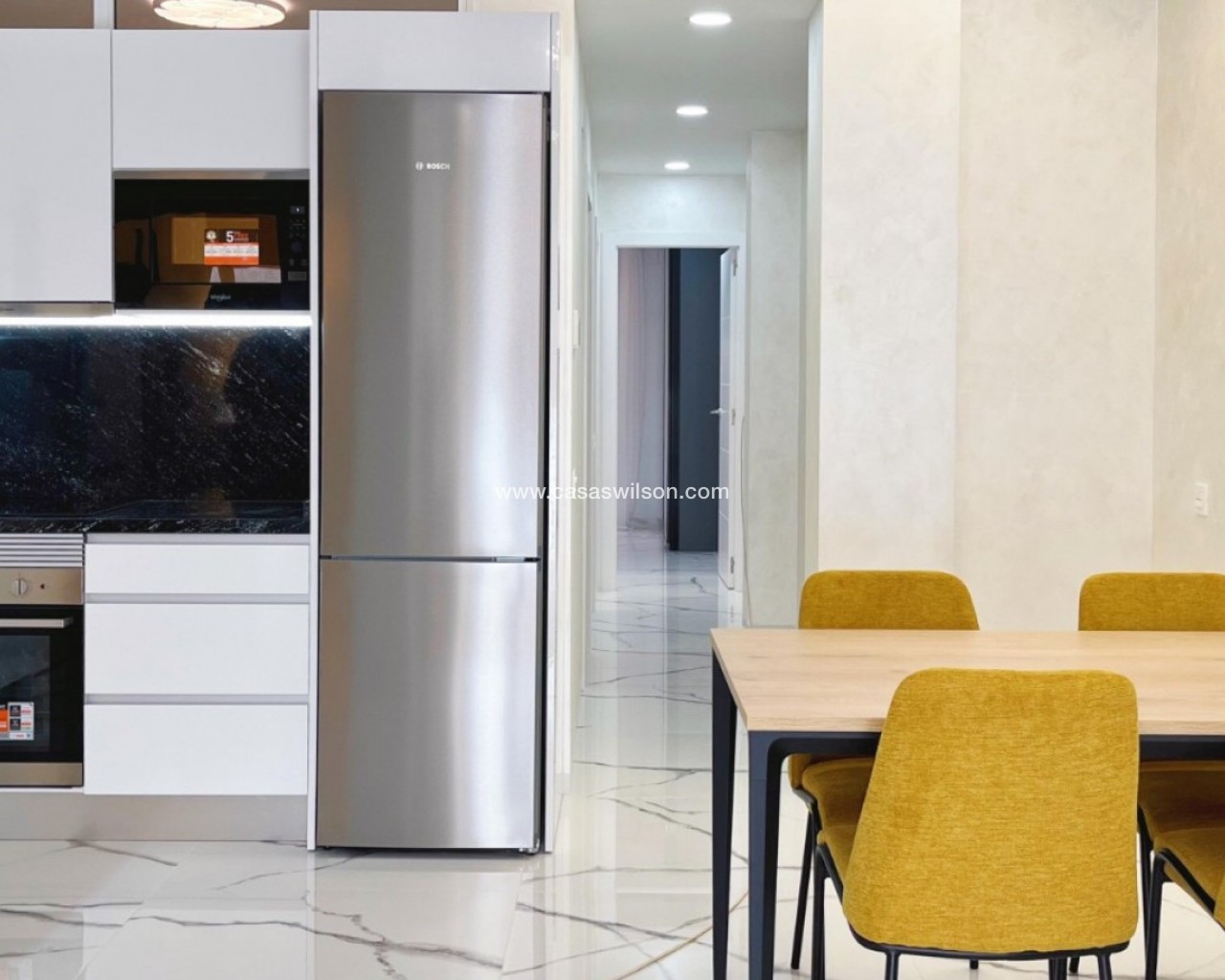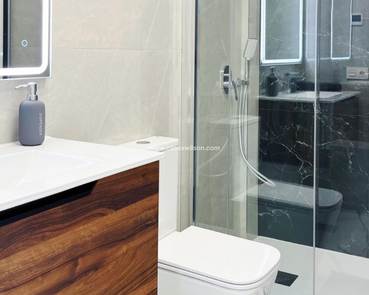 Ubicado en la codiciada Avenida de la Purísima, a solo unos pasos de la Playa del Cura, este elegante apartamento en planta baja ofrece el equilibrio perfecto entre estilo moderno y vida costera. Con 90 m² construidos, la vivienda cuenta con 2 amplios dormitorios, 2 baños de lujo y un encantador patio privado. Ideal como residencia habitual, segunda vivienda o inversión con gran potencial de alquiler. En el interior, ofrece una luminosa zona de estar y comedor con grandes ventanales y acabados modernos. La cocina está equipada con electrodomésticos BOSCH de alta gama, encimeras negras y mobiliario elegante. Los dormitorios están decorados con armarios empotrados y ropa de cama de calidad. El dormitorio principal tiene acceso directo al patio privado con ducha exterior, pared vegetal y detalles en madera: un espacio tranquilo para relajarse después de la playa. Los baños están acabados con cerámica de alta gama y azulejos efecto mármol, espejos con luz LED y duchas acristaladas. Características principales: 2 dormitorios y 2 bañosPatio privado con ducha exteriorTotalmente amueblado y listo para entrarElectrodomésticos BOSCHSuelos efecto mármol blancoEspejos LED y acabados de diseñoArmarios empotrados y trasteroOrientación este, muy luminosoCalefacción y aire acondicionadoAcceso adaptado para personas con movilidad reducidaRodeado de tiendas, restaurantes y farmacia 24hA solo 100 metros del mar Una oportunidad única de adquirir un apartamento completamente reformado en una de las zonas más demandadas de Torrevieja. Contáctanos para una visita privada.