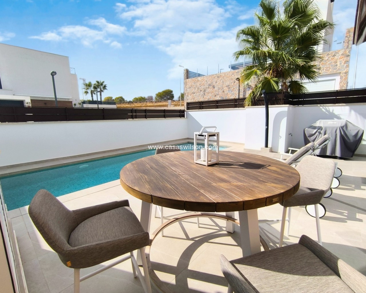 **Impresionante villa adosada en La Finca Golf Resort, Algorfa** Descubra la combinación perfecta de lujo y confort en esta exquisita villa adosada ubicada en el prestigioso La Finca Golf Resort de 5 estrellas. Con un espacio habitable cuidadosamente diseñado, esta casa cuenta con tres plantas de elegante diseño, lo que la hace ideal tanto para relajarse como para disfrutar del tiempo libre. Su ubicación central en la parcela permite disfrutar de impresionantes jardines en tres alturas, mientras que el aparcamiento privado garantiza la máxima comodidad en todo momento. Entre en la casa encontrará una moderna cocina, comedor y sala de estar de planta abierta, con grifo Quooker para agua caliente/fría instantánea, con o sin gas. La planta principal cuenta con un dormitorio doble con baño en suite y un aseo de invitados. En la planta superior, dos dormitorios dobles adicionales cuentan con baño en suite, lo que proporciona amplia privacidad para familiares o invitados. El acceso a una soleada terraza realza la experiencia al aire libre. La versátil planta baja ofrece una amplia sala de relajación y juegos, perfecta para noches de cine o para recibir amigos. Las comodidades adicionales incluyen un lavadero, un moderno baño con ducha, aire acondicionado por conductos y un sistema de alarma monitoreado para su tranquilidad. Disfrute de la piscina climatizada, los portones eléctricos y los toldos que realzan el atractivo de la casa. Ubicada a un corto paseo del centro comercial La Finca Golf, los residentes tienen fácil acceso a bares, restaurantes, farmacias y tiendas de conveniencia. Con un cómodo acceso a la autopista AP7 y cerca de la vibrante Ciudad Quesada y de encantadores pueblos españoles como Algorfa y San Miguel de Salinas, esta villa no es solo un hogar; es una opción de estilo de vida. ¡No pierda esta increíble oportunidad de poseer un trocito de paraíso en una de las zonas más codiciadas de España! **¡Contáctenos hoy mismo para concertar una visita!**