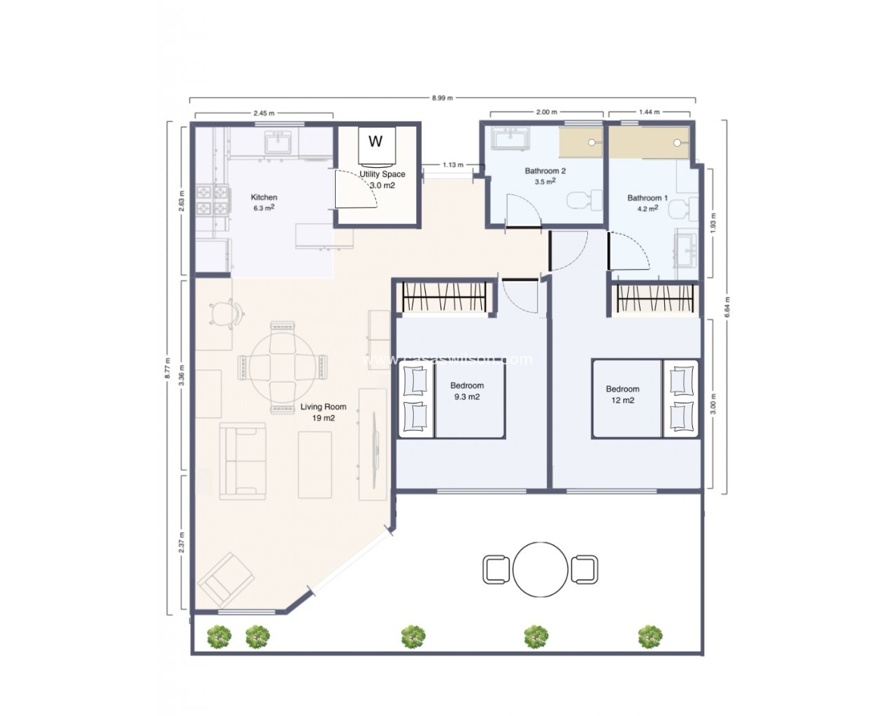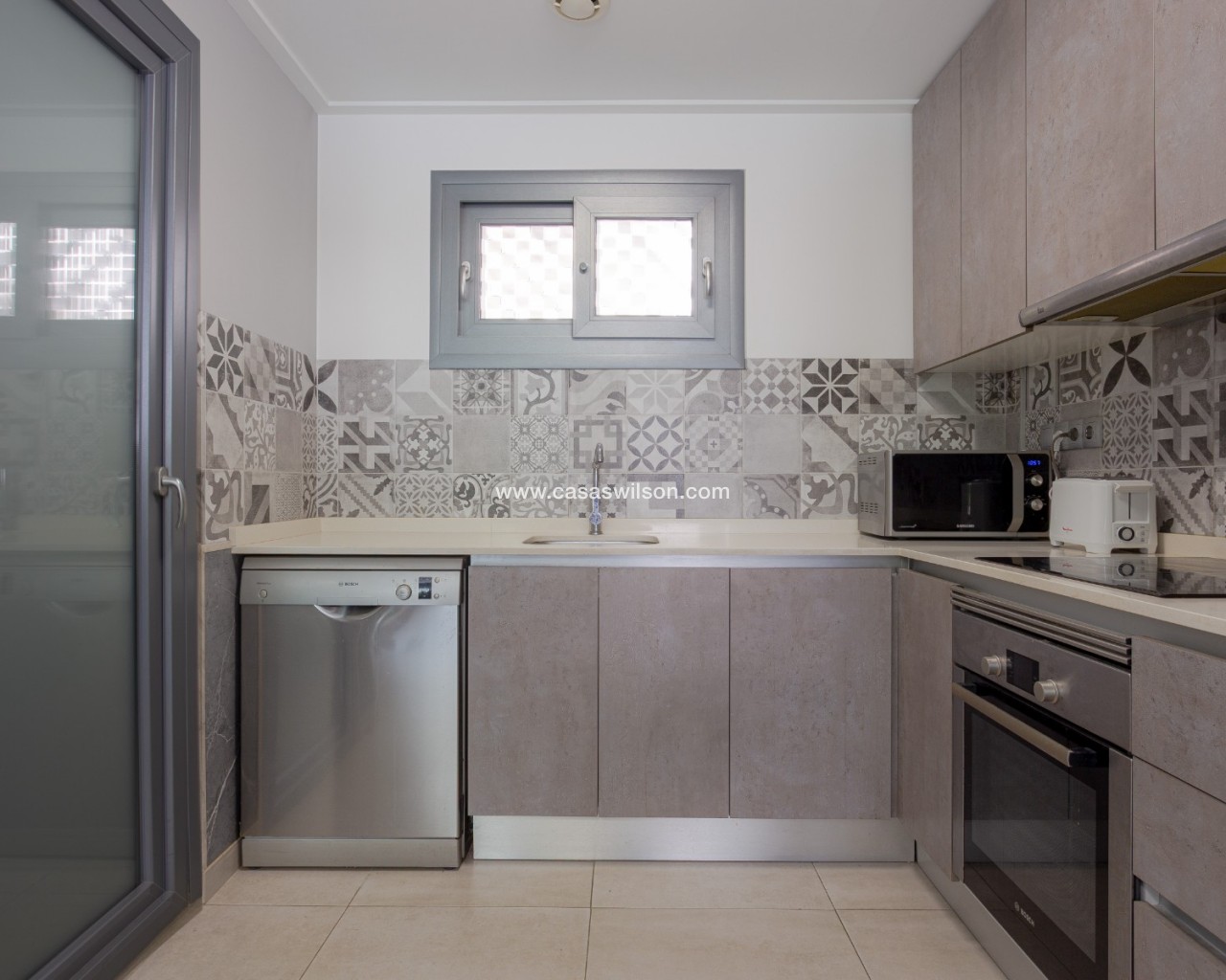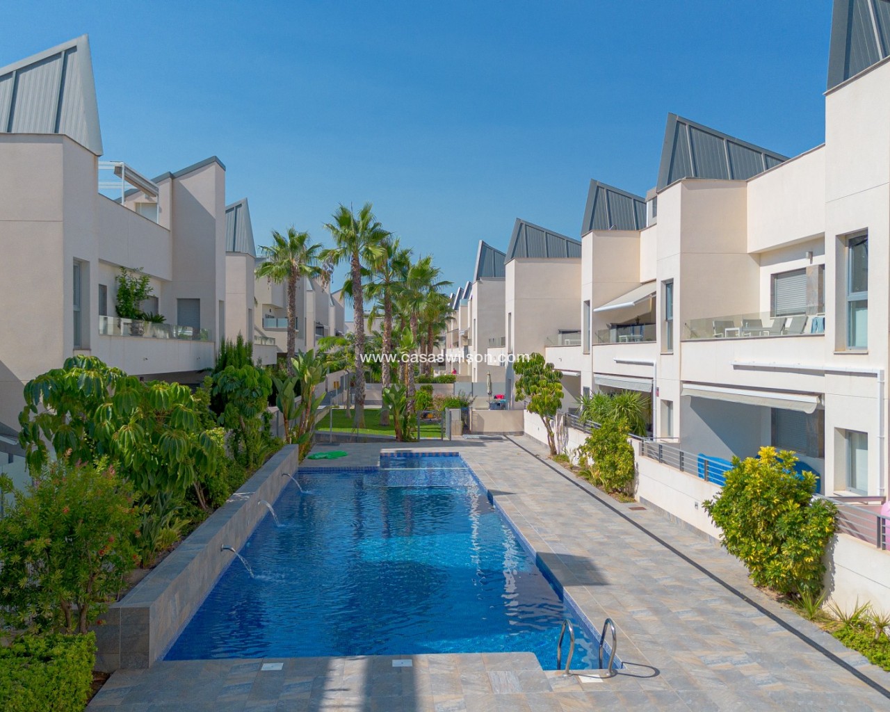 Situado en el complejo residencial Villa Amalia, entre La Veleta y Mar Azul, este apartamento en planta baja combina un diseño moderno y la proximidad al mar.La propiedad ofrece 2 dormitorios y 2 baños, uno de ellos en suite, con una superficie construida de 70 m², un luminoso salón de 20 m² y una terraza jardín orientada al suroeste de 20 m², ideal para disfrutar del sol la mayor parte del día.Construido en 2017, el apartamento incluye:Cocina abierta totalmente equipada con electrodomésticos (horno, lavavajillas, campana extractora, frigorífico, lavadora y secadora).Totalmente equipado: aire acondicionado centralizado, suelo radiante en el baño, persianas eléctricas, ventanas de doble acristalamiento y puerta de seguridad.Amueblado y listo para entrar a vivir.La residencia ofrece excelentes servicios: tres piscinas compartidas, una de ellas climatizada todo el año, gimnasio, ascensor y fibra óptica. También incluye aparcamiento privado.Su ubicación es ideal, a tan solo unos minutos andando del mar, cerca de todos los servicios y con excelentes conexiones con el centro de Torrevieja y las playas de la Costa Blanca.