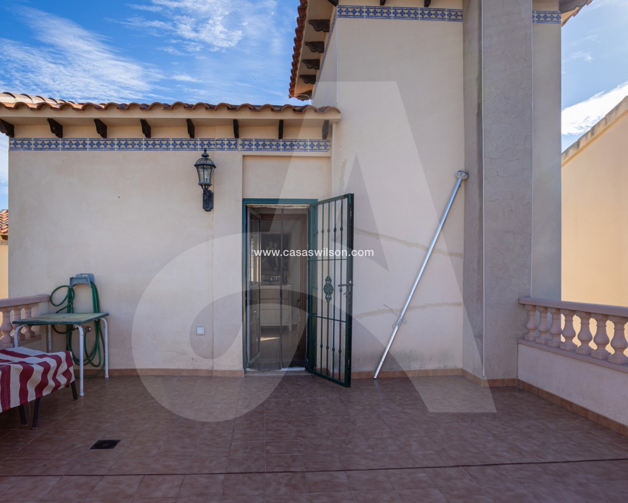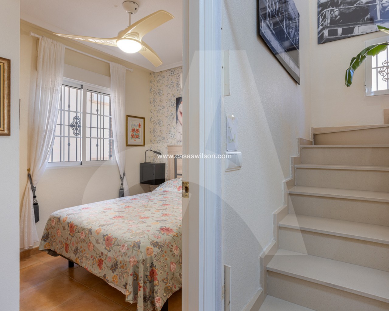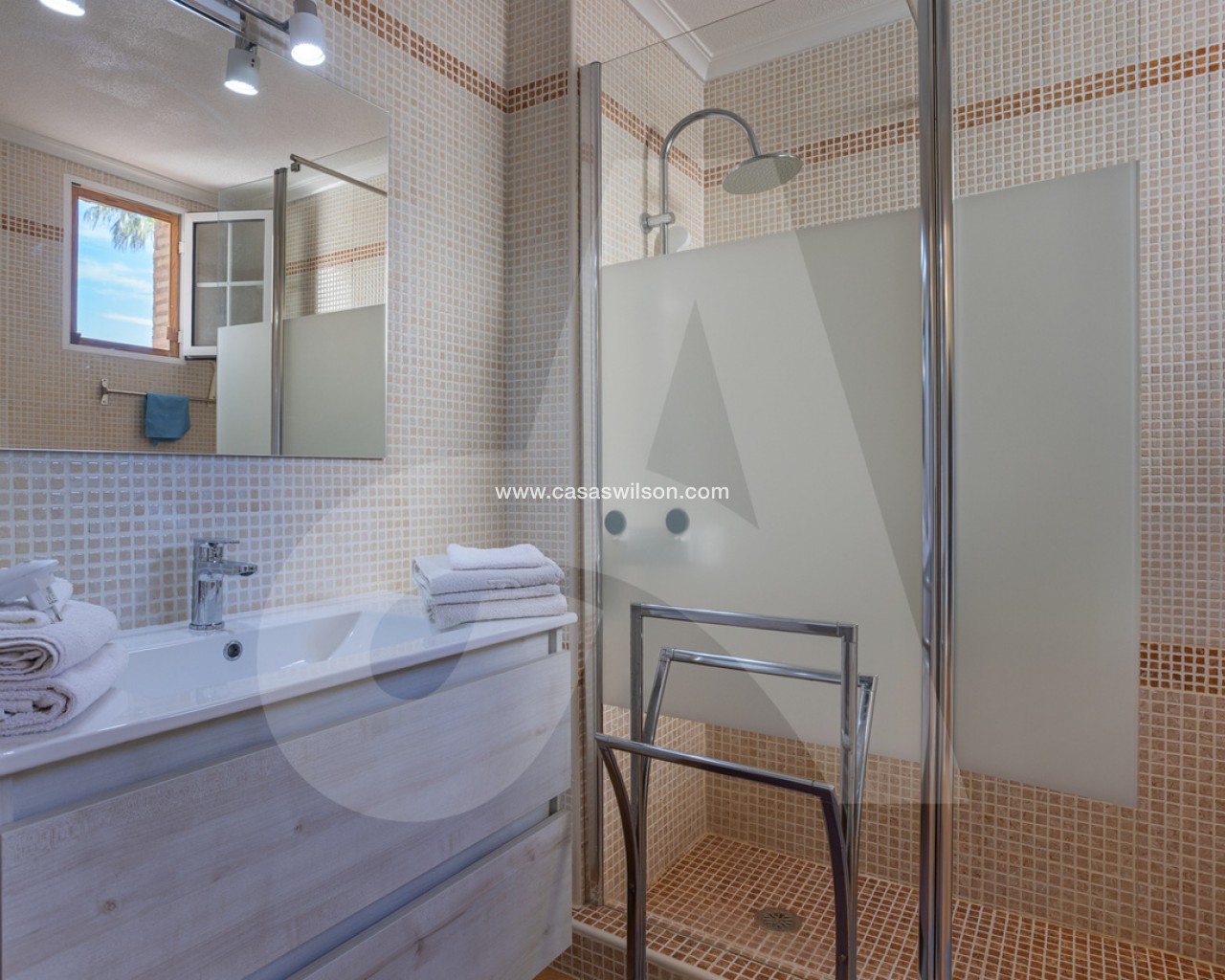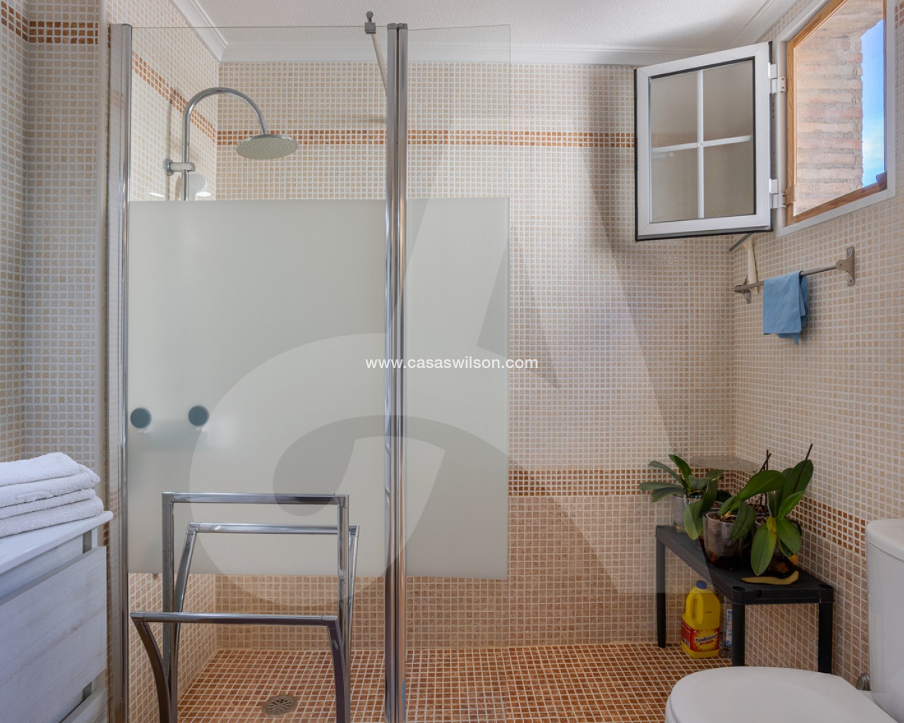 La planta superior ofrece un segundo dormitorio con vestidor (sin cama) y un cuarto de baño también renovado con ducha, lavabo e inodoro. Desde el pasillo se accede a una amplia terraza soleada, donde se puede disfrutar del sol con total privacidad.