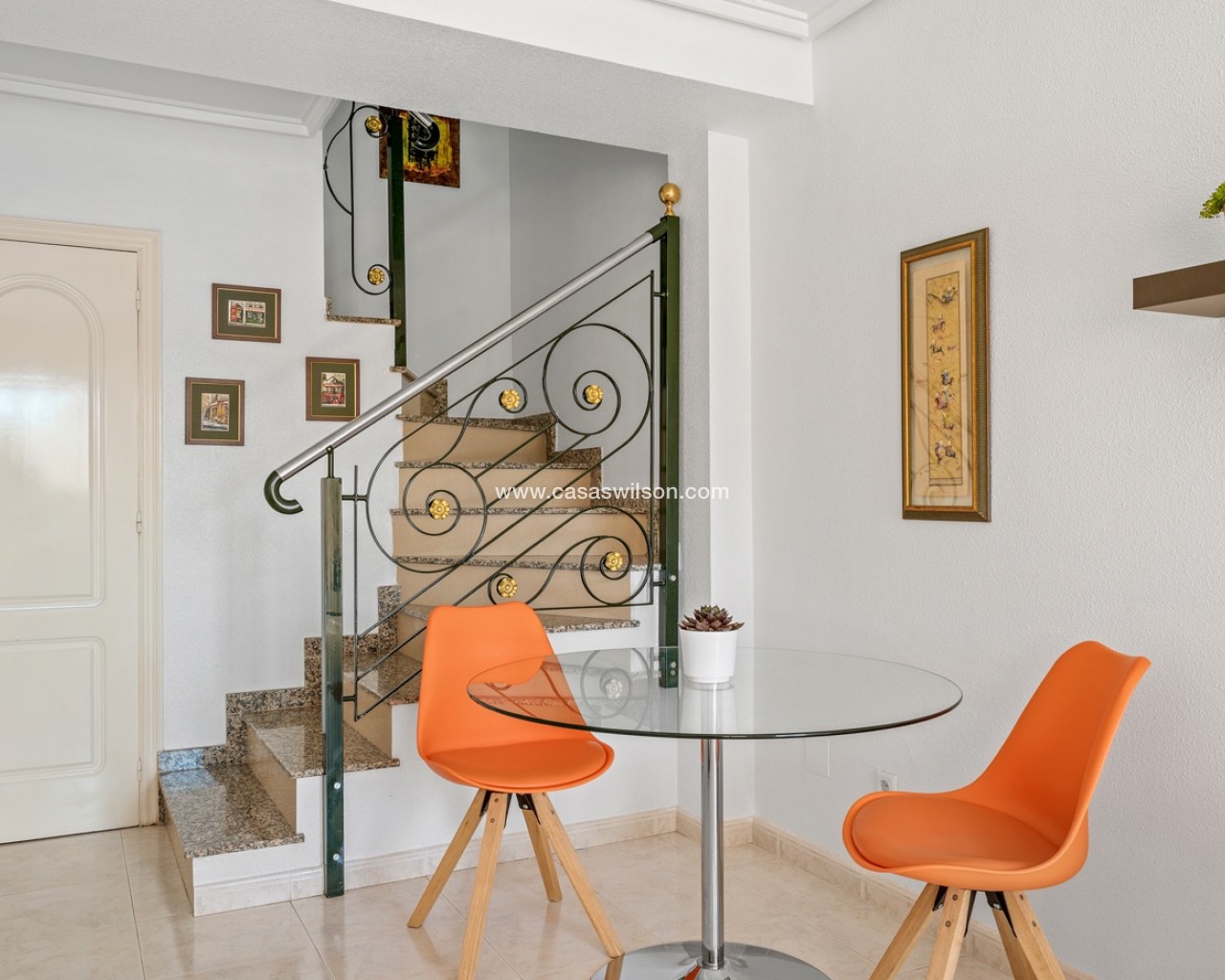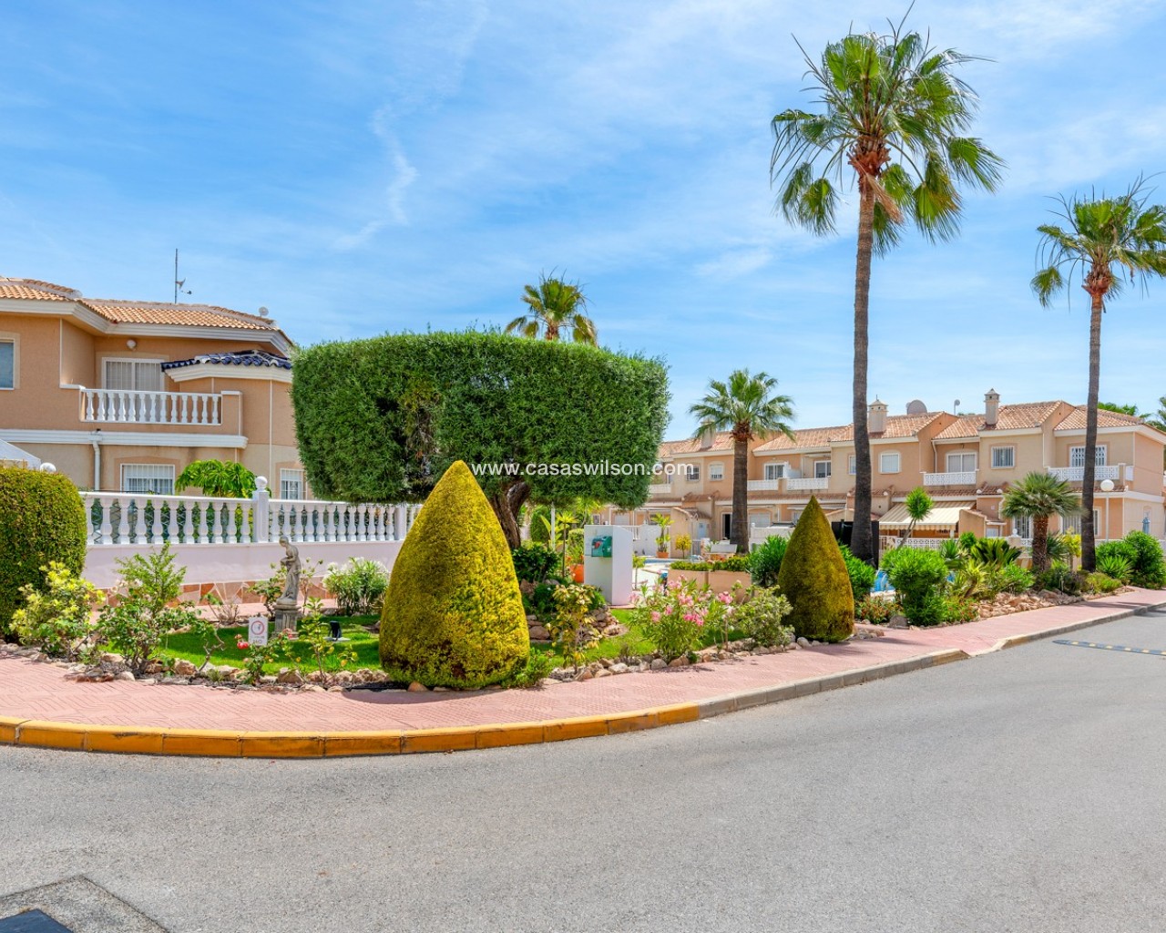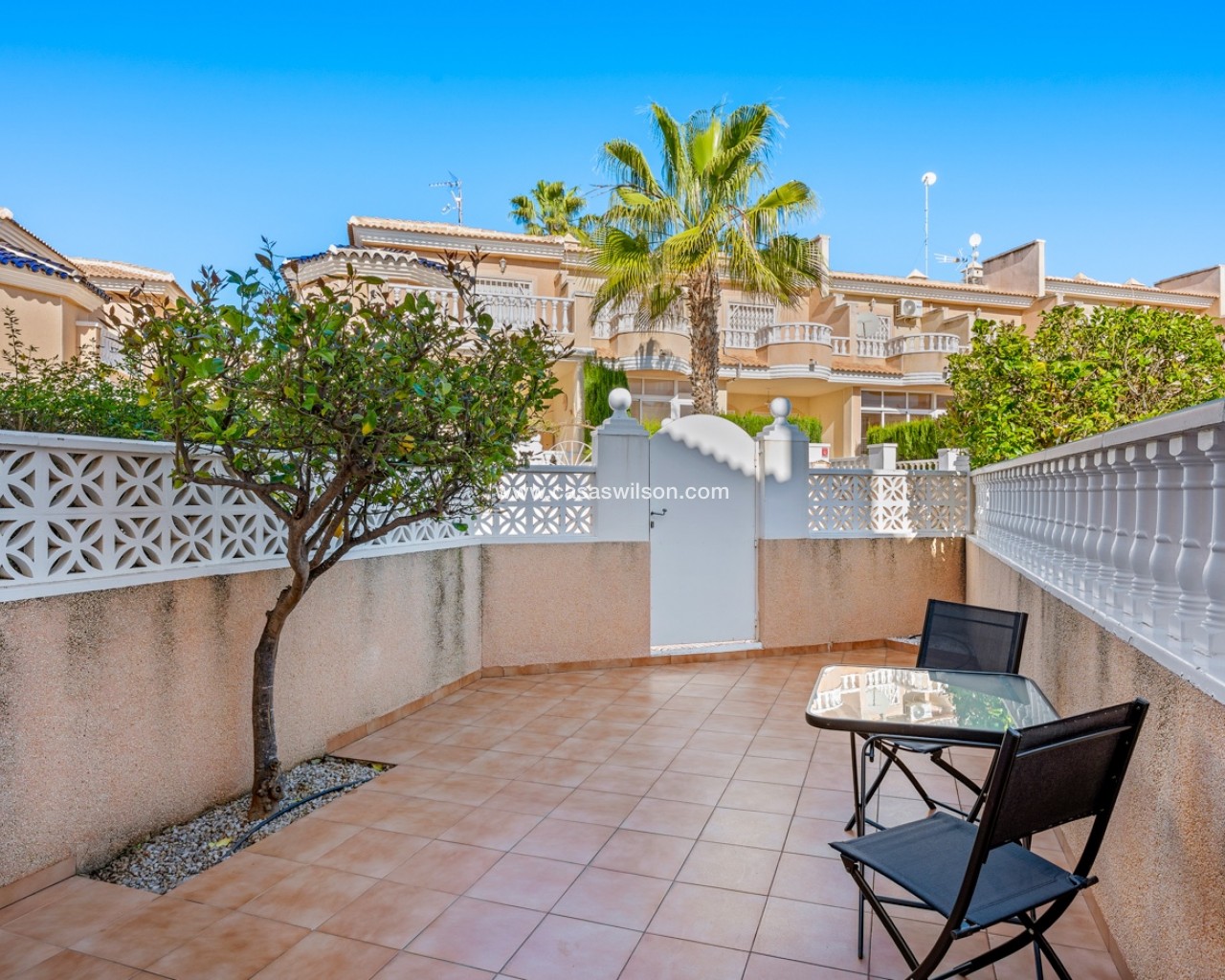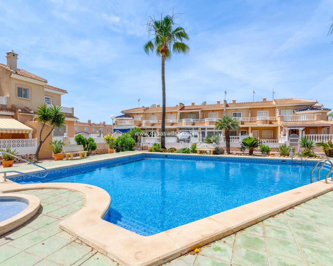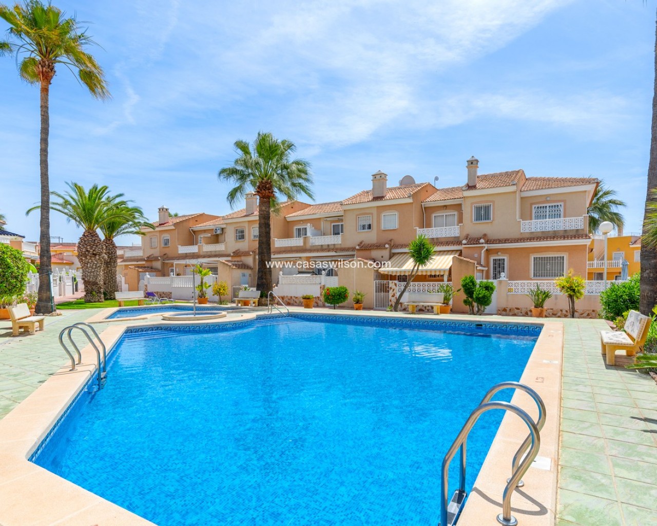 Descubre este encantador adosado en el residencial Las Palmeras, situado en Ciudad Quesada, una de las zonas más demandadas por su tranquilidad y cercanía a todos los servicios. La vivienda se distribuye en dos plantas y cuenta con dos fantásticas terrazas que permiten disfrutar del sol durante todo el día: la terraza delantera recibe el sol de la mañana, perfecta para empezar el día al aire libre, mientras que la terraza trasera ofrece sol por la tarde, ideal para relajarse o disfrutar de reuniones con familia y amigos. En la planta principal encontramos un amplio y luminoso salón, un aseo de cortesía y una cocina independiente con acceso directo a la terraza trasera, donde además hay un espacioso trastero con zona de lavandería. En la planta superior se encuentran dos dormitorios, destacando el dormitorio principal de matrimonio con acceso a una agradable terraza privada. En esta planta también se ubica el baño principal. La vivienda forma parte de una cuidada comunidad que dispone de piscina comunitaria y una plaza de aparcamiento asignada por vivienda. Su excelente ubicación permite disfrutar de la tranquilidad sin renunciar a la comodidad: a solo 10 minutos de la playa y a 5 minutos de supermercados, restaurantes y todo tipo de servicios. Una oportunidad ideal tanto como vivienda habitual o casa de vacaciones