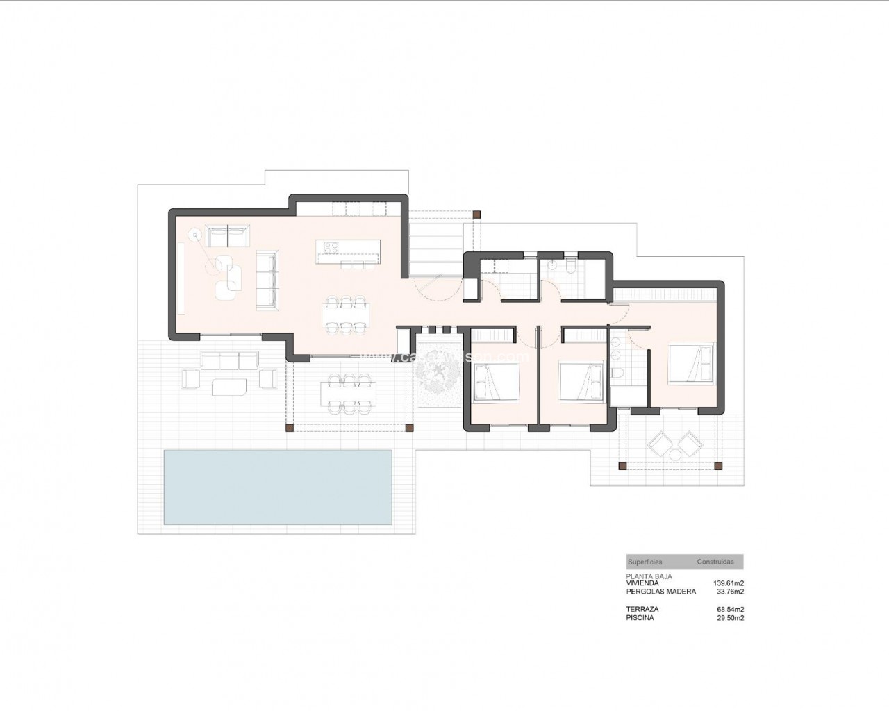 Villas de style méditerranéen à La Fustera, Benissa Costa Villas neuves exclusives dans le nord de la Costa Blanca Découvrez une opportunité exceptionnelle d'acquérir l'une des quatre maisons individuelles situées dans le prestigieux quartier de La Fustera, à Benissa Costa. Ces villas neuves allient à la perfection le style ibérique et l'élégance méditerranéenne, offrant un cadre de vie paisible à seulement 1 km de la plage de La Fustera et à quelques minutes en voiture de Calpe, Moraira et Benissa. Vivre de plain-pied sur des terrains spacieux Chaque villa est conçue pour offrir confort et commodité, avec : 3 chambres et 2 salles de bains de plain-pied Surface habitable de 139,61 m² avec un agencement ouvert Terrains privés de plus de 800 m², offrant un vaste espace extérieur Grandes terrasses (68,54 m²) avec pergolas ombragées Piscine privée (29,50 m²) idéale pour les journées ensoleillées Les maisons sont soigneusement positionnées pour garantir intimité et tranquillité, entourées d'une végétation luxuriante qui crée un véritable havre de paix méditerranéen. Une architecture inspirée d'Ibiza Avec ses lignes épurées, ses volumes cubiques et l'utilisation de matériaux naturels tels que le bois et la pierre, le design reflète le caractère serein et sophistiqué d'Ibiza. Chaque élément a été conçu pour s'intégrer harmonieusement à l'environnement, créant une atmosphère chaleureuse et intemporelle à l'intérieur comme à l'extérieur. Confort et efficacité énergétique Les villas sont construites selon les normes les plus strictes, en utilisant des techniques de construction écoénergétiques et des finitions de qualité. Les intérieurs spacieux et lumineux s'ouvrent sur les terrasses extérieures, vous permettant de profiter du climat méditerranéen toute l'année. Emplacement stratégique à proximité de toutes les commodités Situé dans un quartier résidentiel peu dense, ce complexe offre un équilibre parfait entre nature et accessibilité. Les points d'intérêt à proximité comprennent : Plage de La Fustera – 1 km Centres-villes de Calpe, Moraira et Benissa – 8 à 10 km Club de Golf Ifach – 7 km Marina de Moraira – 8 km Aéroport d'Alicante – 84 km Centre commercial La Marina (Ondara) – 35 km Votre maison méditerranéenne idéale vous attend Que vous recherchiez une résidence permanente, une maison de vacances ou un bien d'investissement, ces villas à La Fustera offrent une combinaison imbattable entre emplacement, qualité et design. Contactez-nous dès aujourd'hui pour en savoir plus ou pour organiser une visite de ce projet immobilier exclusif.