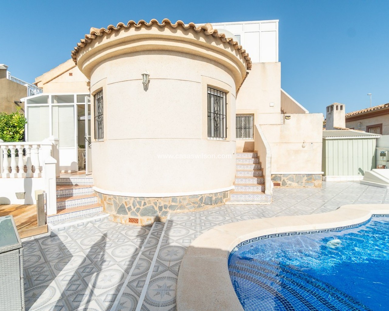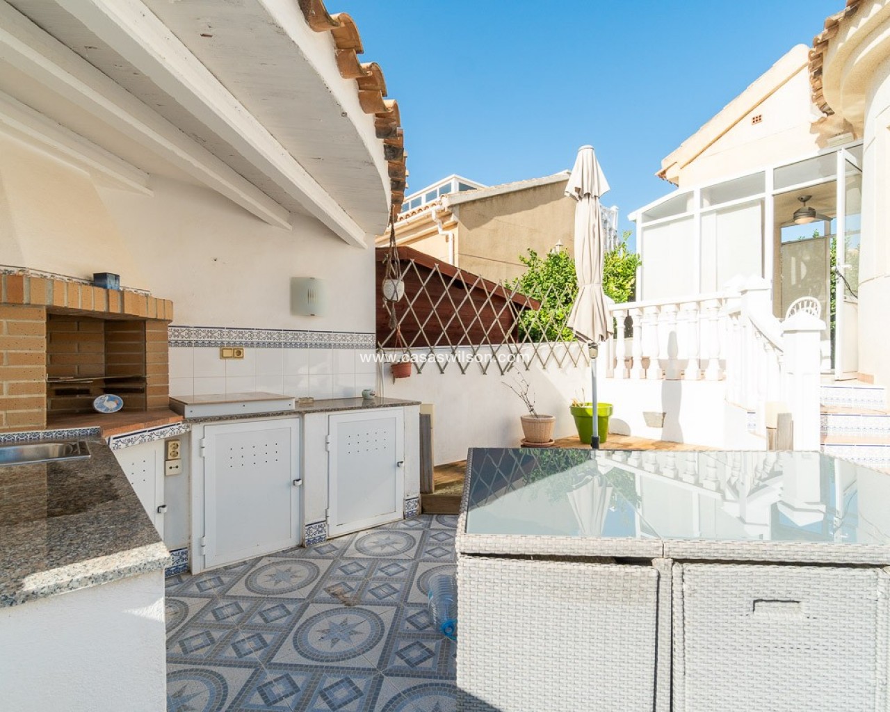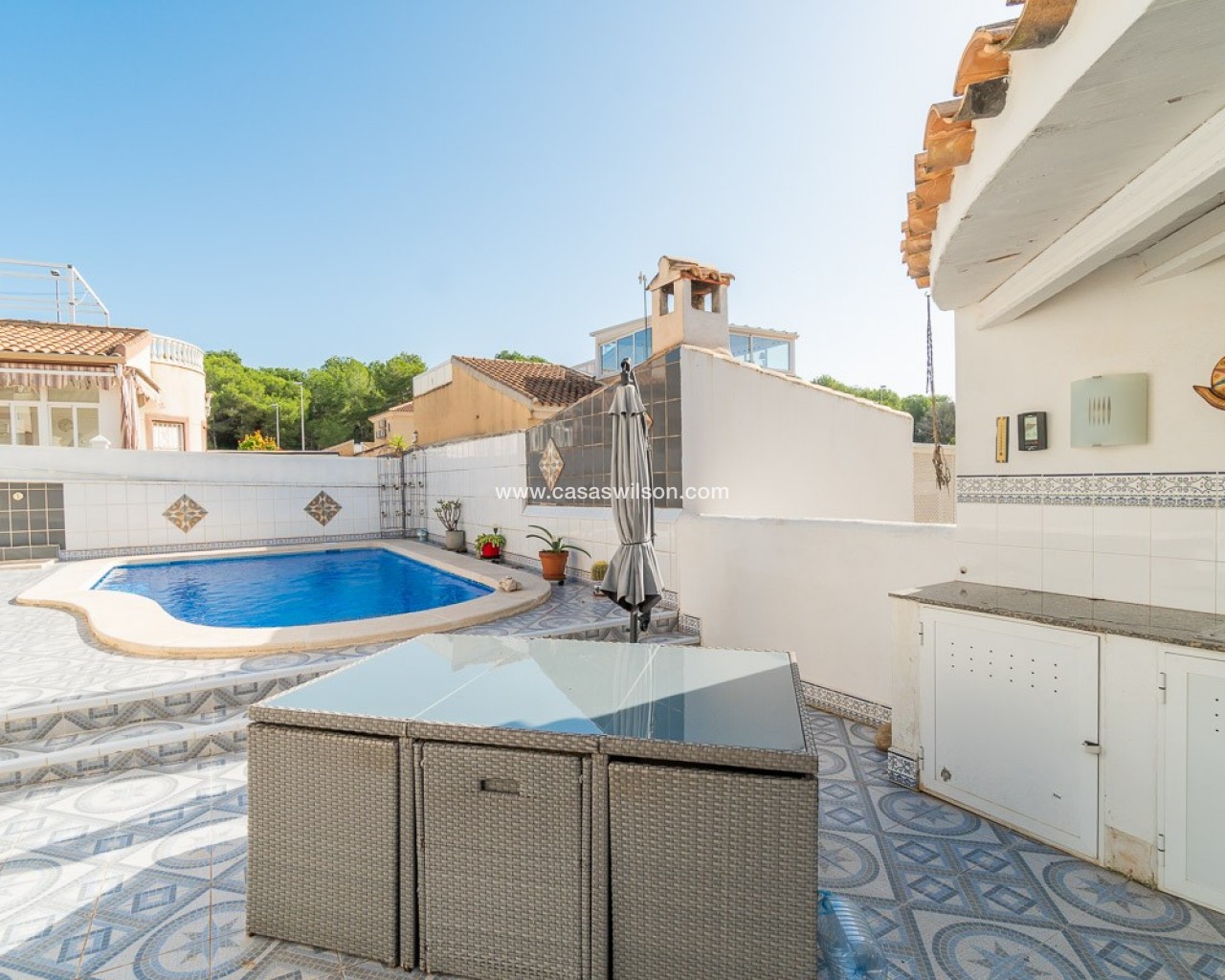 OPPORTUNITE A SAISIR ! A Pinar de Campoverde - dans un quartier calme, proche des commerces et services - dans un cadre verdoyant, à 20 minutes des plages. - à 10 minutes de la petite ville de Pilar de la Horada, connue pour son charme et son folklore typiquement espagnols - à 3km du splendide golf du Romero DESCRIPTION - Véranda pour de profiter de la luminosité hiver comme été - Living - Cuisine équipée - 3 chambres - 1 salle de bain - Sur le solarium, une 4ème chambre a été aménagée - Cuisine extérieure - Buanderie - Espace pour garer son véhicule en site propre - Terrain de 250m2 joliment fleuri - Piscine récemment rénovée - WC supplémentaire à l'extérieur