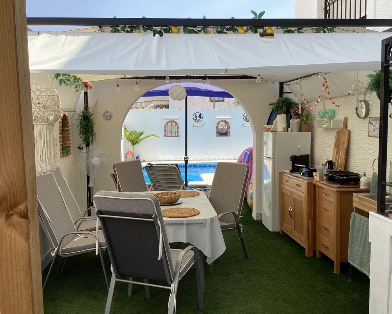 Bienvenue dans votre villa de style Ibiza avec piscine privée, sous le soleil de Los Altos. Los Altos est un quartier résidentiel prisé, à quelques minutes de la côte et de la ville animée de Torrevieja. Cette magnifique maison quadruple, exposée sud-est et entièrement rénovée, offre une luminosité abondante, une sensation d'espace et une vue imprenable sur les lacs salés au loin. 3 chambres doubles spacieuses, chacune avec placards et climatisation individuelle. 2 salles de bain, dont une salle de bain familiale entièrement rénovée au premier étage. Salon et salle à manger spacieux avec climatisation — parfait pour se détendre ou socialiser. Cuisine séparée entièrement rénovée, moderne et meublée de manière pratique. Chambre et salle d'eau au rez-de-chaussée – idéal pour des invités ou une vie de plain-pied. Espace terrasse agrandi, en partie équipé de parois vitrées pour profiter de l'extérieur toute l'année. Grand jardin avec piscine privée, chauffée par des panneaux solaires respectueux de l'environnement. Cuisine extérieure sous un joli gazebo, parfaite pour les dîners d'été. Dream Hills possède une belle communauté avec des terrains de sport, de pétanque, de tennis de table, un court de tennis et un centre de fitness en plein air. Los Altos est un quartier résidentiel populaire et calme au sud de Torrevieja , sur la Costa Blanca Sud . Ce quartier est réputé pour son atmosphère méditerranéenne, ses lotissements bien entretenus et ses excellentes prestations. À seulement 5 minutes en voiture de Punta Prima et de la côte, avec de belles plages et des chiringuitos confortables. A proximité des centres commerciaux tels que La Zenia Boulevard, des supermarchés, des restaurants et des installations médicales. Bonne accessibilité via la N-332 et l'AP-7, avec l'aéroport d'Alicante à seulement 40 minutes. Emplacement calme, mais proche de la vie urbaine animée de Torrevieja. Idéal pour ceux qui recherchent une combinaison de détente, de soleil et de confort – toute l’année. Cette maison exceptionnelle allie confort, style et facilité d'utilisation dans un ensemble parfait. Envie de découvrir l'espace, les finitions et l'atmosphère unique de ce bien ? Contactez-nous pour planifier une visite. C'est une occasion à ne pas manquer. Communauté de VVE : 205 € / An