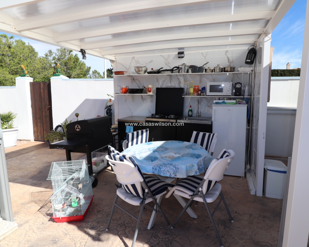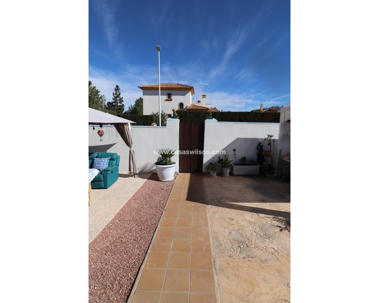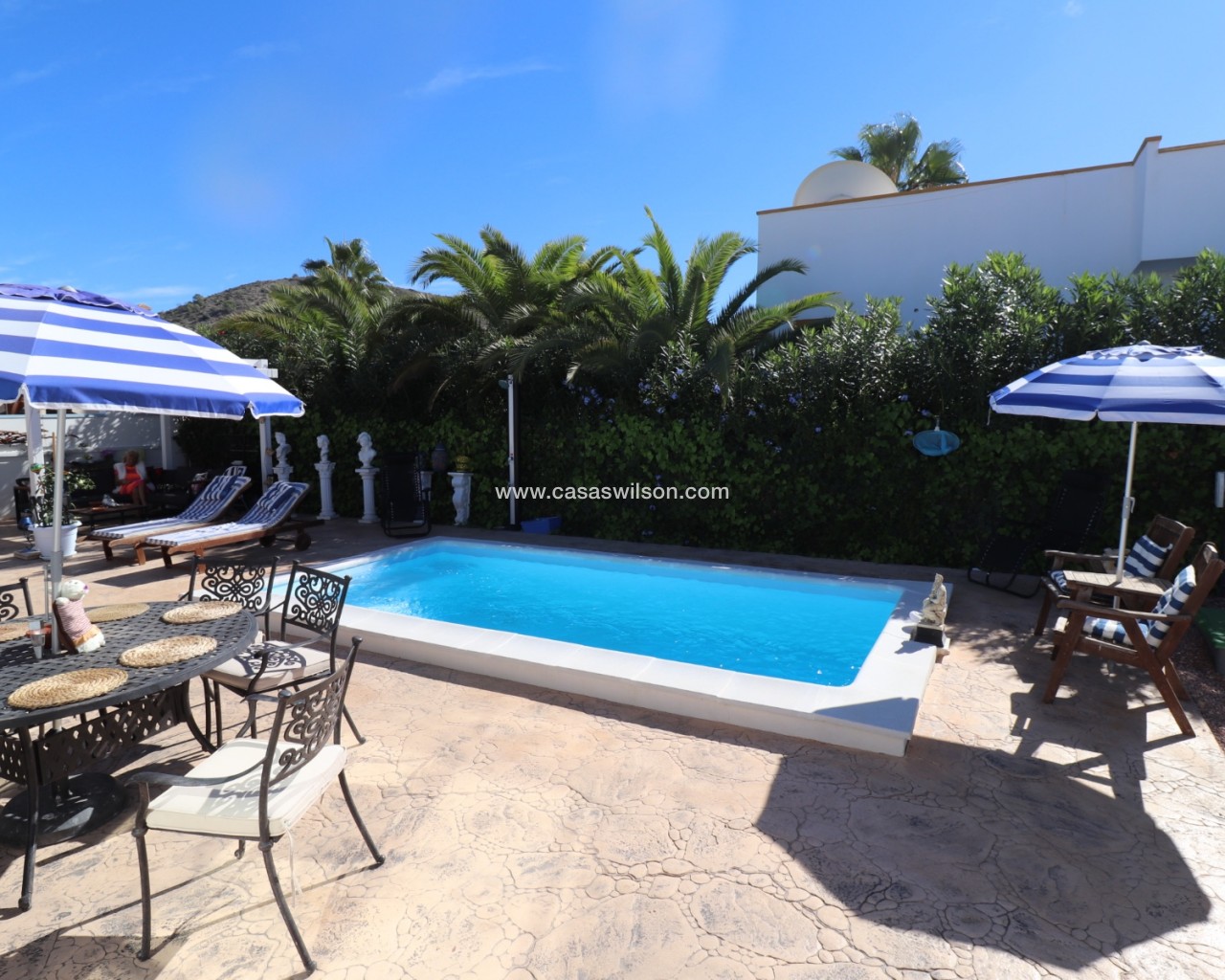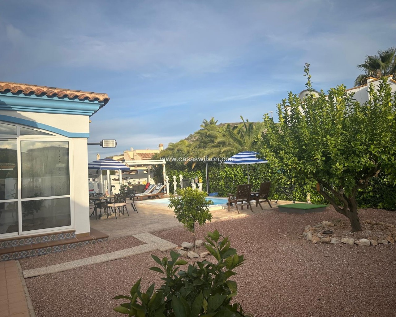 Cette belle villa en parfait état est située dans un quartier résidentiel très tranquille entre les deux villages de Hondon avec toutes les commodités. Elle se compose 'une spacieuse véranda donnant sur la piscine et le jardin, d'un living avec cuisine ouverte, de 2 chambres et de 2 salles de bain. Un solarium offre de superbes vues sur les montagnes environnantes. Le jardin a été aménagé avec soin et dispose d'une piscine, de plusieurs terrasses ombragées, d'une cuisine d'été, d'un parking pour 2 voitures, d'un abri de jardin et de mombreuses fleurs et arbres fruitiers. La maison sera vendue entièrement meublée à l'exception de la télévision, d'un ensemble de jardin et d'un distributeur d'eau. A 35 minutes de l'aéroport d'Alicante et des plages.