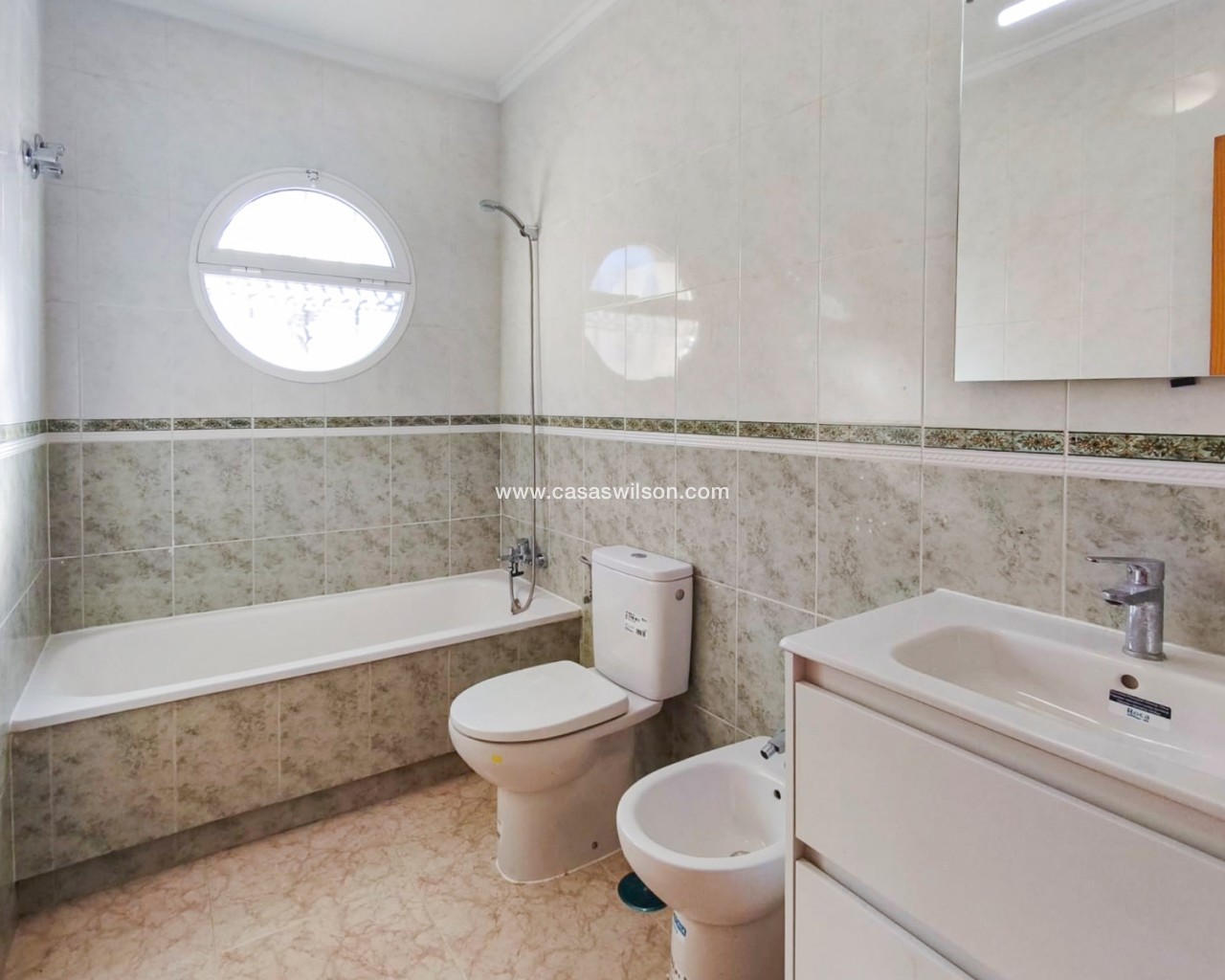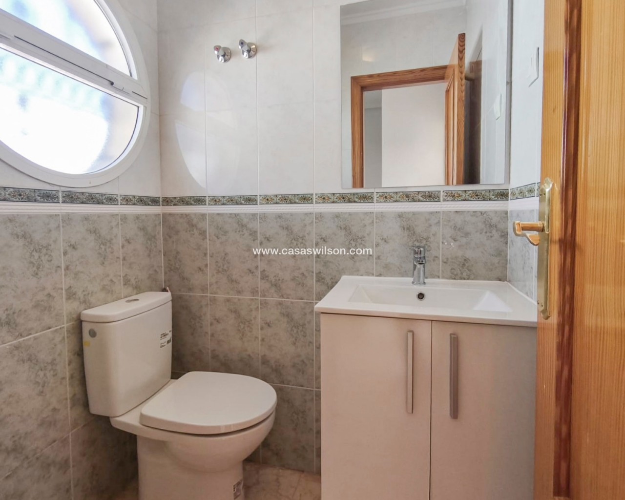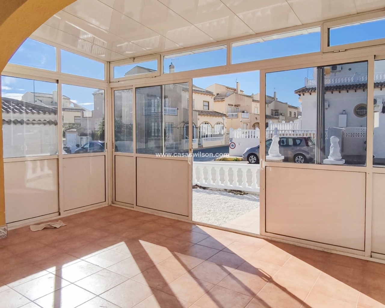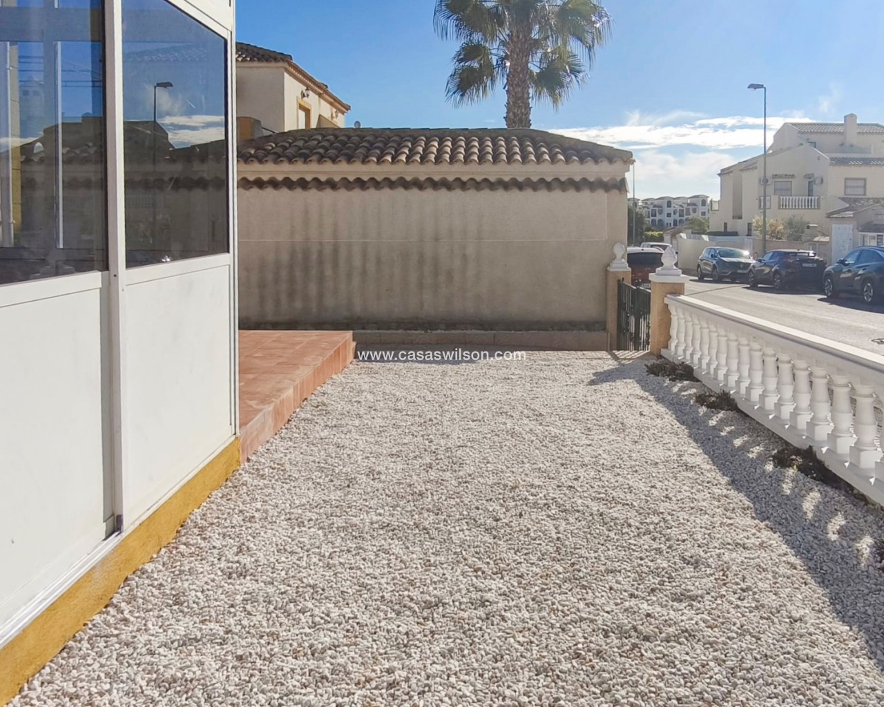 Ce superbe bungalow est situé à Orihuela Costa, au sein du résidentiel Serena V, une zone offrant une large gamme de services, supermarchés, restaurants, bars et espaces de loisirs, avec une ambiance animée toute l’année. La propriété est très lumineuse et dispose de deux accès à la parcelle privée, un accès piéton et un accès pour véhicules. Le porche d’entrée est entièrement fermé par une structure métallique, offrant un espace supplémentaire très pratique. Le rez-de-chaussée comprend un salon-salle à manger, une cuisine indépendante avec galerie, une salle de bain complète et deux chambres, dont une avec placard intégré. Un débarras attenant à la construction, avec accès indépendant depuis la parcelle, complète l’ensemble. À l’étage supérieur, accessible par un escalier intérieur, se trouvent une salle de bain et une chambre avec placard intégré, reliée à un grand balcon et à une vaste terrasse solarium d’environ 39 m². La résidence dispose d’une piscine commune et d’espaces communs bien entretenus. La surface construite est de 75,98 m², à laquelle s’ajoutent 39,19 m² de solarium et un jardin à l’avant.