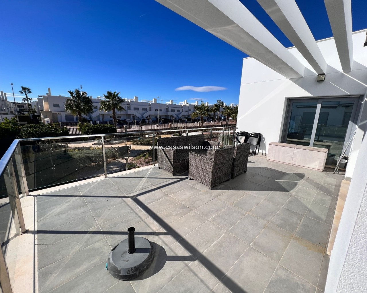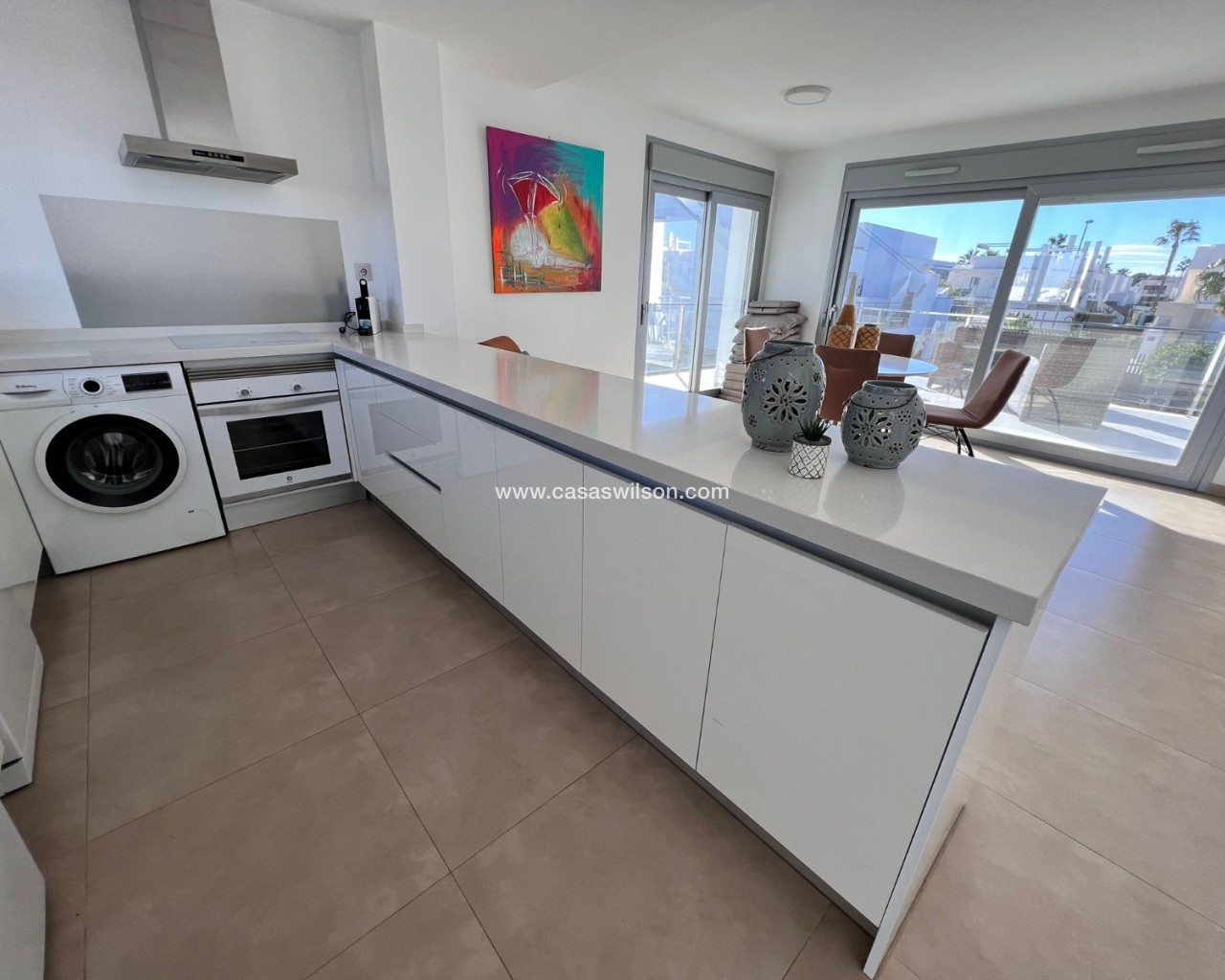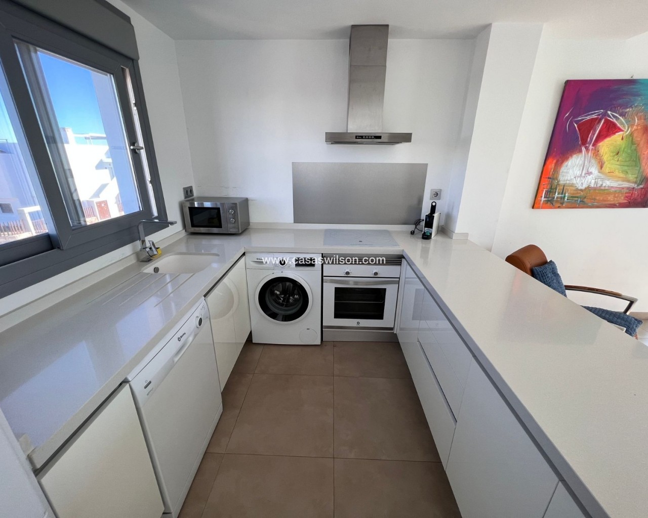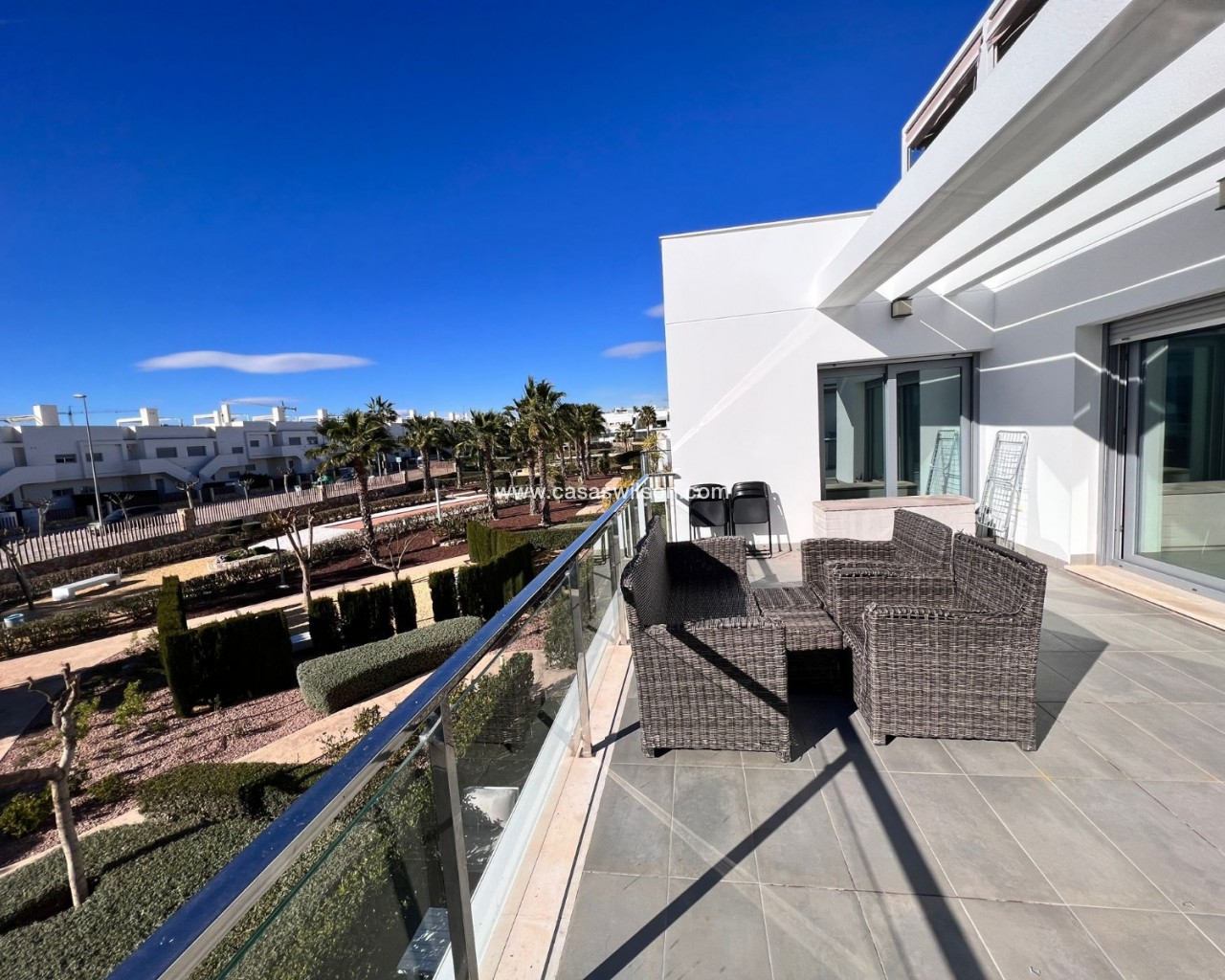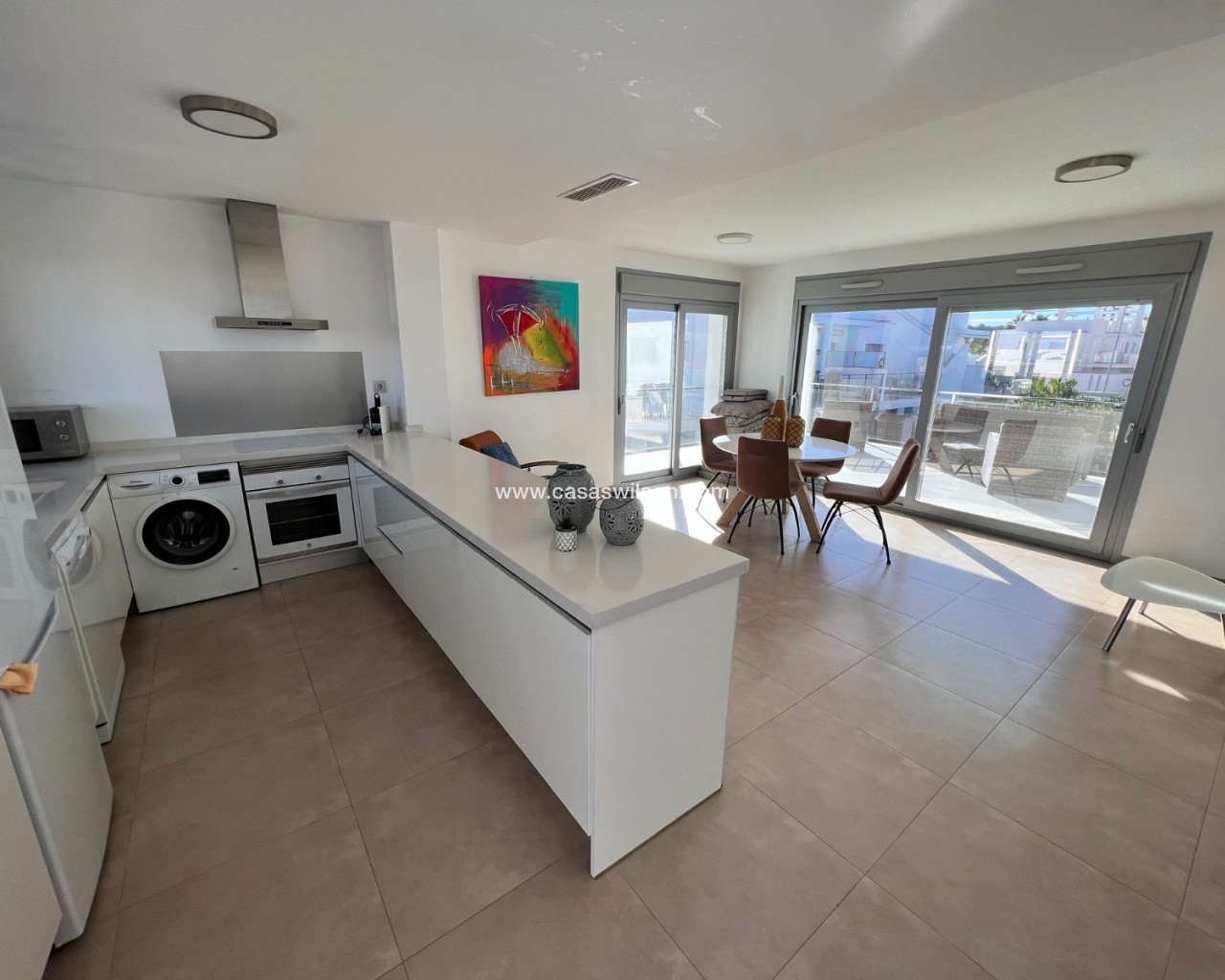 Découvrez ce magnifique appartement au premier étage, idéal comme résidence principale, résidence secondaire sur la côte ou investissement judicieux. D'une superficie de 83 m², ce bien se distingue par son agencement optimal, sa luminosité exceptionnelle et son état impeccable : prêt à emménager. L'appartement offre un séjour/salle à manger spacieux et accueillant, ouvert sur une cuisine américaine moderne et entièrement équipée. Cet espace lumineux et aéré crée une atmosphère confortable et fonctionnelle, idéale pour partager des moments conviviaux en famille ou entre amis. Il comprend deux chambres doubles avec placards intégrés, conçus pour optimiser le rangement, et deux salles de bains complètes, dont une attenante, pour un confort et une intimité absolus. L'orientation sud-ouest garantit une excellente luminosité naturelle tout au long de la journée, créant une ambiance chaleureuse et accueillante. De plus, vous pourrez profiter du climat méditerranéen sur la terrasse et le solarium privatifs, espaces parfaits pour se détendre, bronzer ou partager des moments en plein air. Une terrasse spacieuse, accessible depuis le séjour, donne accès à l'escalier menant au solarium. Ici, vous découvrirez un magnifique espace comprenant un superbe jacuzzi et une vaste terrasse avec coin repas et salon de jardin. Caractéristiques principales : 83 m² habitables 2 chambres | 2 salles de bainCuisine américaine entièrement équipée Meublé et électroménager inclusPiscine communeParking privéPorte blindéeInterphone2 placards intégrésTerrasse et solarium Excellent état Emplacement privilégié : À seulement 20 minutes des plagesÀ 5 minutes du golfÀ 10 minutes des commerces et servicesÀ 40 minutes de l'aéroport Situé dans un quartier calme et bien desservi, cet appartement allie confort, emplacement idéal et qualité de vie dans un cadre méditerranéen exceptionnel. Une occasion unique de profiter du soleil, de la mer et de la tranquillité tout au long de l'année.