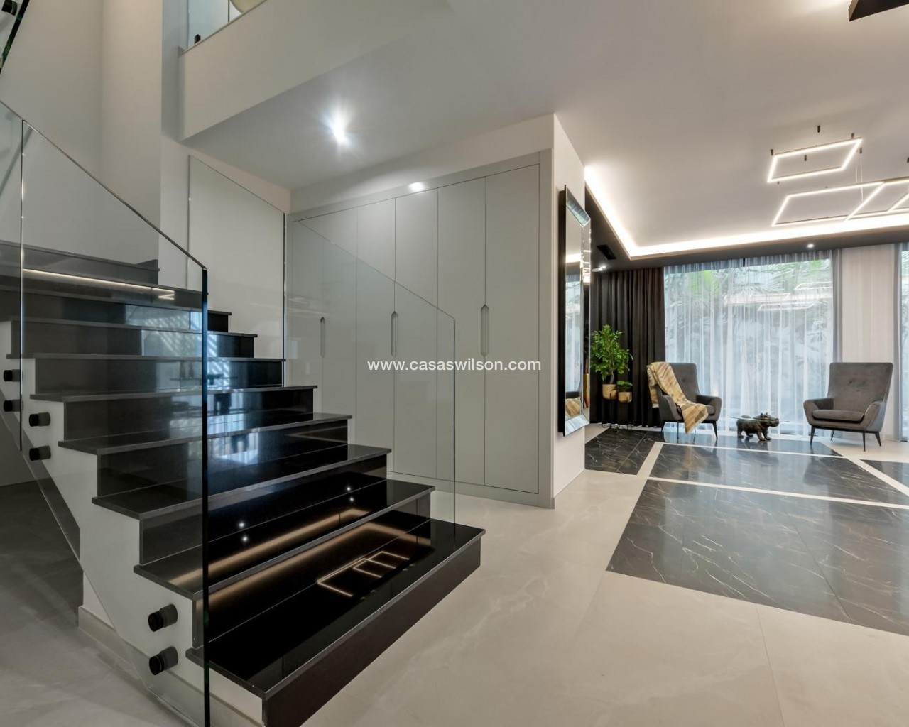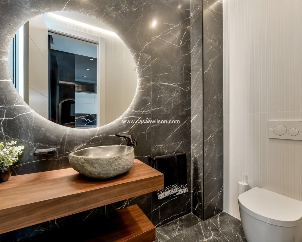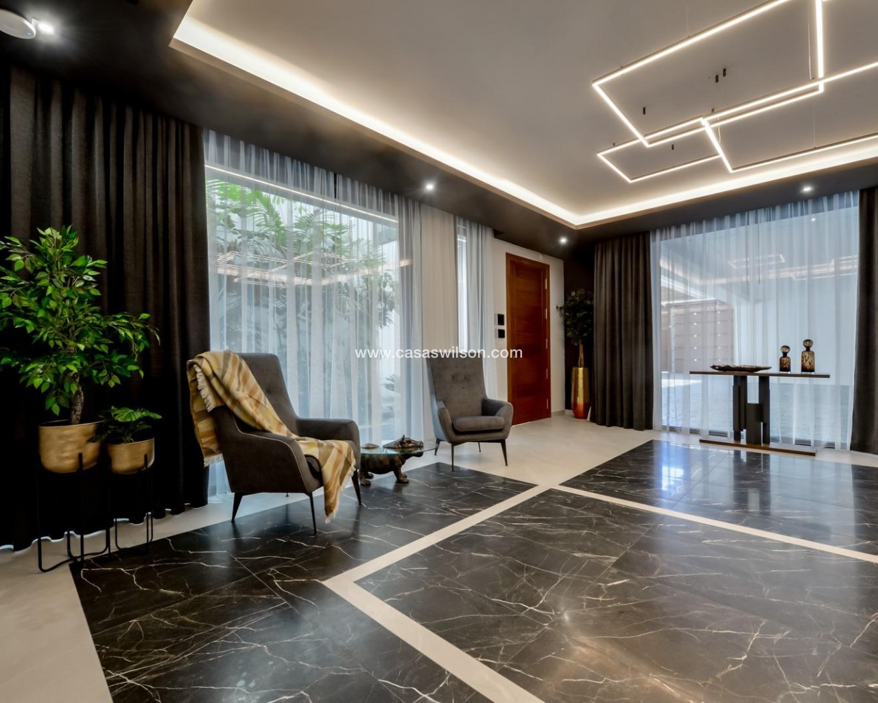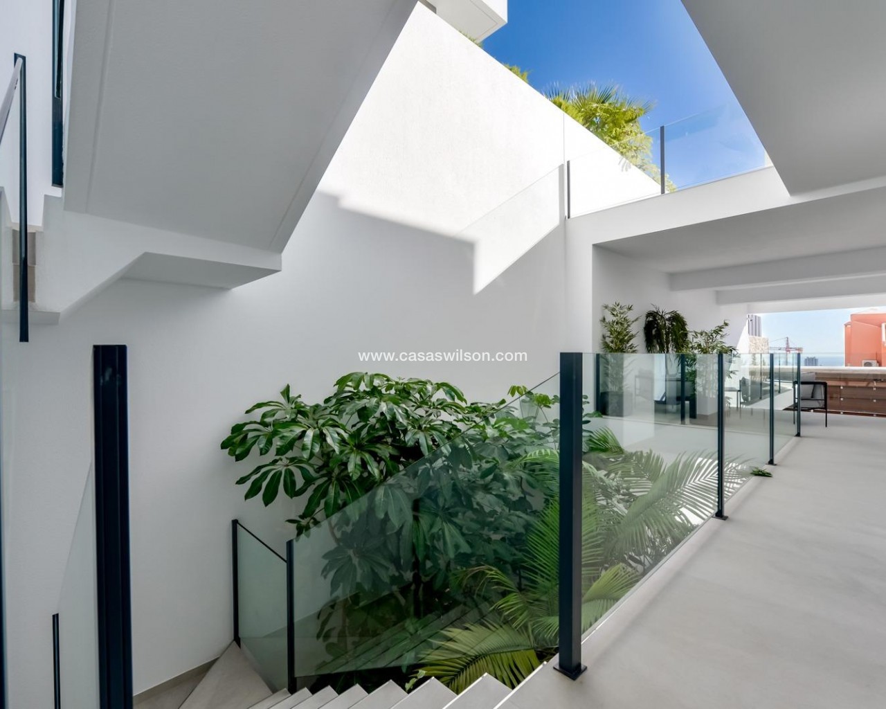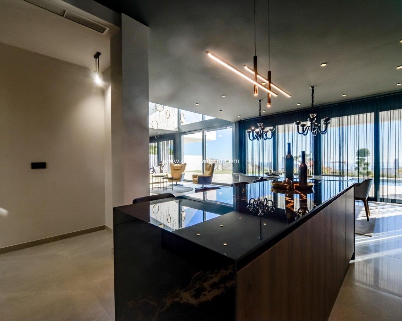 VILLA DE LUXE NEUVE A FINESTRAT AVEC VUE SUR LA MER Nouvelle construction d'une villa de luxe avec vue sur la mer à Sierra Cortina, Finestrat. En arrivant à l'urbanisation, il y a un mur en pierre naturelle d'une hauteur de 7 mètres et les portes d'accès automatiques à la villa qui arrivent au garage couvert au niveau de la rue avec double hauteur, lumière naturelle et jardin avec des palmiers de différentes hauteurs de 180 m2, une salle vitrée de 78 m2 avec ascenseur, escalier intérieur, vestiaire et assez d'espace pour mettre des fauteuils, convertir cet espace en un bureau ou simplement une salle d'attente pour les visiteurs. L'étage suivant de 190 m2 d'espace clos est situé au-dessous du niveau du terrain mais à 3 mètres au-dessus du niveau de la rue et bénéficie donc de la lumière naturelle. On peut y accéder par l'ascenseur ou l'escalier à l'intérieur de la villa, ou par l'escalier à l'extérieur du garage, dans ce dernier cas on ne peut accéder qu'aux couloirs extérieurs, à la salle des installations ou à la porte principale de cet étage, ce qui permet d'effectuer l'entretien de la maison sans avoir besoin d'entrer à l'intérieur de la maison. À l'intérieur de cet étage, on trouve 4 chambres spacieuses, un salon avec patio anglais de 17 m2 avec l'escalier menant au terrain, une buanderie, 2 salles de bain, des couloirs extérieurs de 40 m2 et une salle d'installations. Lorsque nous montons à l'étage principal par 3 voies d'accès, nous voyons un salon de 130 m2 avec double lumière, une cuisine ouverte, des toilettes invités, des vues panoramiques sur la mer, et une piscine de 54 m2 en stratifié, un beau jardin et 2 grandes terrasses couvertes. A l'étage des chambres on accède par ascenseur ou escalier intérieur où l'on trouve une chambre de maître de plus de 50 m2 avec salle de bain en-suite, dressing et terrasse, deux chambres d'environ 20 m2 chacune, une salle de bain et la terrasse pour ces chambres. La villa est équipée de Led à l'extérieur et à l'intérieur, chauffage au sol, domotique, cristaux Gamma élevés, climatisation centralisée, stores automatiques, hauts plafonds et bien plus encore : Salon - 95 m2 Chambres à coucher - 8 (principale 52 m2 et secondaire 20 m2) Salles de bains - 5 Terrain- 890 м2 Bâti- 998 м2 Piscine- 12 X 5 Quatre étages Jardin (20 m2) - entièrement aménagé avec système d'irrigation automatique Ascenseur (Otis) à l'intérieur de la maison Chauffage par le sol Domotique (contrôle de la climatisation, du chauffage au sol, de l'éclairage intérieur et extérieur, des stores) Stores électriques Lumières extérieures et intérieures de marque Siemens Hauts plafonds jusqu'à 3,20 m de hauteur Vue impressionnante sur la mer Un étage pour les invités Chauffage aérothermique Cuisine entièrement équipée avec îlot Armoires encastrées Sol en carreaux de porcelaine Mur en pierre naturelle sculptée à la main Garage pour 4 véhicules avec portes automatiques 160 m2 + hall d'entrée 78 m2 Parking ouvert 37 Villa située dans le complexe touristique Sierra Cortina, à proximité de deux terrains de golf, de parcs à thème, d'un grand centre commercial et à quelques minutes des plages de Benidorm. Finestrat est situé dans la région Marina Baixa de la Costa Blanca, à proximité de Benidorm et à environ 40 kilomètres de la ville d'Alicante et de l'aéroport international. Le village est situé sur le flanc de la montagne Puig Campana et offre de belles vues sur les montagnes, la côte et la mer Méditerranée.