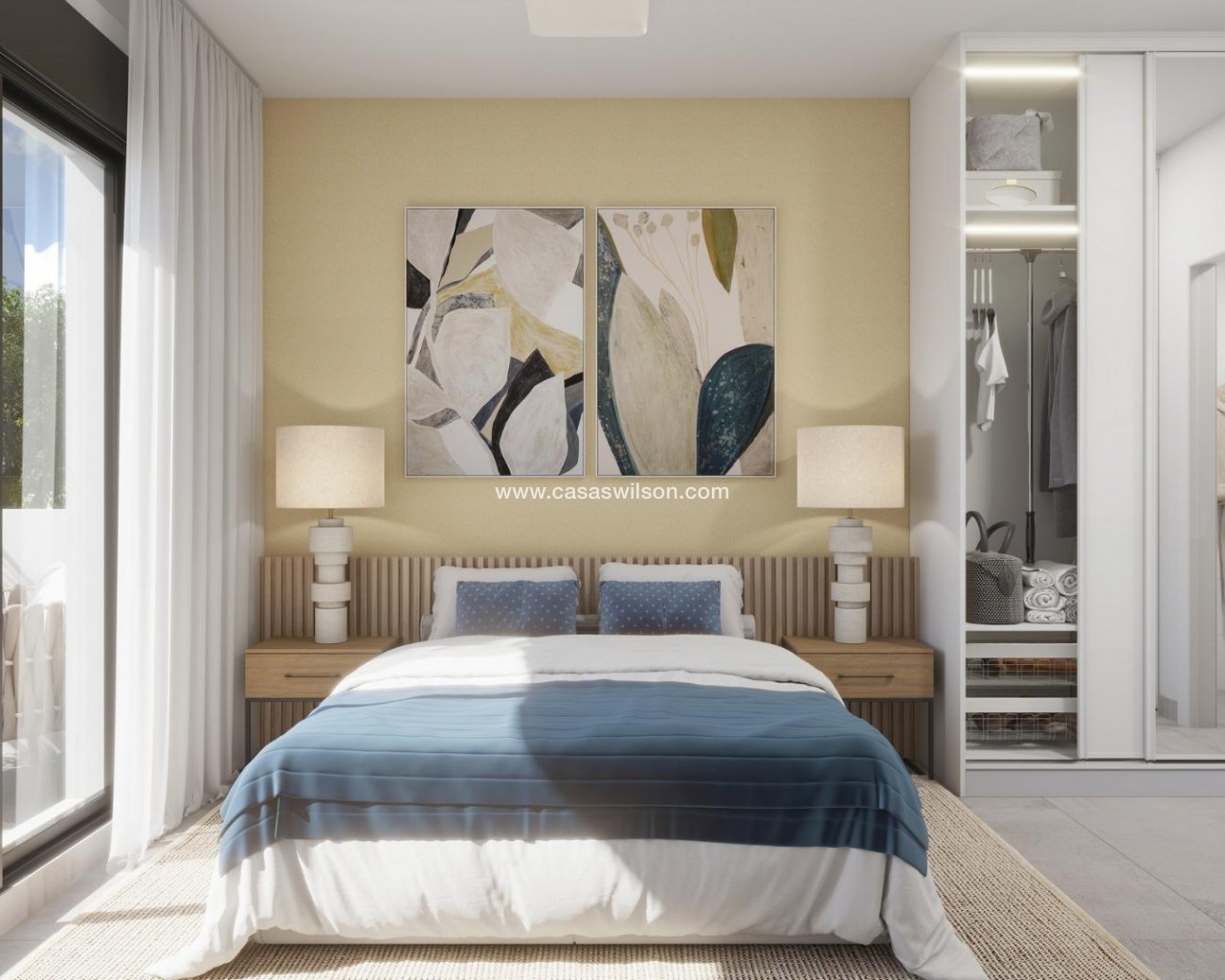 NIEUWBOUW VILLA'S IN LOS ALCAZARES Nieuwbouwproject van 12 exclusieve vrijstaande villa's, elk met een privézwembad en solarium op het dak, gelegen op slechts 150 meter van het prachtige strand van Los Narejos en op slechts 2 minuten lopen van de bruisende Rio Nalon-strip met zijn vele bars en restaurants. Signature huizen, gebouwd volgens de hoogste standaard op een van de beste locaties op de Mar Menor. Alle villa's hebben meer dan 120m2 woonoppervlak plus een privétuin van meer dan 100m2, met off-road parking op het perceel en een privézwembad van 6m x 3m met zonneplateau. Alle witgoed inbegrepen: koel-vriescombinatie, oven, magnetron, keramische kookplaat, afzuigkap, vaatwasser, wasmachine en mini-koelkast in de zomerkeuken. Pre-installatie van airconditioning in het hele huis. Binnen- en buitenverlichting, zonder sierverlichting. Gemotoriseerde rolluiken. De benedenverdieping bestaat uit een lichte woon-eetkamer met open keuken, een badkamer en een extra benedenkamer van 13m2 die kan worden gebruikt als derde slaapkamer, een aparte eetkamer of als garage; deze kamer heeft panoramische glazen deuren die naar buiten opengaan en die het mogelijk maken om een auto binnen te parkeren als dat nodig is (* hoewel deze binnenruimte kan worden gebruikt voor wat de eigenaren willen en zal worden voorbereid als slaapkamer, zal het worden neergezet als een garage op de akten). Er is ook een buitenberging en een zwembadpomp in de patio aan de achterkant. Op de eerste verdieping is er een grote slaapkamer met en-suite badkamer, twee inbouwkasten en directe toegang tot een balkon, plus nog een tweepersoonsslaapkamer met inbouwkasten en toegang tot balkons. Een derde familiebadkamer is ook op de eerste verdieping te vinden. Een trap vanaf de eerste verdieping leidt naar een privédaksolarium met zomerkeuken met gootsteen, werkblad en een kast met een mini-koelkast. Fantastisch uitzicht vanaf het solarium, dankzij de ligging aan zee. Energie-efficiënte thermische isolatie, plus een hoog niveau van geluidsisolatie. Doucheschermen met twee opties beschikbaar. TV- en telefoonaansluitingen in de woonkamer, slaapkamers en in het solarium. Binnendeuren, timmerwerk en inbouwkasten in wit. Dubbele beglazing met optimale bescherming tegen de zon. Warmwatersysteem via een elektrische, regelbare boiler en 1,5kw fotovoltaïsche zonnepanelen. Pre-installatie voor een oplader voor elektrische auto's. Los Alcazares is een populaire kustplaats waar je winkels, bars, restaurants, supermarkten, apotheken, een gezondheidscentrum, taxistandplaatsen en bushaltes vindt. Uitstekende communicatieverbindingen, met de snelweg AP7 vlakbij. De internationale luchthaven van Murcia ligt op minder dan een half uur rijden (40 km) en de luchthaven van Alicante bereik je in minder dan een uur (93 km). Het prestigieuze Roda Golf & Beach Resort, met een door Dave Thomas ontworpen 18-holes golfbaan, ligt op slechts 2,5 km afstand.