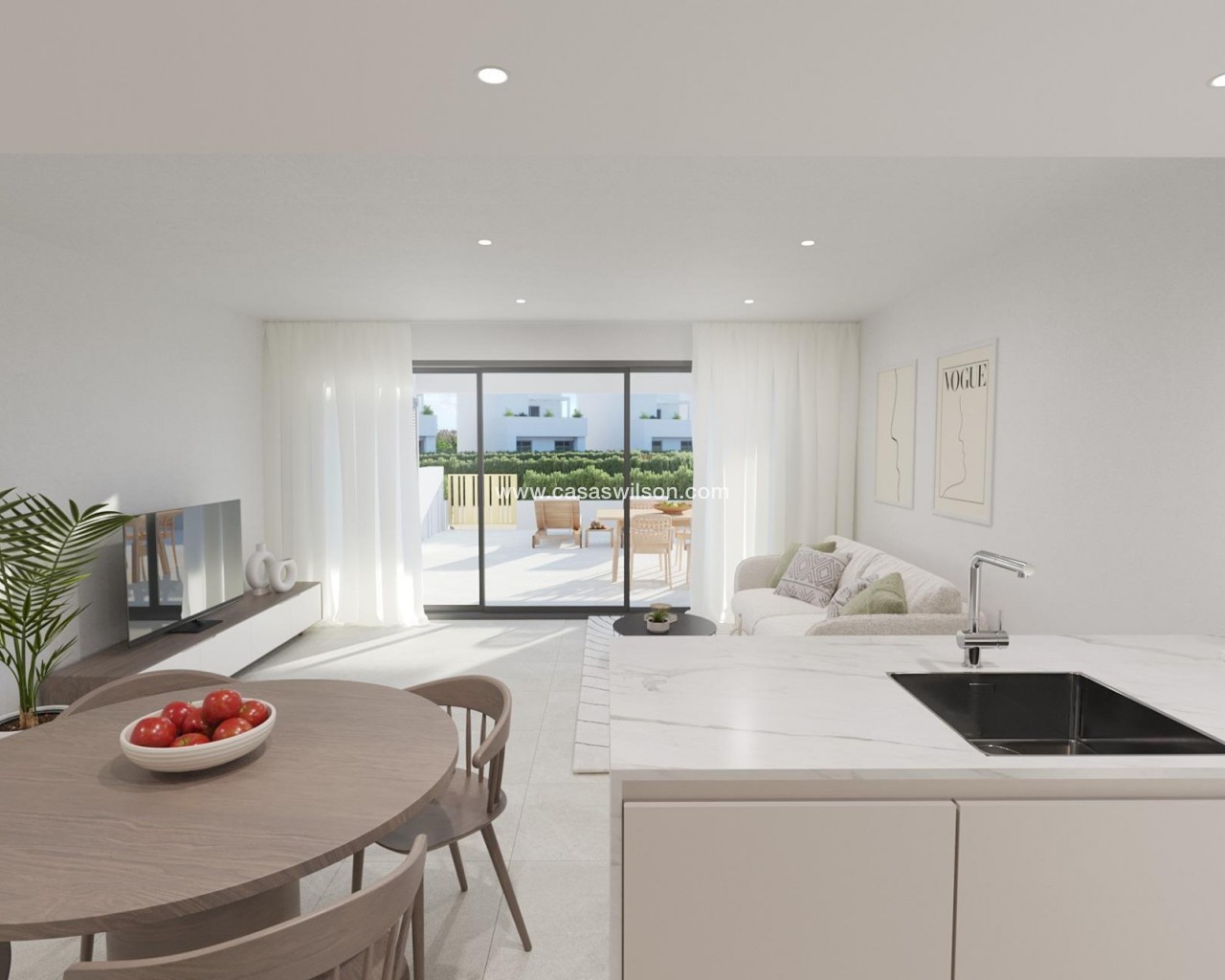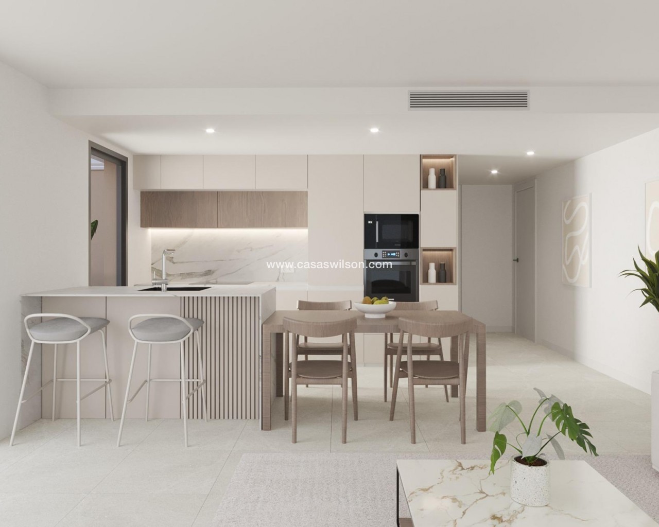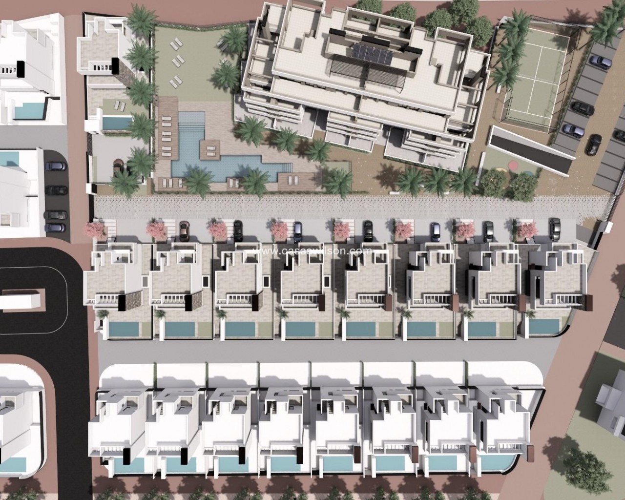 Exclusieve nieuwbouwappartementen in privéresort op 4 km van het strand Een luxe wooncomplex met 24-uurs beveiliging Dit nieuwe wooncomplex ligt in een prestigieus privéresort in de provincie Murcia en biedt 24 appartementen met een modern ontwerp, omgeven door groene zones en met toegang tot een indrukwekkend aanbod van eersteklas faciliteiten en diensten. Het resort heeft 24-uurs beveiliging, beperkte toegang en voldoende recreatieruimtes, waardoor het een ideale optie is voor wie op zoek is naar exclusiviteit, rust en een bevoorrechte natuurlijke omgeving. Moderne appartementen met verschillende indelingsopties De woningen zijn ontworpen met hoogwaardige afwerkingen en een indeling die is geoptimaliseerd voor comfort: Appartementen met 2 en 3 slaapkamers en 2 complete badkamers. Amerikaanse keuken geïntegreerd in de woonkamer, met een modern en functioneel ontwerp. Grote terrassen met uitzicht op de groene zones. Appartementen op de begane grond met privétuin, middelste verdiepingen met grote terrassen en penthouses met privésolarium. Parkeerplaats en berging inbegrepen. Topkwaliteit inrichting De flats hebben een selectie van ultramoderne materialen en technologie: Elektrische rolluiken in de slaapkamers. Zeer efficiënt aerothermisch systeem voor sanitair warm water. Volledig geïnstalleerde airconditioning (warm-koud). Vloerverwarming in badkamers. LED-verlichting met laag verbruik. Thermisch gelakt aluminium timmerwerk met koudebrugonderbreking. De urbanisatie heeft een gemeenschappelijk zwembad, speeltuin en paddle tennisbaan. Diensten in resort Het resort waar dit project zich bevindt is ontworpen rondom een indrukwekkend groengebied van 126.000 m², met onder andere: Minigolfbaan. Tennisbanen. Wandel- en fietspaden. Kinderspeelplaatsen en recreatiegebieden. Clubhuis met restaurant en sociale ruimtes. Hondenparken. Een spectaculair kunstmatig meer van 17.000 m² met kristalhelder water, witte zandstranden en verschillende strandbars. Strategische ligging vlakbij stranden en voorzieningen Dit exclusieve complex ligt op een bevoorrechte locatie, met gemakkelijke toegang tot de belangrijkste bezienswaardigheden in de regio: Los Alcazares Beach - Op minder dan 4 km afstand. Golfbanen in de buurt - Verschillende opties binnen enkele minuten. Cartagena - Minder dan 15 minuten rijden. Luchthaven Murcia - Op 22 km afstand (ongeveer 20 minuten rijden). Investeer in een unieke levensstijl in de regio Murcia Dit complex biedt een onovertroffen combinatie van kwaliteit, locatie en voorzieningen, ideaal als permanente verblijfplaats, vakantiewoning of beleggingsobject. Neem vandaag nog contact met ons op voor meer informatie of om een bezichtiging te regelen.