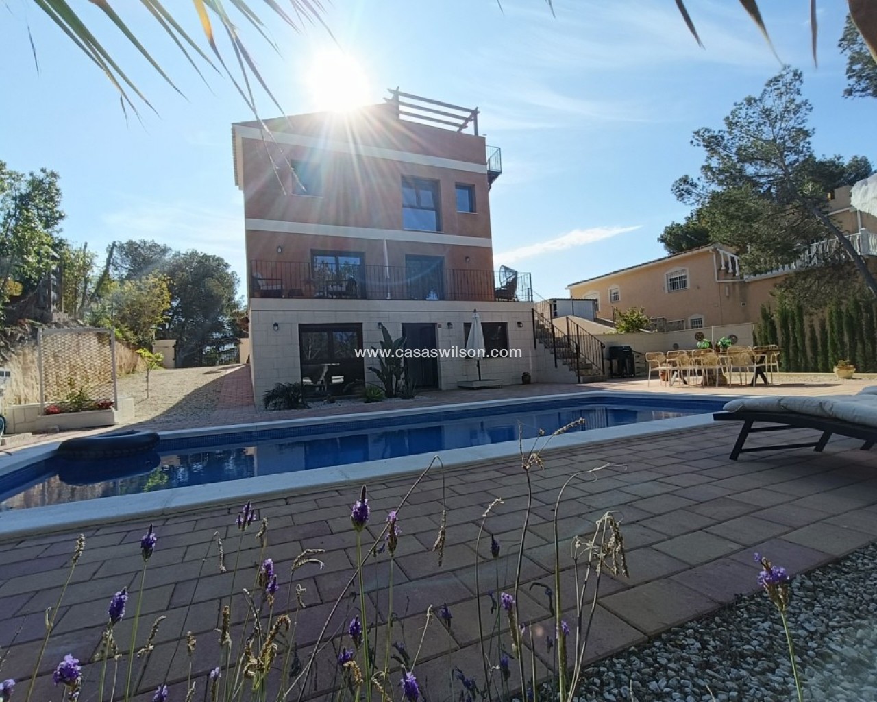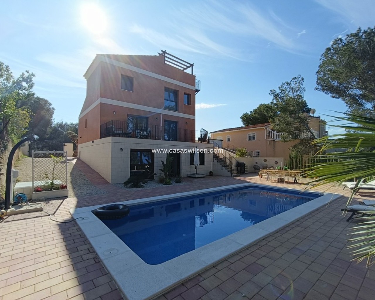 Villa. Ruime villa in Pinar de Campoverde – rust, ruimte en comfort Moderne nieuwbouwwoning met binnenzwembad Deze prachtige, nieuw gebouwde villa (oplevering maart 2024) ligt in een rustige, doodlopende straat, maar toch op slechts twee minuten wandelen van de hoofdstraat met bars en restaurants. Met een bebouwde oppervlakte van 256.13 m² op een perceel van 1008 m², biedt deze woning 5 slaapkamers, 4 badkamers en een uitstekende oriëntatie op het oosten, zuiden en westen. Praktische kelderverdieping met garage en binnenzwembad De kelderverdieping van 95.40 m² beschikt over een garage, wasruimte en boiler, een slaapkamer en een badkamer. Daarnaast is er een binnenzwembad, perfect voor ontspanning het hele jaar door. Vanuit de kelderverdieping is er directe toegang tot de woonkamer. Gezellige leefruimte op de begane grond De gelijkvloerse verdieping van 82.40 m² bestaat uit een open woonkamer, eetkamer en een volledig uitgeruste keuken. Daarnaast bevindt zich hier een multifunctionele ruimte die als slaapkamer of kantoor kan dienen, en een badkamer. Vanuit de woonruimte is er directe toegang tot een ruim terras. Drie slaapkamers op de eerste verdieping De bovenverdieping van 78.33 m² herbergt drie slaapkamers, waarvan één met een eigen vestiaire en ensuite badkamer. Daarnaast is er nog een aparte badkamer. Via de gang leidt een buitentrap naar het solarium. Op het platte dak bevinden zich de airco-units en een zonneboiler. Vanaf het solarium geniet je van een prachtig open uitzicht. Gedeeltelijk bemeubeld en instapklaar De villa wordt gedeeltelijk gemeubileerd verkocht en is voorzien van airconditioning, waardoor het een comfortabele en instapklare woning is. Pinar de Campoverde – rust en natuur dichtbij de kust Pinar de Campoverde is een charmante, groene woonwijk vlak bij het natuurpark Río Seco en op korte afstand van de prachtige stranden van de Costa Blanca. De omgeving biedt een perfecte mix van rust, natuur en voorzieningen, met winkels, restaurants en golfbanen in de buurt. Het is de ideale plek voor wie wil genieten van privacy en ruimte, maar toch dichtbij alle faciliteiten wil zijn. Meer weten€ Neem contact op voor meer informatie of een bezichtiging.