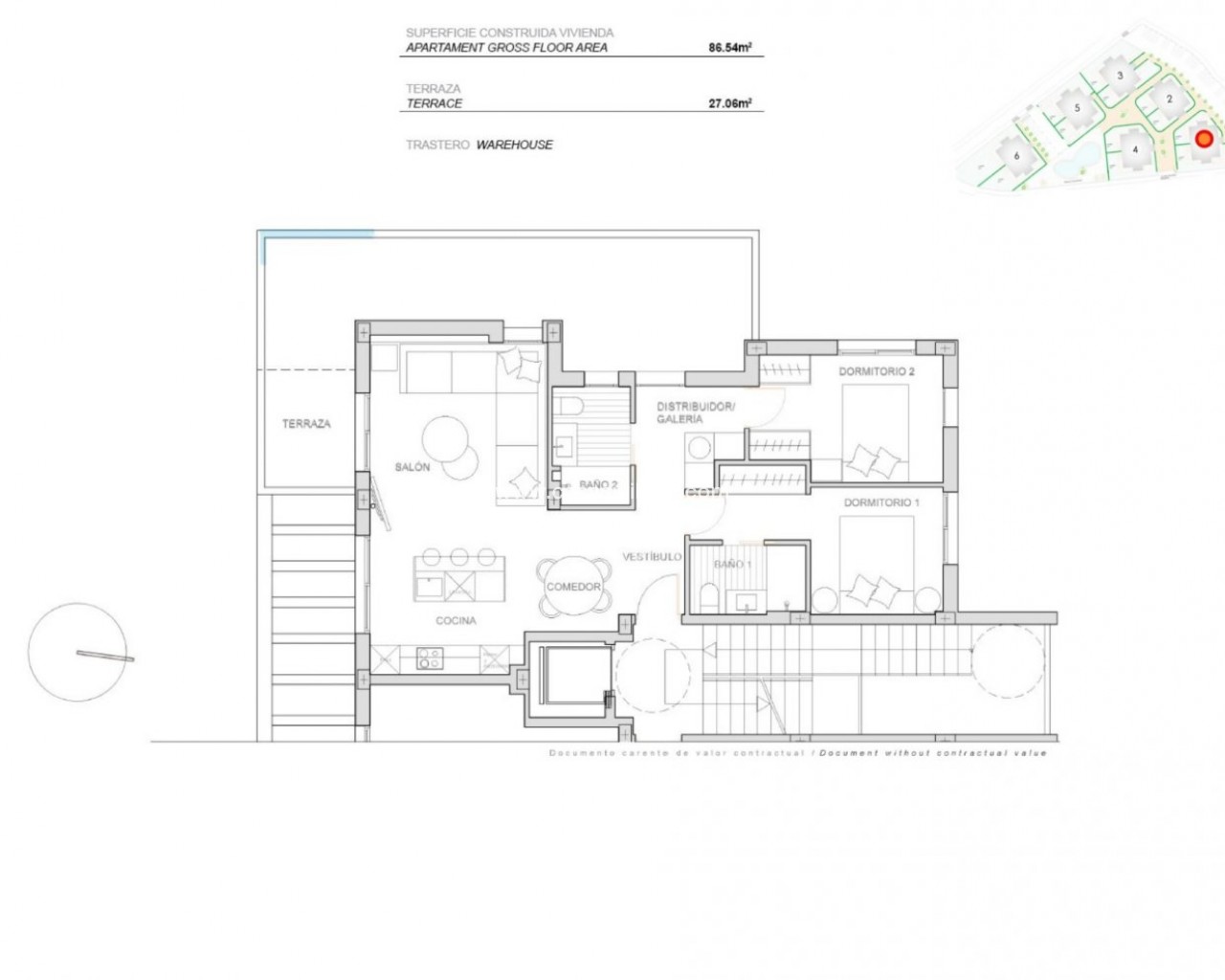 NEW BUILD APARTMENTS IN PRIVATE GATED RESORT IN PROVINCE OF MURCIA New Build residential complex of 6 blocks, a total of 42 apartments. Beautiful apartments have 3 and 2 bedrooms and 2 bathrooms with views of the large lake and green areas of this large luxury resort. Ground floor apartments with private garden, top floor apartments with private solarium. Complex has a communal pool and all the apartments have a parking pace and a storage room. Located in a private gated resort, with a main access entrance and 24 hours security. The resort is designed around an impressive 126.000 m2 green area. It comprises walking and cycling paths, sport facilities, paddle and tennis courts, a mini-golf course, gardens, dog parks, leisure areas, clubhouse…. Also in the central area is the jewel of the resort, a crystal-clear artificial lake of almost 17.000m2 of water surface, surrounded by white sandy beaches and palm trees, bringing a piece of the Caribbean to the Murcia Region. There are 2 islands in the lake, one of them has its own bar, there are also “beach Chiringuitos” spread around the lake. The resort is strategically located less than 4 km from the beach and the town of Los Alcázares, where you can practice various water sports, surrounded by several golf courses and the city of Cartagena less than 15 minutes by car and 22 km from Murcia airport, therefore having a wide cultural, gastronomic and sports offer within reach.