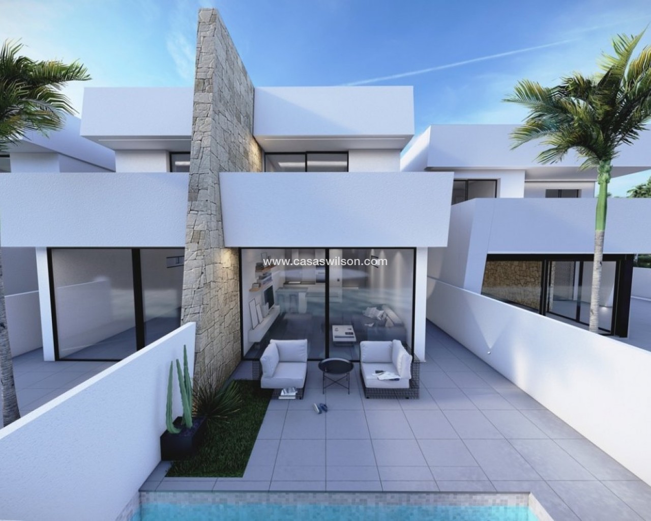 NEW BUILD SEMI DETACHED VILLAS IN SANTIAGO DE LA RIBERA New Build residential of detached and semi detached villas with private pools in Santiago de la Ribera (650 metres from the beaches) Properties designed to provide the very best open plan living space, featuring double full glass sliding doors that open directly on to a large terrace with private swimming pool, terrace and parking area. Villas offer 3 generously sized bedrooms (first floor with en-suite), and a further bathroom on the ground floor with walk in shower. The ground floor living area features a fully fitted kitchen with drop down table open plan lounge / dining area, fully fitted kitchen zone with appliances, exterior storage room and terraced areas to the side of the villa, from master bedroom and from the lounge area. The villas are perfectly situated as they are walking distance to Dos Mares shopping centre and many other shops, bars, restaurants and the beautiful beaches of the Mar Menor. The Wednesday & Saturday street market is just 150 metres away. Only 20 minutes to the popular Zenia Boulevard, 30 minutes from Cartagena city. This area offers a variety of sports activities, including seasonal water sports … With some particularly good golf courses very close by! Santiago de la Ribera is a coastal town administratively dependent on the municipality of San Javier. It has 4 km of beach that are a great attraction for tourists from different origins. Murcia/Corvera airport is 30 minutes away and Alicante airport is an hour drive away.