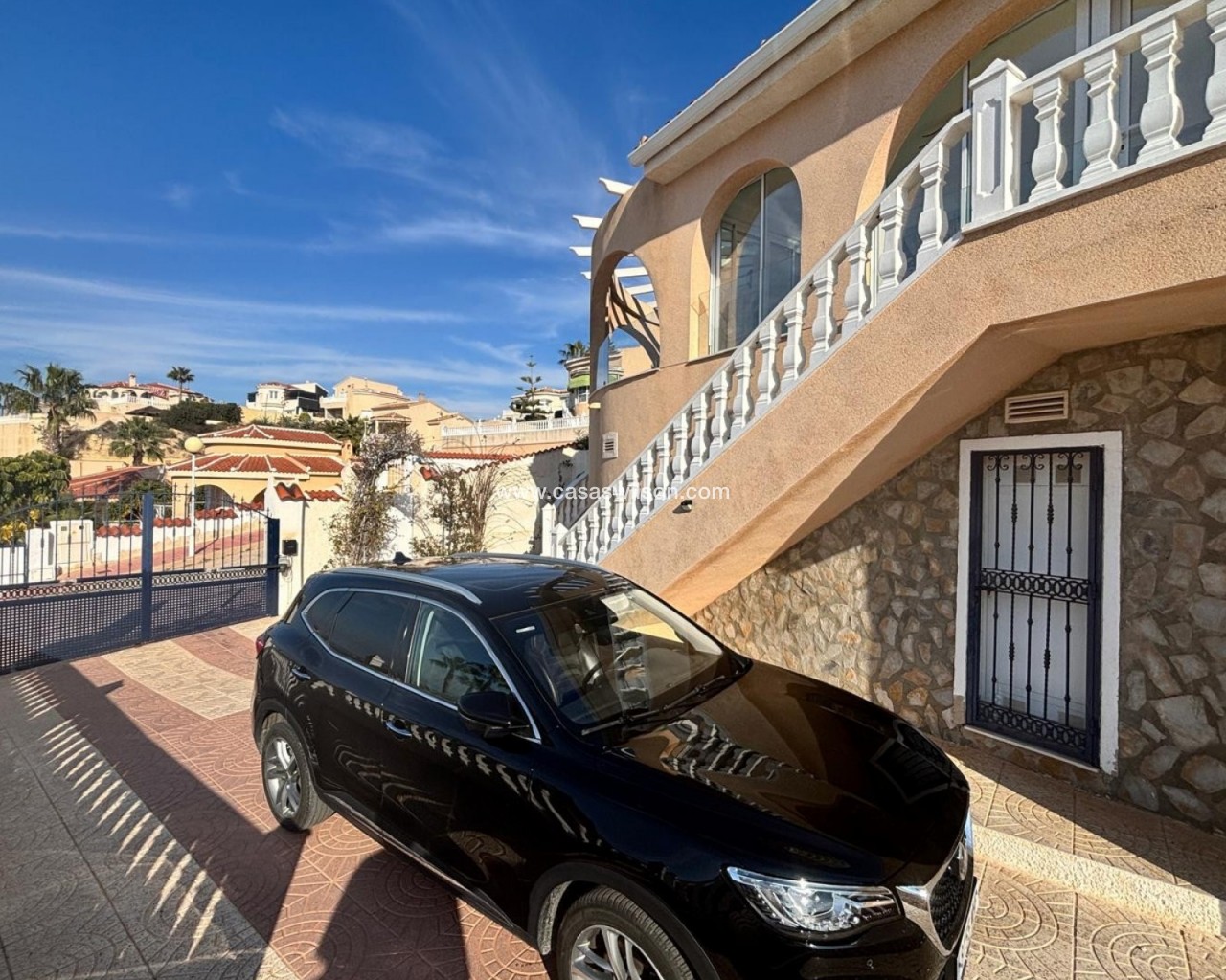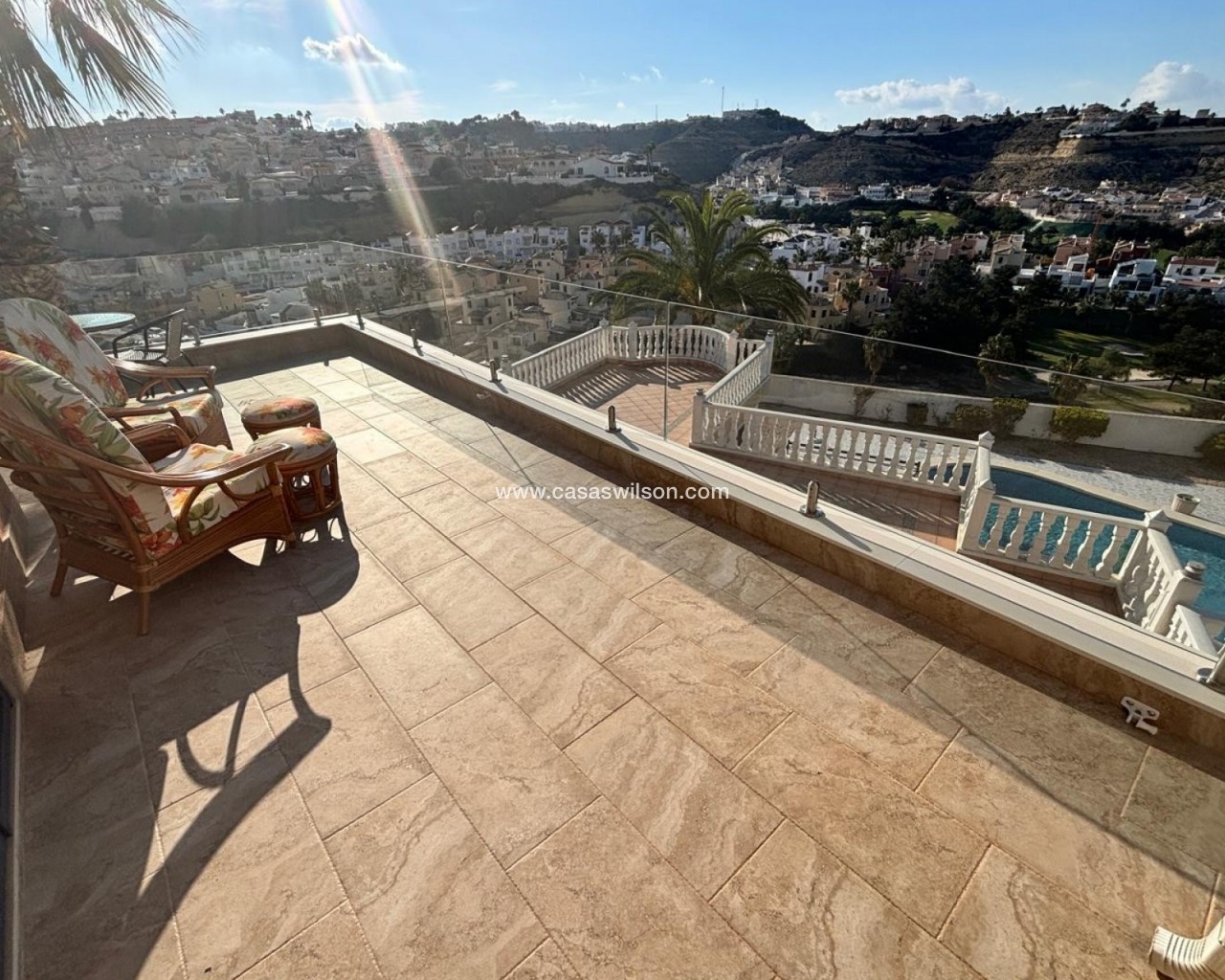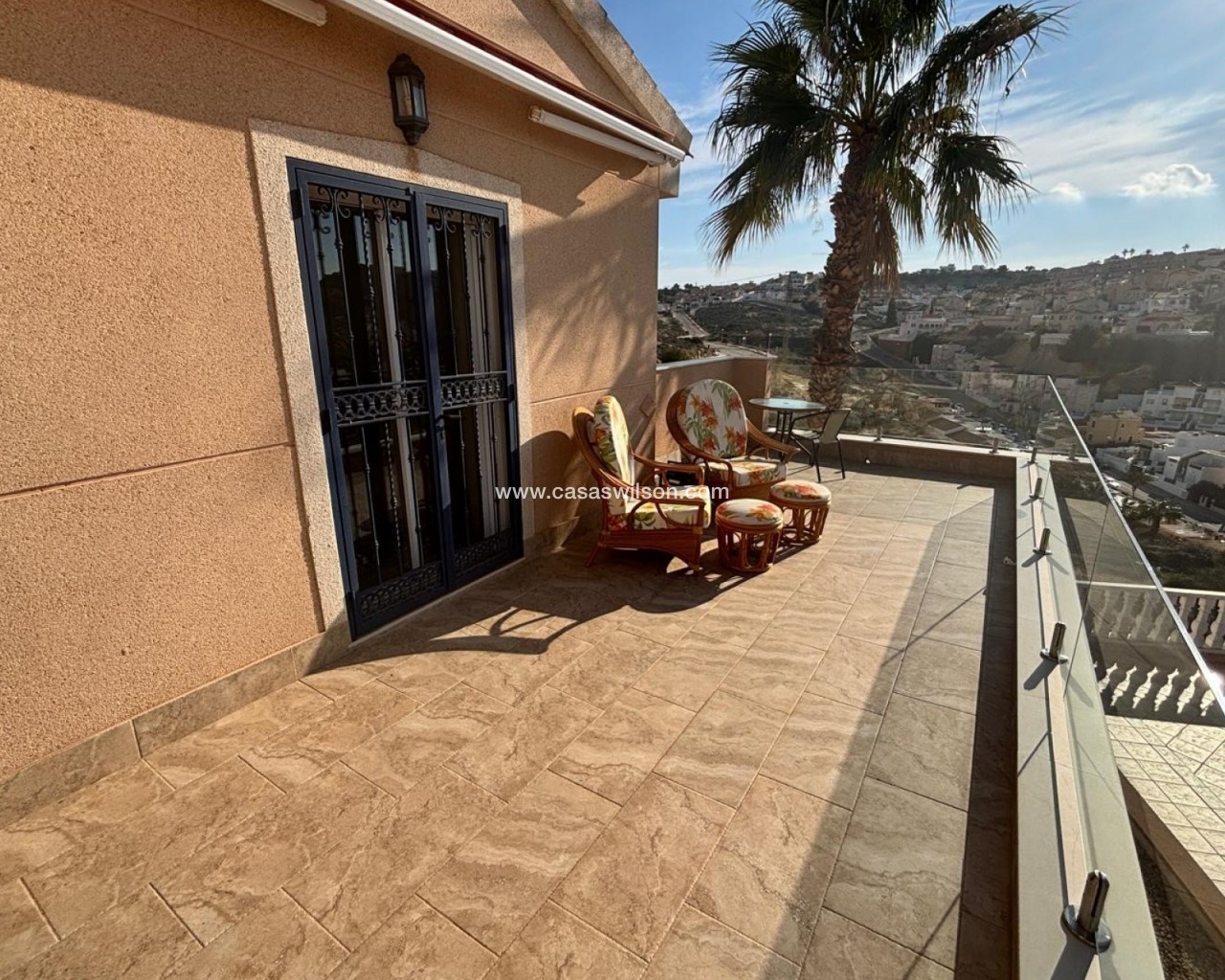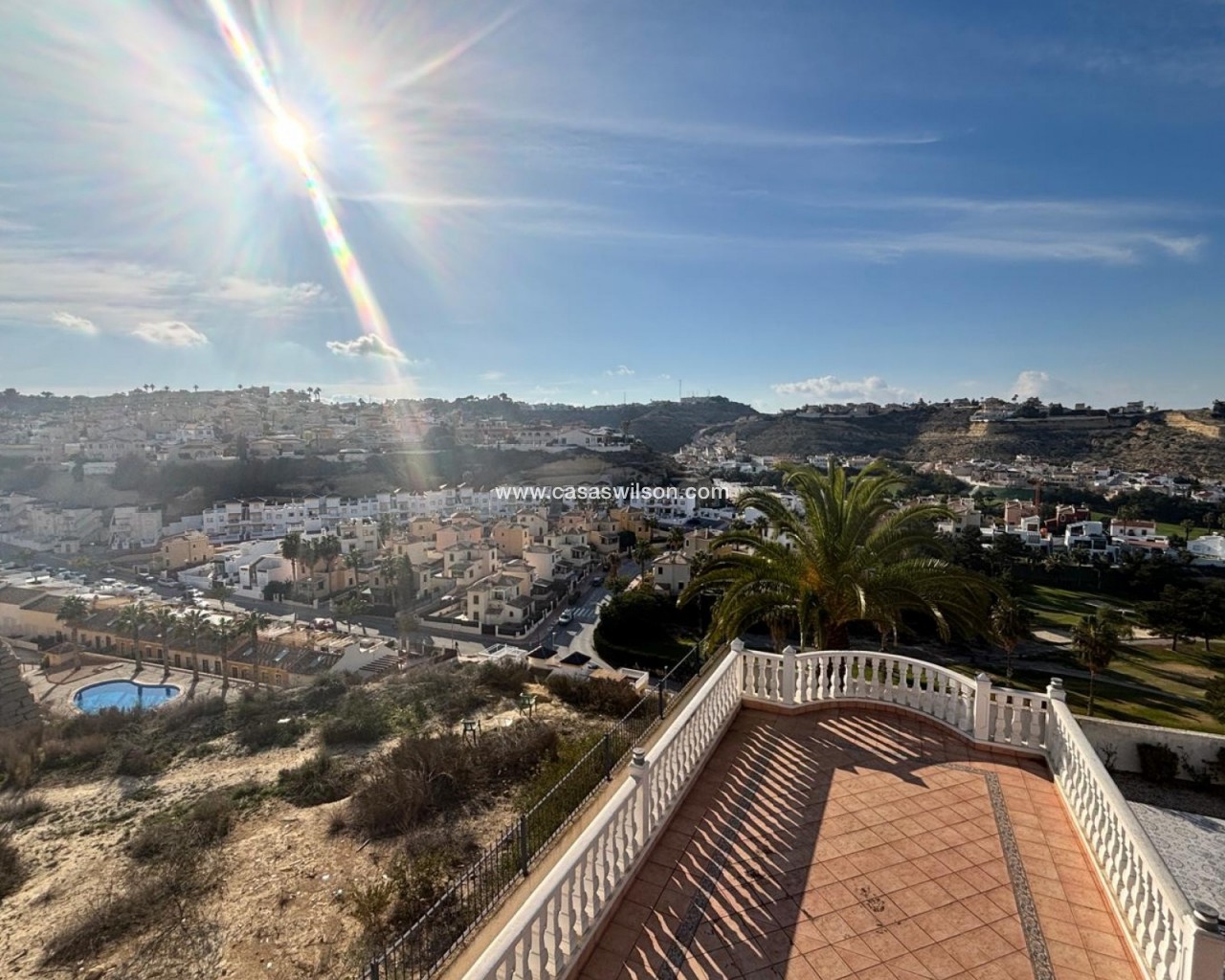 Here we have this amazing Luz style detached villa with stunning views to the La Marquesa Golf course and surrounding area. The main villa consists of 3 double bedrooms with 3 bathrooms 2 being ensuite. Huge lounge with separate dining room and Kitchen with utility room. There are 3 main terraces from the main house 2 being open and one enclosed very bright with doors and windows that can be opened up giving the feel of one huge terrace again with stunning views towards pool and golf. Thee underneath could be converted into a large under build with 3m high ceilings so lots of potential.. on the outside there is again plenty of terraced areas and a large 12x5 heated pool, There is a separate 2 bed 2 bath self contained bungalow that over looks the pool. Complete with many extras air-con, underfloor heating , electric gates.........