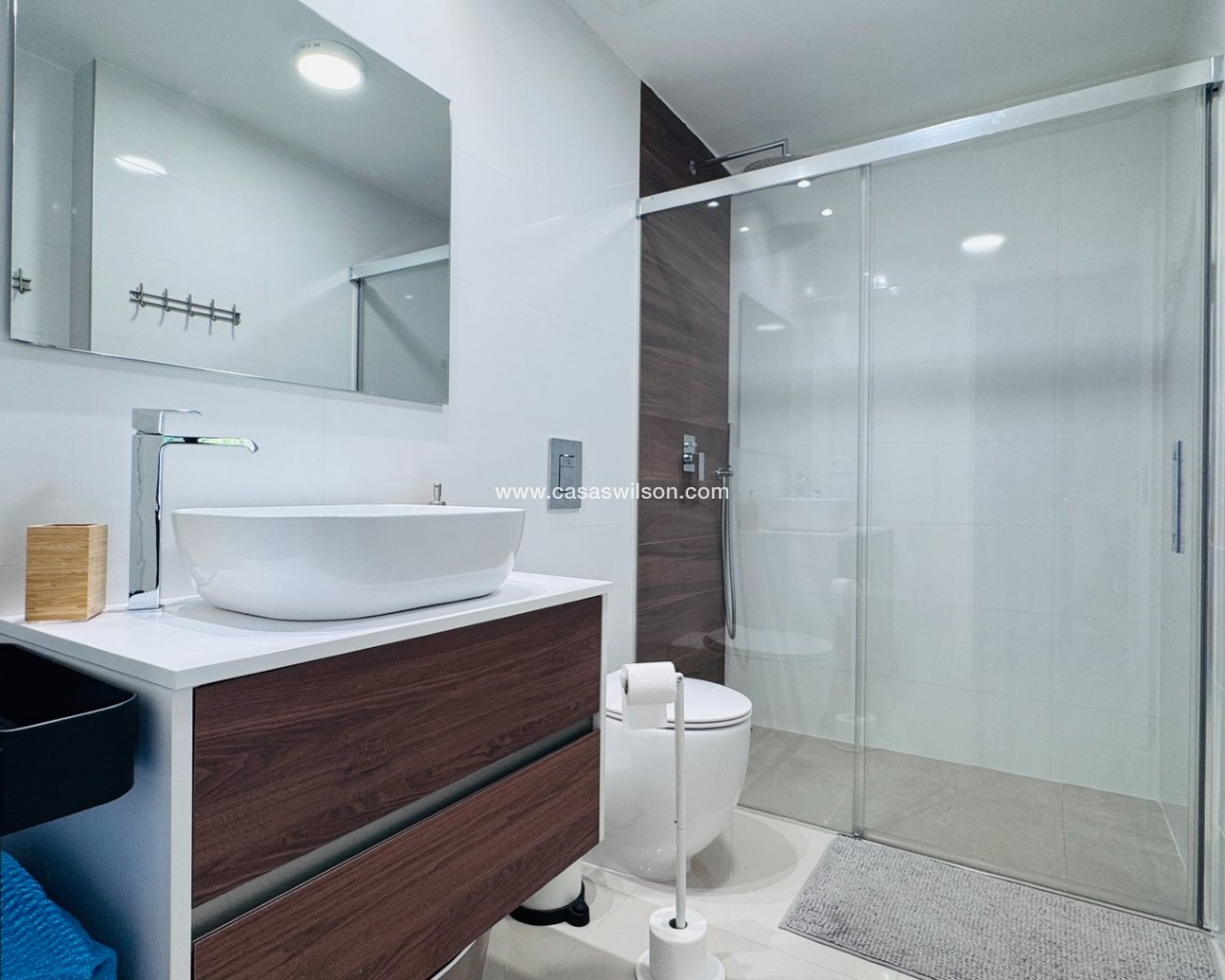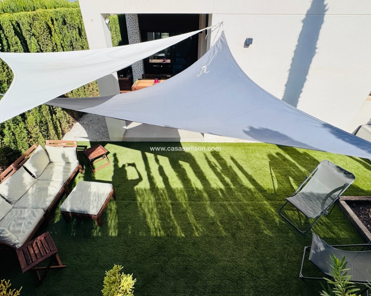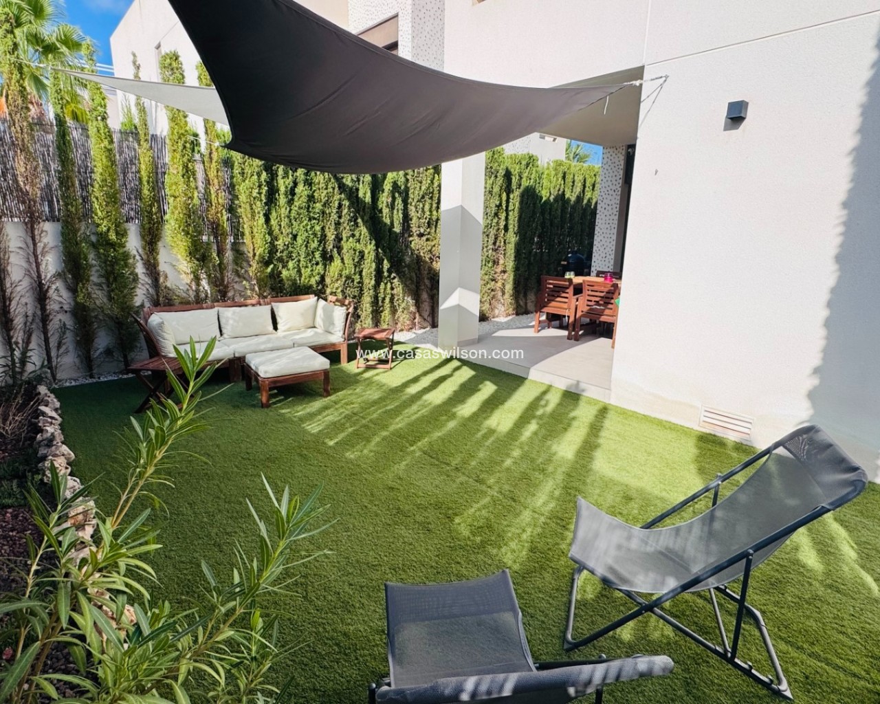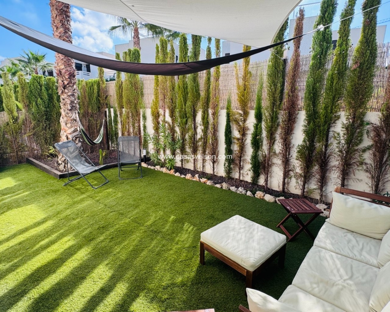 This well presented two bedroom ground floor apartment is located on the 'Los Lagos' development, La Finca Golf, Algorfa. Owned since new and upgraded over the last five years the apartment is a great lock up and leave in this fantastic location. At the front of the property there is off road parking for one vehicle. Enter the gate and you have a lovely east facing garden/courtyard with mountain and orange grove views. The open plan living and dining area is light and bright having doors to the front and rear gardens. The kitchen area has a range of wall and base units, integrated oven/hob/extractor, dishwasher, washing machine and fridge freezer. Storage cupboard housing the water boiler. Both bedrooms are a good size, light and bright and have floor to ceiling built in wardrobes. The master bedroom has a lovely ensuite shower room and doors to the rear garden whilst the second bedroom has doors onto the front garden. Outside and to the rear is a lovely covered terrace with BBQ area. Perfect for entertaining, whilst the garden area has plenty of space for loungers to soak up the sun along with sails to provide shady areas. Residents have access to a beautiful pool and garden area located to the rear of the apartment. The property is being sold fully furnished and has air conditioning throughout along with an alarm system. Within walking distance of the property you have the prestigious La Finca Golf Spa Hotel which is open to non residents. The golf course club house has a lovely bar overlooking the course along with several other restaurants. The La Finca commercial centre is a short drive away and has a range of bar and restaurants to suit all tastes. The main motorway is around five minutes away and gives quick access to the cities of Elche and Alicante along with the airport in around 40 minutes. The nearest beaches can be found at Guardamar in less than a 15 minute drive.