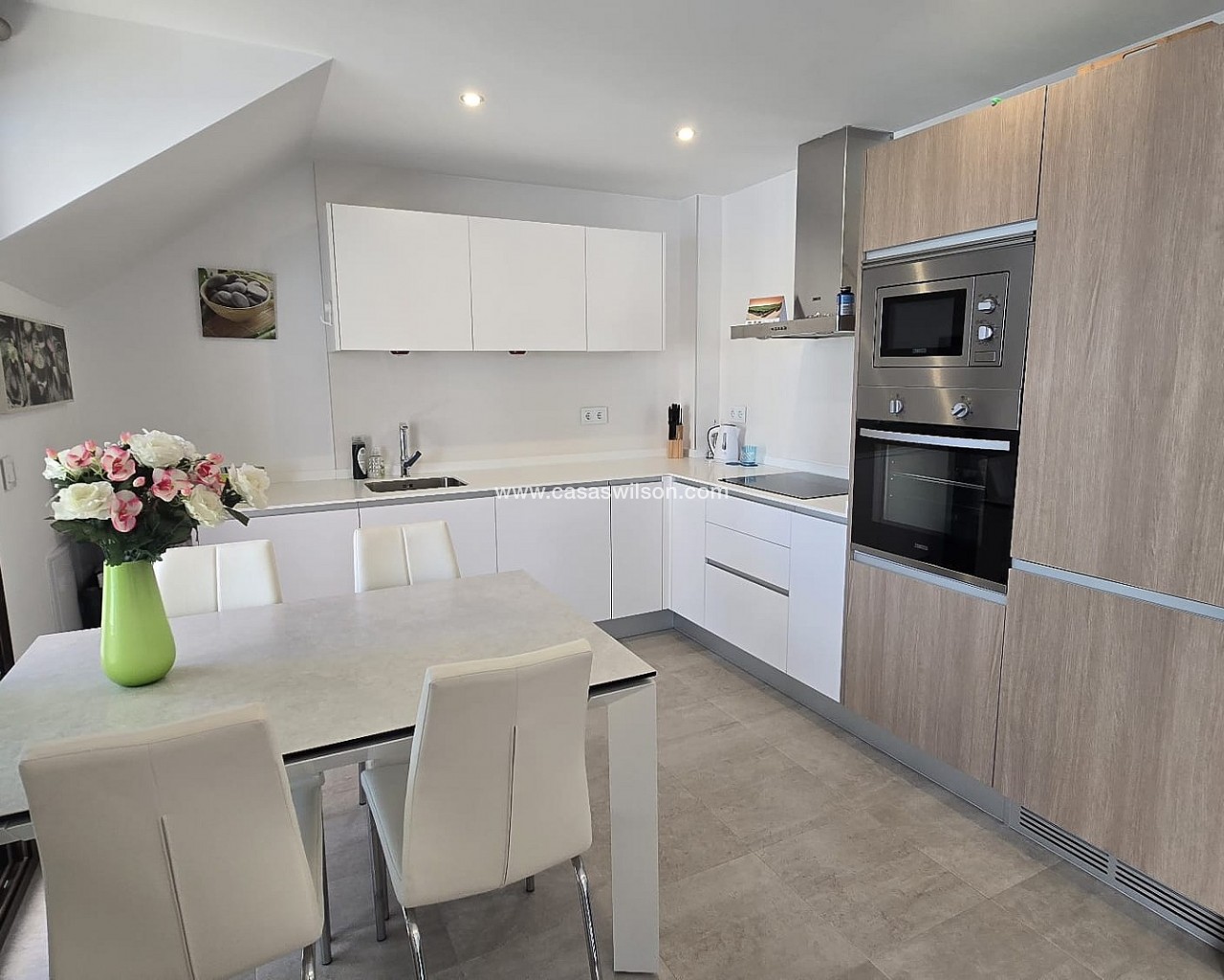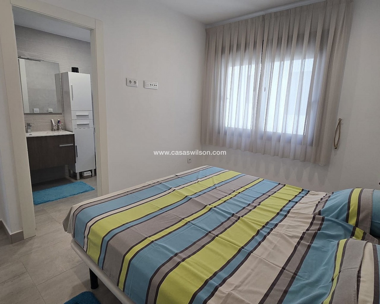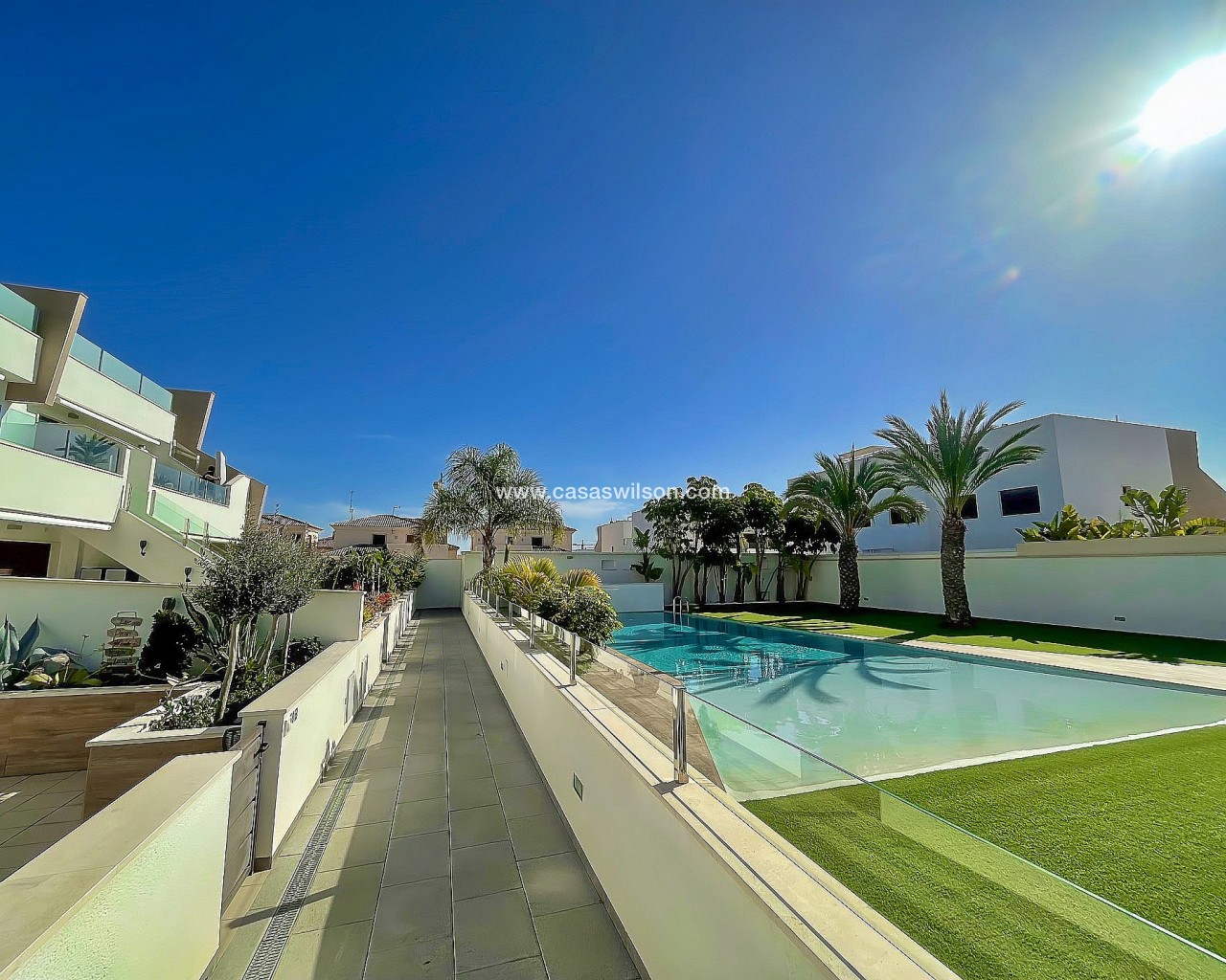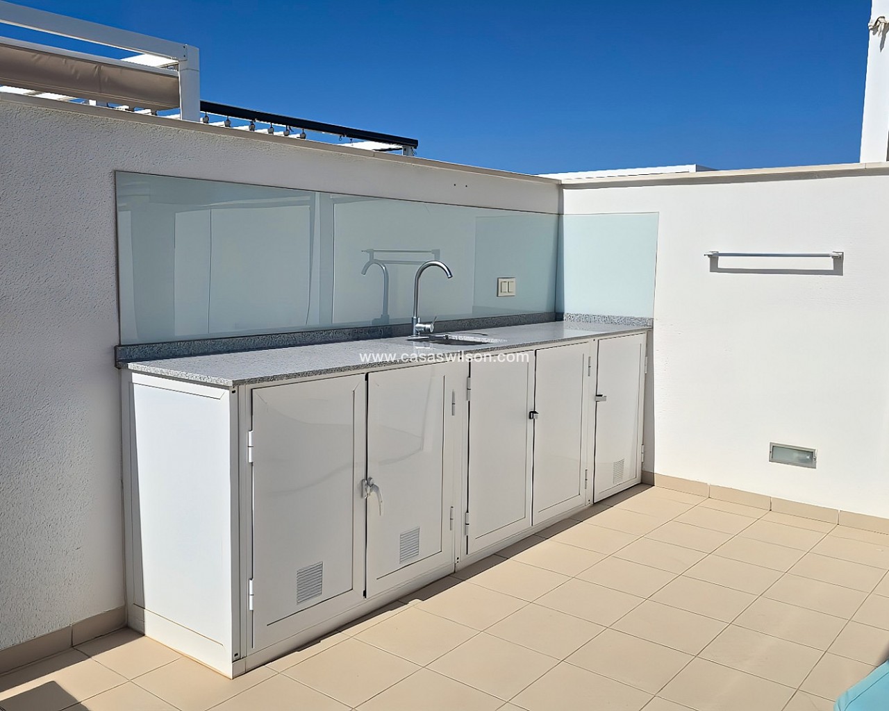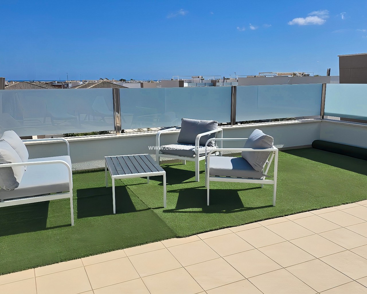 Modern penthouse with large rooftop terrace and sea view. Modern Top-Floor Apartment with Roof Terrace and Sea View in Authentic Spanish VillageDiscover this beautiful modern top-floor apartment located in the heart of the authentic Spanish village of Pilar de la Horadada. Within walking distance you’ll find all amenities — supermarkets, restaurants, cafés and shops while the stunning beaches of the Costa Blanca are just a few kilometres away.This stylish penthouse apartment offers everything for those who value comfort, sunshine and space. It features two spacious bedrooms and two modern bathrooms with large walk-in showers, toilets and elegant vanity units. The modern open-plan kitchen is fully equipped with high-quality appliances.The bright living room of approx. 30 m² enjoys plenty of natural light thanks to large sliding doors that lead to the spacious balcony, overlooking the large communal swimming pool and sunbathing area.One of the highlights of this property is the private roof terrace of 67 m², perfect for enjoying the sun, relaxing in privacy, and admiring beautiful views of the Mediterranean Sea.The property also includes a private parking space and a bicycle storage area. It is in excellent condition, beautifully maintained, and furnished with high-quality furniture in perfect shape.In short, a ready-to-move-in home in an ideal location — perfect as a permanent residence, holiday home, or investment on the Costa Blanca.