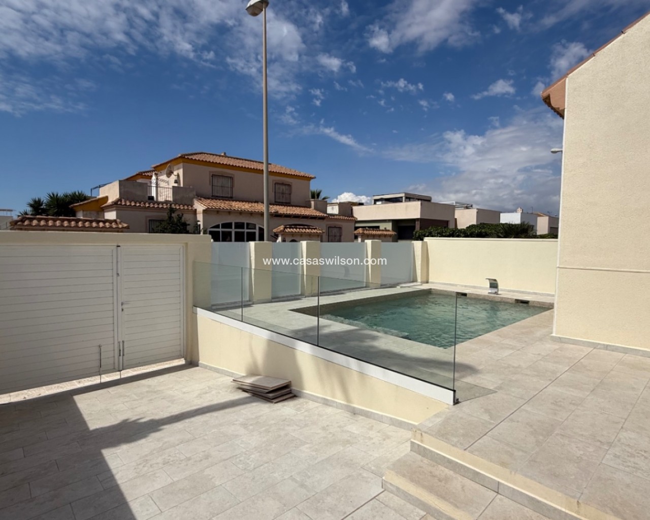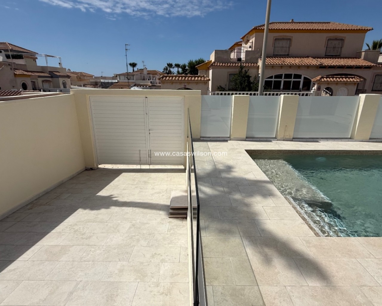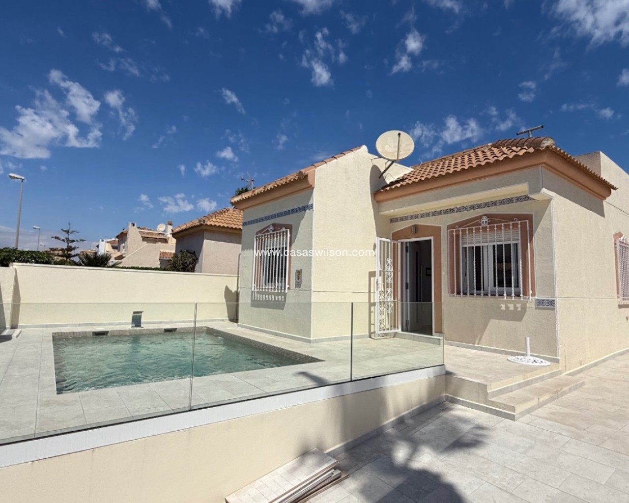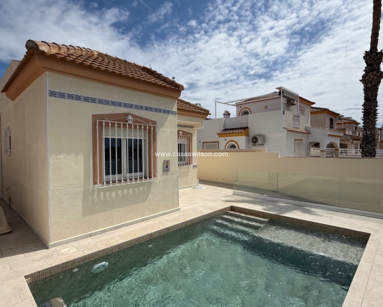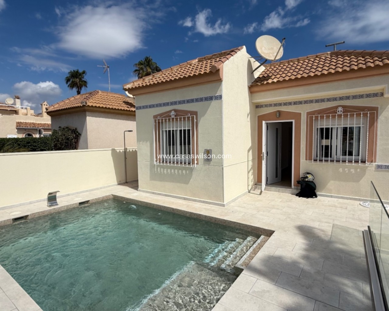 Beautiful villa with private pool, a large solarium with sea views and all-day sun.Located in Torre del Moro, just 400 meters from the sea and a 10-minute walk to La Mata beach.This fantastic Mediterranean-style house offers 2 bedrooms, 1 fully renovated bathroom, a spacious living room with a new American-style kitchen. Equipped with air conditioning in the living room.The property is newly renovated and in excellent condition, ready to move in and enjoy life. A short distance from the Las Salinas shopping center and the Torremarina shopping center where you can find various restaurants, bars, supermarkets and much more.Don't miss the opportunity to buy this beautiful villa with a private pool a short distance from the beaches of Torrevieja!