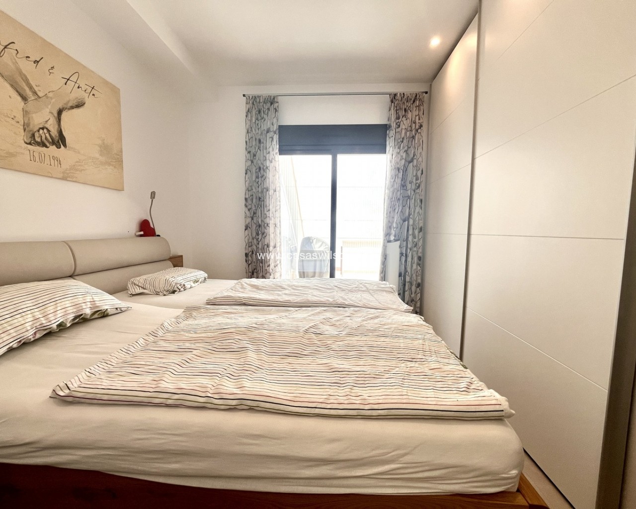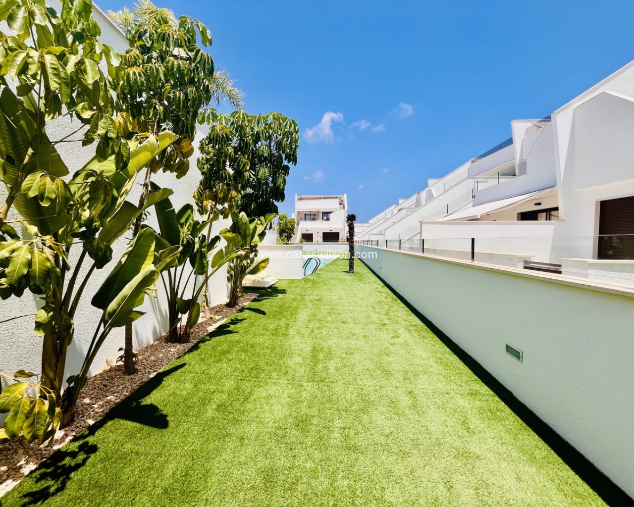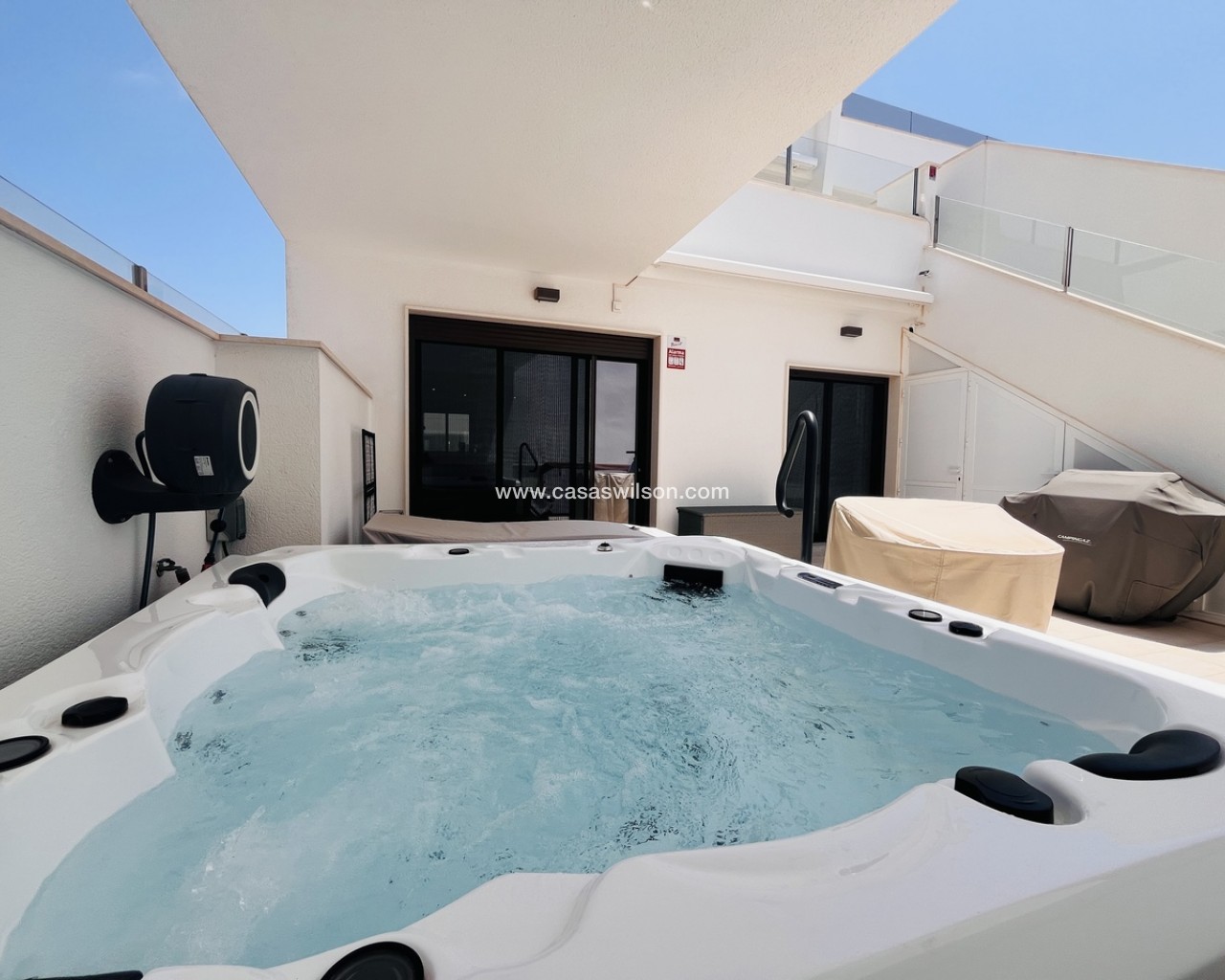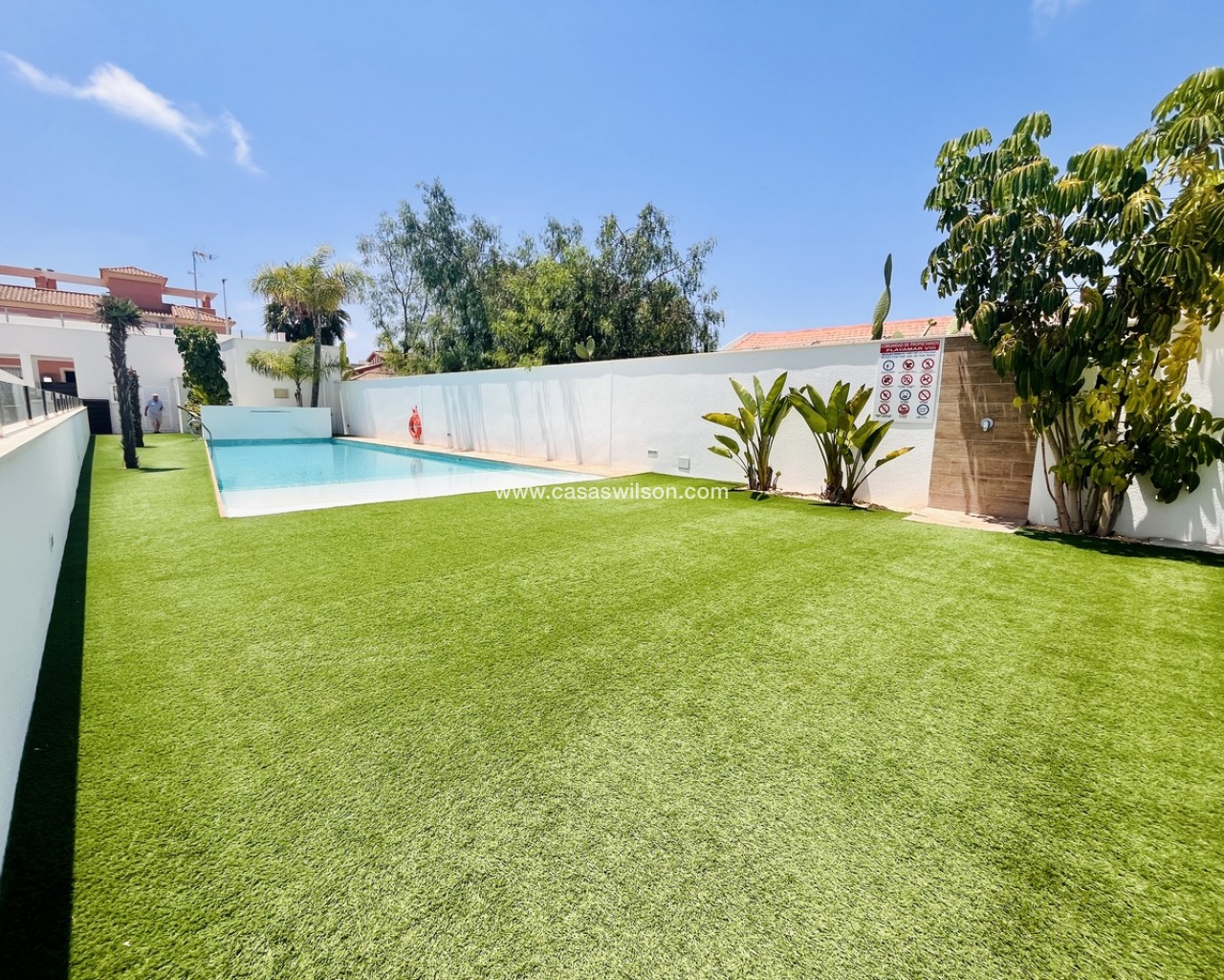 A fantastic opportunity to own this modern 2-bedroom, 2-bathroom ground-floor apartment in Pilar de la Horadada. Positioned on a corner plot, the property offers off-road parking right outside — ideal for convenience. Inside, you’ll find a bright open-plan lounge and dining area, alongside a recently upgraded fully furnished kitchen with new appliances.The property has sliding doors from both the living room and master bedroom to a spacious private rear terrace with a laundry cupboard, plenty of outdoor space, and a private jacuzzi, perfect for relaxing or outdoor dining. The property is sold fully furnished, ready to move in to.From the terrace, you have direct access to the communal gardens and a fantastic swimming pool that gets sunshine all day. There’s also a communal storage area and two designated bike spaces.Other features include ducted hot and cold air conditioning, a new terrace awning, water osmosis system, fitted wardrobes.Ideally located within walking distance of bars, restaurants, shops, and the weekly market. The beaches are just a 5-minute drive away, with quick access to the Mar Menor, Dos Mares Shopping Centre, and Lo Romero Golf Resort only 6 minutes by car.