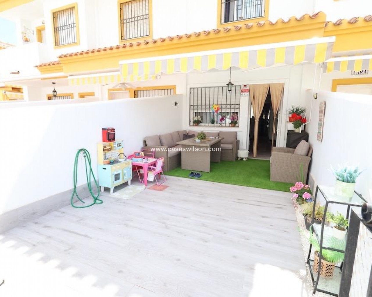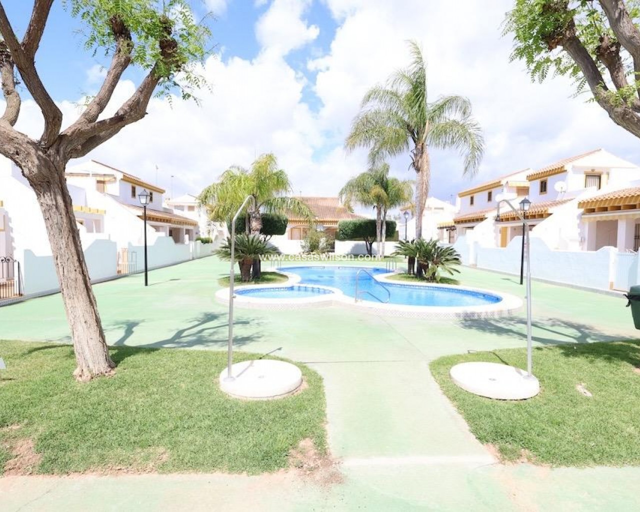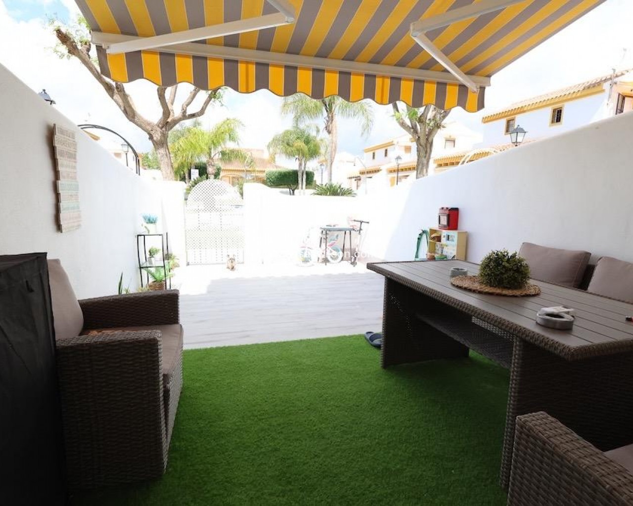 Torre de la Horadada – Residencial Cañada Real . We present this charming duplex townhouse located directly in front of the communal pool, in one of the most pleasant residential complexes in the area.. . The property offers a built area of 70 m², distributed over two bedrooms, two bathrooms, a bright living-dining room, a fully equipped open-plan kitchen, and a spacious rear patio—ideal for laundry or storage.. . At the front, there is a large tiled terrace of approximately 20 m² with direct access to the pool, perfect for enjoying the sun and landscaped surroundings. . The home is sold fully furnished and equipped, including air conditioning.. . The residential complex features extensive green areas and two communal pools, offering a quiet, well-maintained, and family-friendly environment just minutes from the beach and all essential services.
