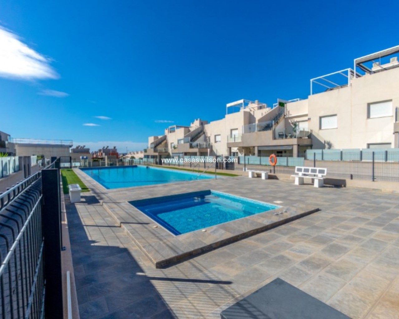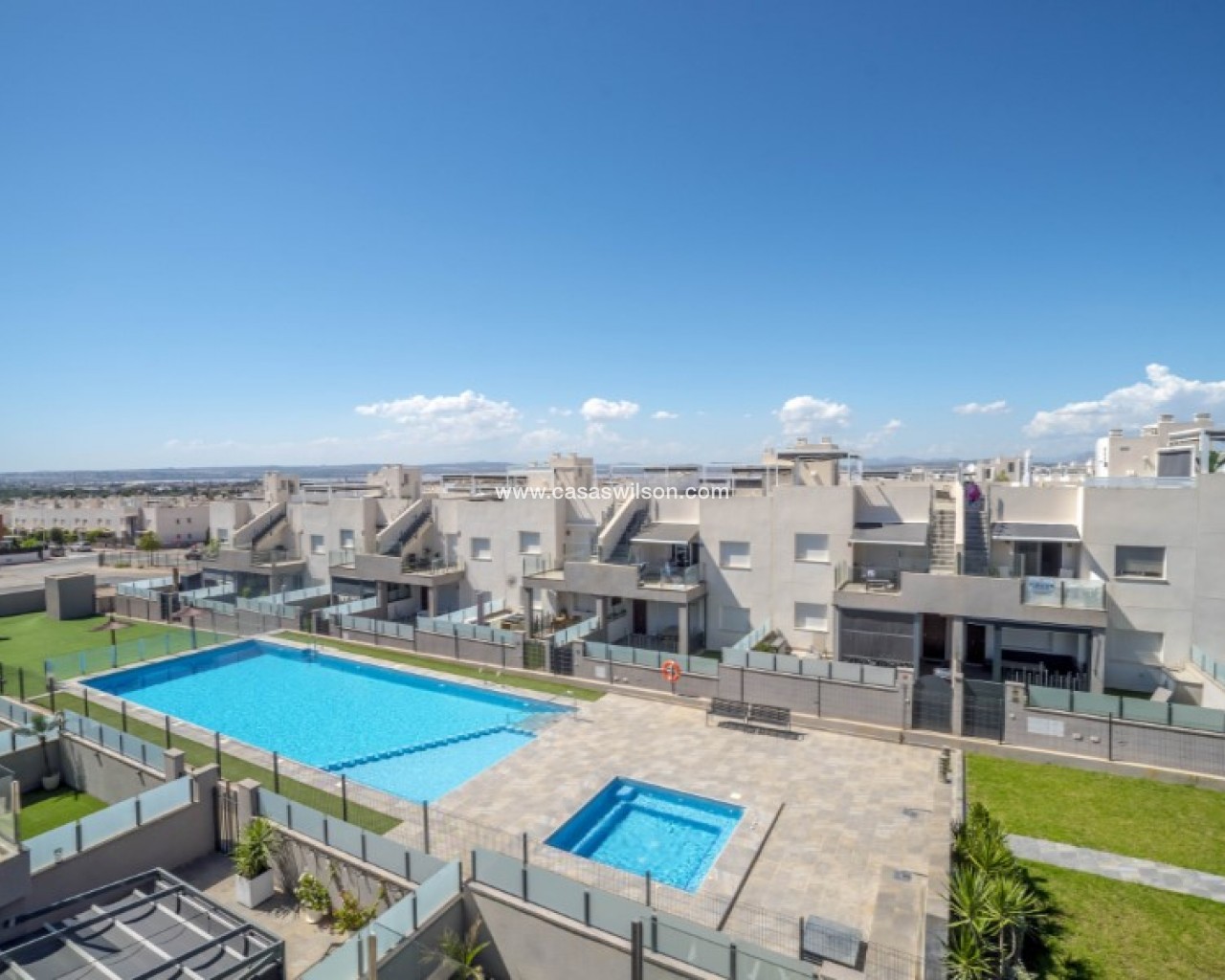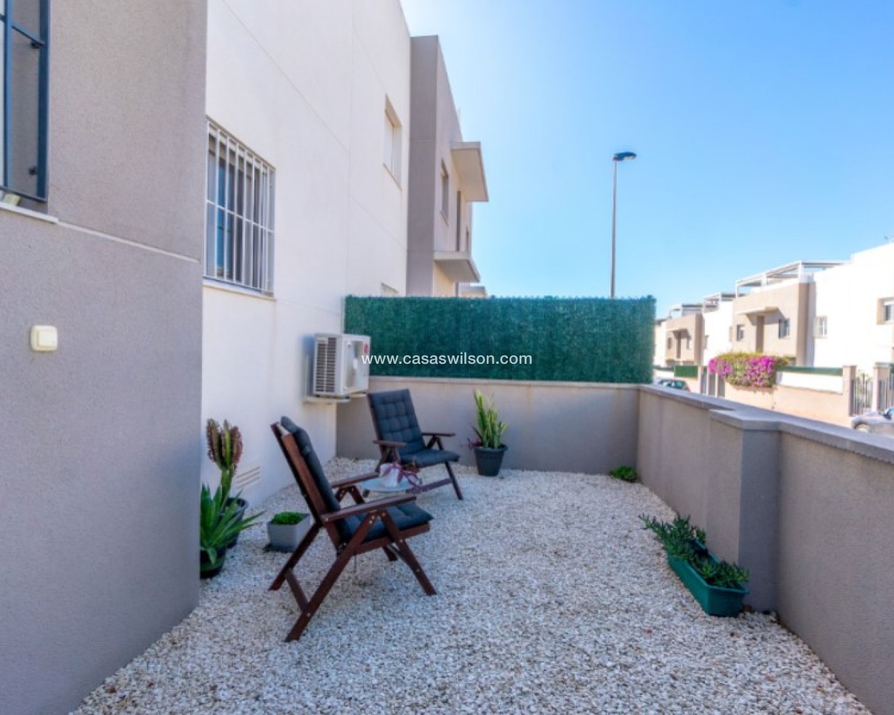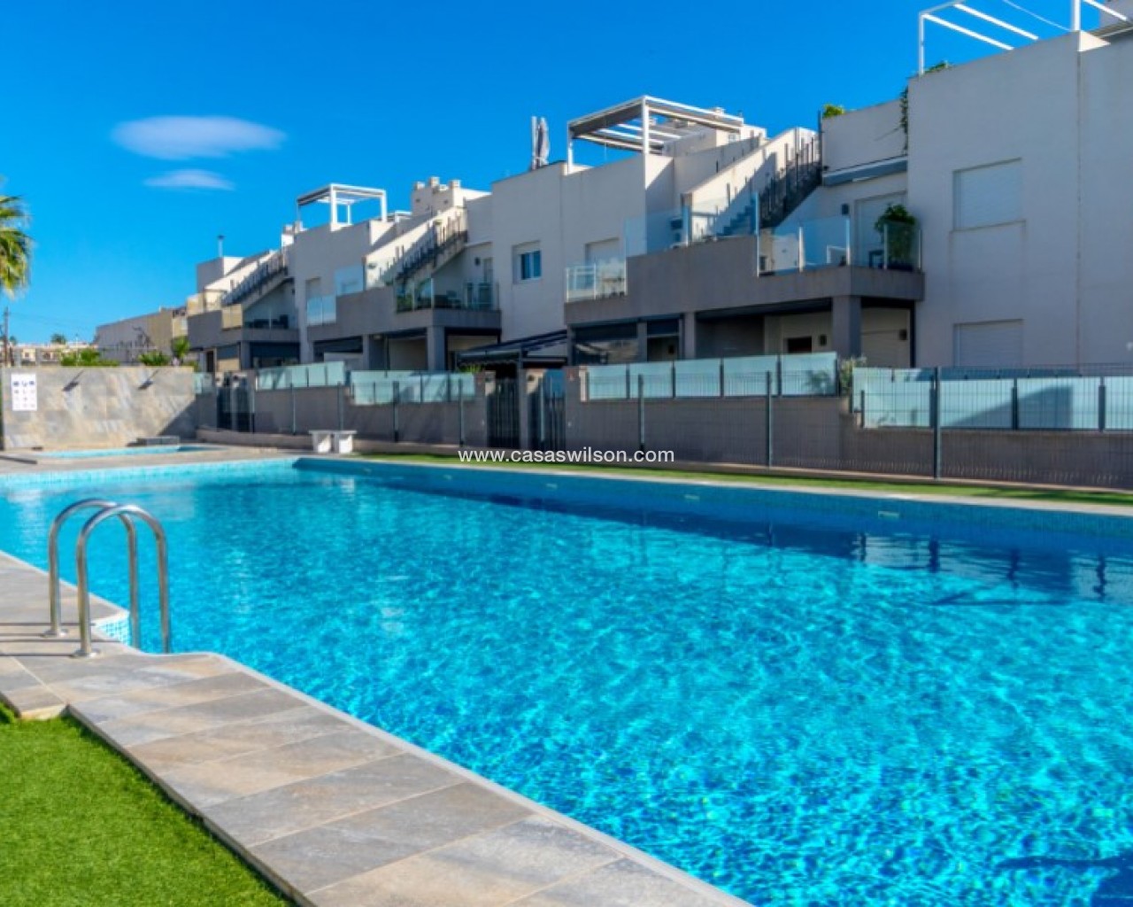 Welcome to this beautiful and very well-maintained flat in a perfect location in the popular area of Solpark 2 in Aguas Nuevas (Sector 25). The home offers two bedrooms, two bathrooms and a well-thought-out floor plan with beautiful patios on both sides, so you can enjoy the sun all day.The west-facing terrace at the entrance area offers afternoon and evening sun - ideal for relaxing moments after a day in the sun. The east/south facing garden offers morning sun until late in the afternoon and has a partially covered terrace with pull-down awnings for extra comfort. From here you have direct access to the beautiful common area with large pool and jacuzzi, the shower with hot water is a perfect place for relaxing.Inside you will find a home that appears almost new, with a high standard and several modern comforts:Heating cables in the kitchen, living room and both bathroomsAir conditioning in ducts (duct system)Limescale remover installed on the water inletMaintained air conditioning and water heater by professional technician if needed.The flat is sold fully furnished and equipped, ready to move straight into.In the basement you will find both a private parking space and a spacious storage room - ideal for storing bicycles, golf equipment and more.This is a property that combines comfort, quality and a sunny location - perfect as both a holiday home and a year-round residence.SOLPARKSolpark II is a popular urbanisation was ready for occupancy in 2019, here there are only 40 units,State-of-the-art apartments with a high standard and beautiful, child-friendly communal areas, lovely swimming pool, jacuzzi and green areas.Walking distance to grocery store, cafes and restaurants and not to forget the sports hall and the well-known Friday market.Just a short bike ride away from several idyllic sandy beaches as well as the centre of Torrevieja.Just a few minutes walk you will find the protected Natural Park of Laguna La Mata, here there are marked trails and cycling (for example, hiking trails that go around the lake) very nice for a quiet excursion or photo trip, it is a nature reserve of very high ecological value: wetlands that are important for many species of birds, especially in migration, nesting and wintering, For bird enthusiasts, there are several good places in the park where you can get nice vantage points for bird watching.Alicante airport is only 35 minutes away by car.There are many golf courses within 15 minutes drive.TorreviejaTorrevieja is a city in the Alicante province in the Comunidad Valenciana region of Spain. The city is a popular tourist destination located about 40 minutes drive from the big city of Alicante and the airport. Torrevieja was originally a small fishing village, and is today one of Europe's largest salt producers, Torrevieja has previously been called the 'salt city', but in recent years the city has also been named 'the sports city', this because of the large sports arenas that have been built in recent years. As a result of this fantastic investment, Torrevieja became one of four organising cities during the Women's Handball World Championship in 2021.When you live in Torrevieja, you are within a short walking distance to white, elongated sandy beaches with the 'blue flag' stamp, as an indication of, among other things, high water quality. In the immediate area and preferably 'right outside' the door you will find a large selection of local shops, restaurants, cafes, shopping centres, green parks, the harbour and the promenade. If you are looking for an area with life all year round and a healthy microclimate with 320 days of sunshine a year, this may be for you.Economy:Asking price 269.000€ + feesCommon expenses: 470€ x 2 per yearRefuse collection fee: 55,10€ x 2 per yearTax flat: 166,23€ per yearTax Garage: 45,46€ per year