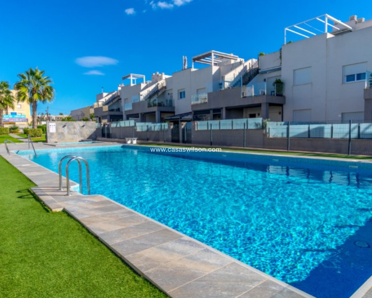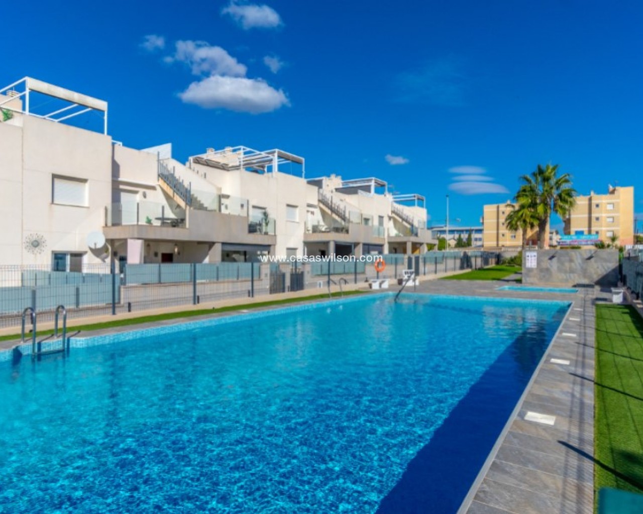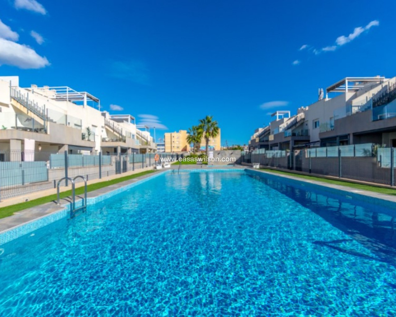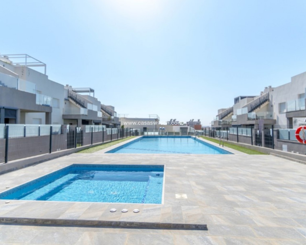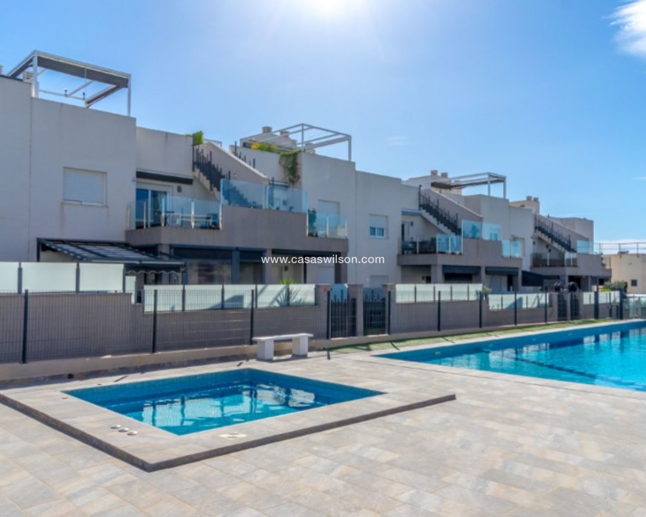 Welcome to this beautiful and very well-maintained flat in a perfect location in the popular area of Solpark 2 in Aguas Nuevas (Sector 25). The home offers two bedrooms, two bathrooms and a well-thought-out floor plan with beautiful patios on both sides, so you can enjoy the sun all day.The west-facing terrace at the entrance area offers afternoon and evening sun - ideal for relaxing moments after a day in the sun. The east/south facing garden offers morning sun until late in the afternoon and has a partially covered terrace with pull-down awnings for extra comfort. From here you have direct access to the beautiful common area with large pool and jacuzzi, the shower with hot water is a perfect place for relaxing.Inside you will find a home that appears almost new, with a high standard and several modern comforts:Heating cables in the kitchen, living room and both bathroomsAir conditioning in ducts (duct system)Limescale remover installed on the water inletMaintained air conditioning and water heater by professional technician if needed.The flat is sold fully furnished and equipped, ready to move straight into.In the basement you will find both a private parking space and a spacious storage room - ideal for storing bicycles, golf equipment and more.This is a property that combines comfort, quality and a sunny location - perfect as both a holiday home and a year-round residence.SOLPARKSolpark II is a popular urbanisation was ready for occupancy in 2019, here there are only 40 units,State-of-the-art apartments with a high standard and beautiful, child-friendly communal areas, lovely swimming pool, jacuzzi and green areas.Walking distance to grocery store, cafes and restaurants and not to forget the sports hall and the well-known Friday market.Just a short bike ride away from several idyllic sandy beaches as well as the centre of Torrevieja.Just a few minutes walk you will find the protected Natural Park of Laguna La Mata, here there are marked trails and cycling (for example, hiking trails that go around the lake) very nice for a quiet excursion or photo trip, it is a nature reserve of very high ecological value: wetlands that are important for many species of birds, especially in migration, nesting and wintering, For bird enthusiasts, there are several good places in the park where you can get nice vantage points for bird watching.Alicante airport is only 35 minutes away by car.There are many golf courses within 15 minutes drive.TorreviejaTorrevieja is a city in the Alicante province in the Comunidad Valenciana region of Spain. The city is a popular tourist destination located about 40 minutes drive from the big city of Alicante and the airport. Torrevieja was originally a small fishing village, and is today one of Europe's largest salt producers, Torrevieja has previously been called the 'salt city', but in recent years the city has also been named 'the sports city', this because of the large sports arenas that have been built in recent years. As a result of this fantastic investment, Torrevieja became one of four organising cities during the Women's Handball World Championship in 2021.When you live in Torrevieja, you are within a short walking distance to white, elongated sandy beaches with the 'blue flag' stamp, as an indication of, among other things, high water quality. In the immediate area and preferably 'right outside' the door you will find a large selection of local shops, restaurants, cafes, shopping centres, green parks, the harbour and the promenade. If you are looking for an area with life all year round and a healthy microclimate with 320 days of sunshine a year, this may be for you.Economy:Asking price 269.000€ + feesCommon expenses: 470€ x 2 per yearRefuse collection fee: 55,10€ x 2 per yearTax flat: 166,23€ per yearTax Garage: 45,46€ per year