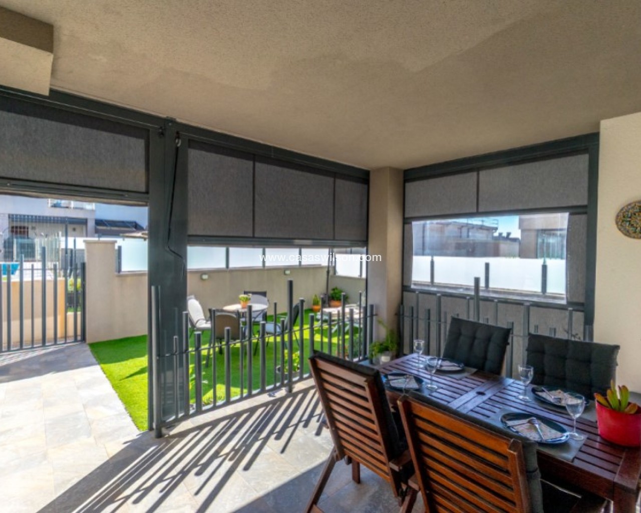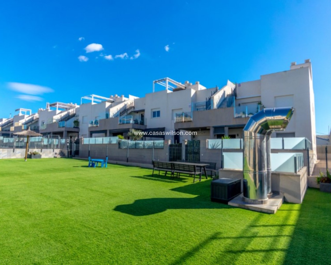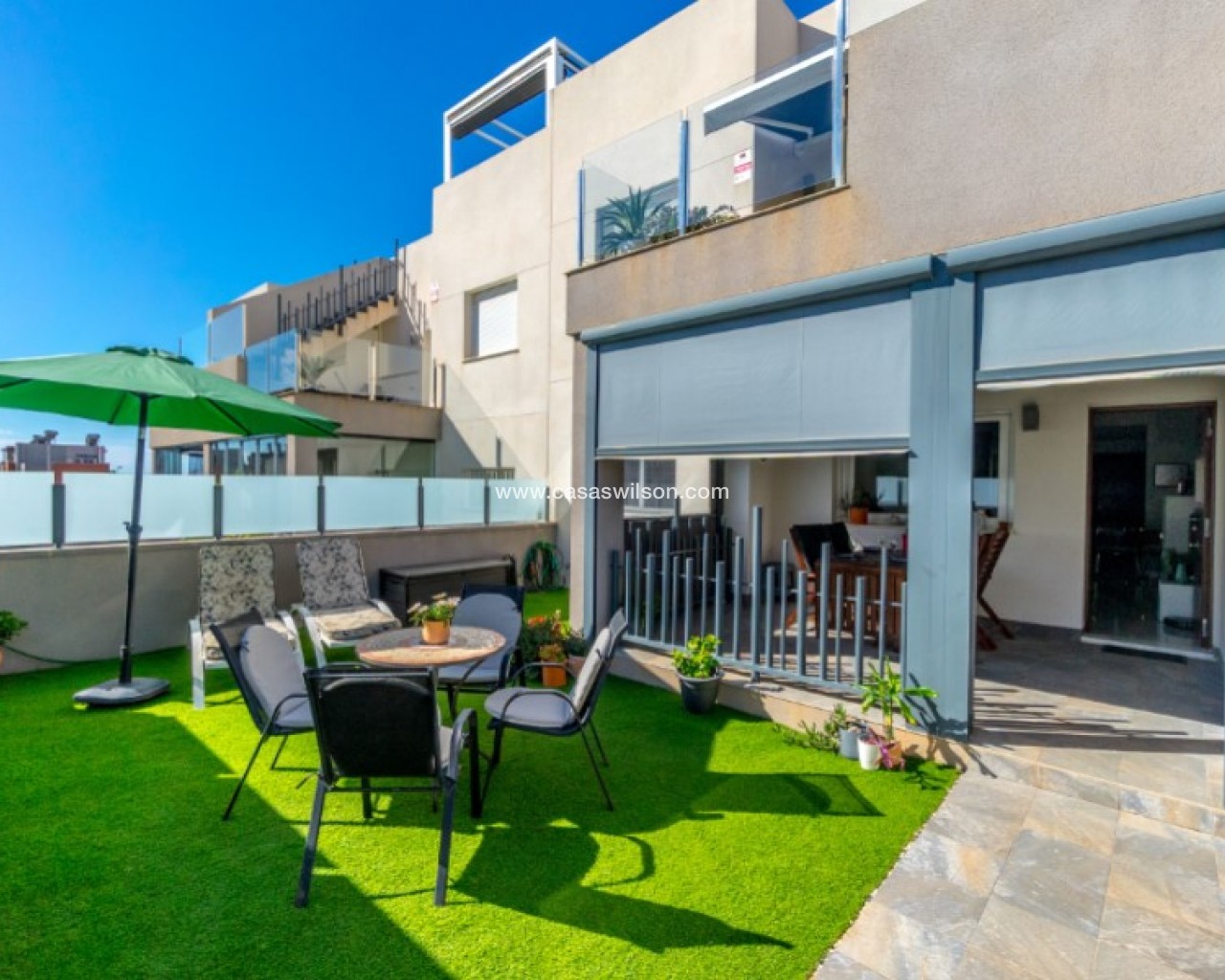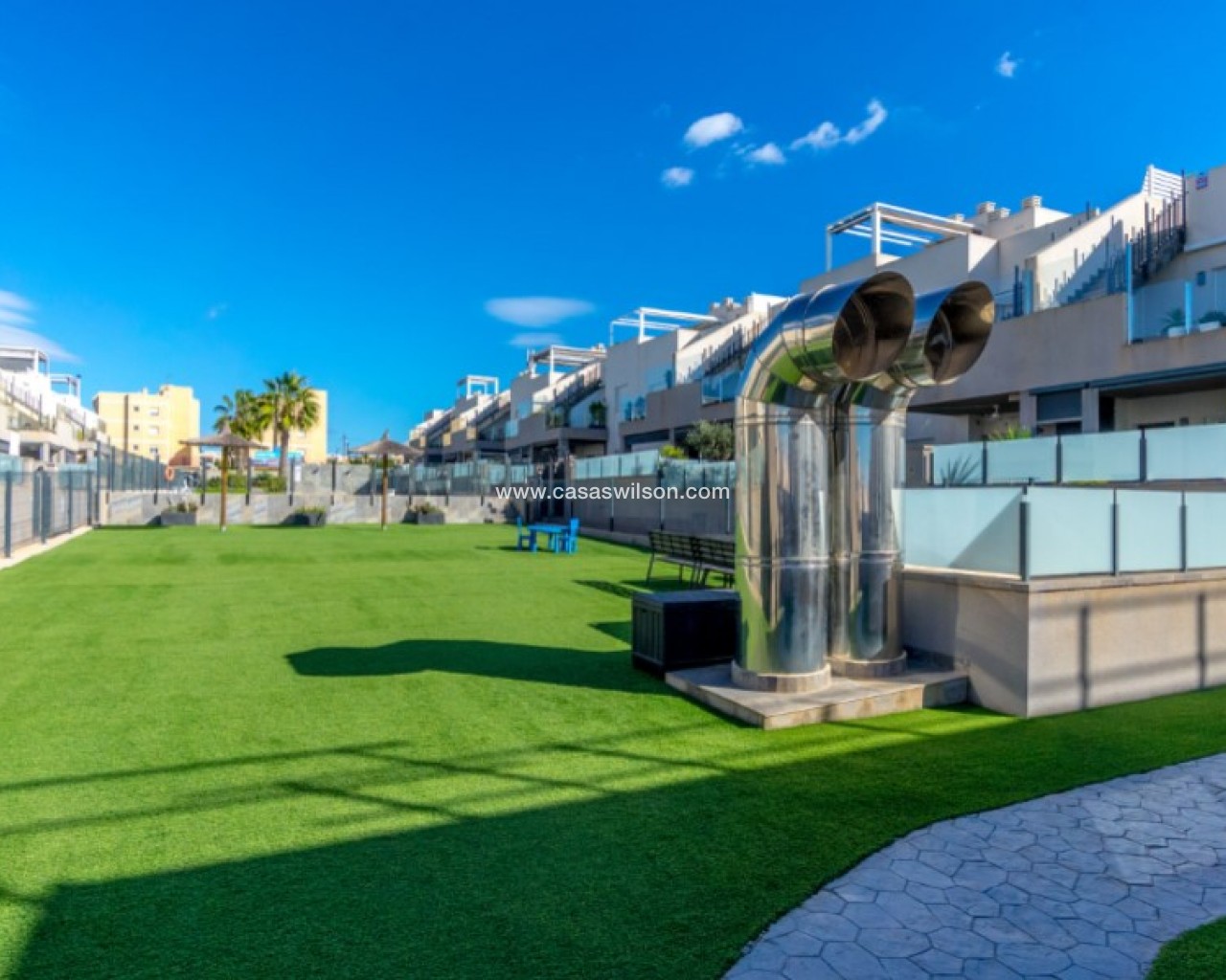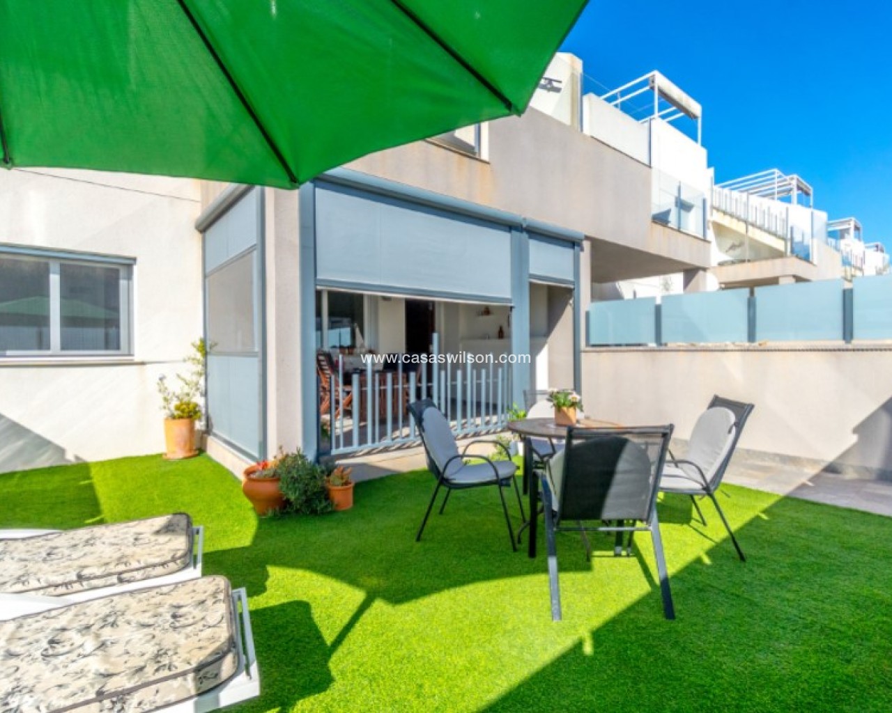 Welcome to this beautiful and very well-maintained flat in a perfect location in the popular area of Solpark 2 in Aguas Nuevas (Sector 25). The home offers two bedrooms, two bathrooms and a well-thought-out floor plan with beautiful patios on both sides, so you can enjoy the sun all day.The west-facing terrace at the entrance area offers afternoon and evening sun - ideal for relaxing moments after a day in the sun. The east/south facing garden offers morning sun until late in the afternoon and has a partially covered terrace with pull-down awnings for extra comfort. From here you have direct access to the beautiful common area with large pool and jacuzzi, the shower with hot water is a perfect place for relaxing.Inside you will find a home that appears almost new, with a high standard and several modern comforts:Heating cables in the kitchen, living room and both bathroomsAir conditioning in ducts (duct system)Limescale remover installed on the water inletMaintained air conditioning and water heater by professional technician if needed.The flat is sold fully furnished and equipped, ready to move straight into.In the basement you will find both a private parking space and a spacious storage room - ideal for storing bicycles, golf equipment and more.This is a property that combines comfort, quality and a sunny location - perfect as both a holiday home and a year-round residence.SOLPARKSolpark II is a popular urbanisation was ready for occupancy in 2019, here there are only 40 units,State-of-the-art apartments with a high standard and beautiful, child-friendly communal areas, lovely swimming pool, jacuzzi and green areas.Walking distance to grocery store, cafes and restaurants and not to forget the sports hall and the well-known Friday market.Just a short bike ride away from several idyllic sandy beaches as well as the centre of Torrevieja.Just a few minutes walk you will find the protected Natural Park of Laguna La Mata, here there are marked trails and cycling (for example, hiking trails that go around the lake) very nice for a quiet excursion or photo trip, it is a nature reserve of very high ecological value: wetlands that are important for many species of birds, especially in migration, nesting and wintering, For bird enthusiasts, there are several good places in the park where you can get nice vantage points for bird watching.Alicante airport is only 35 minutes away by car.There are many golf courses within 15 minutes drive.TorreviejaTorrevieja is a city in the Alicante province in the Comunidad Valenciana region of Spain. The city is a popular tourist destination located about 40 minutes drive from the big city of Alicante and the airport. Torrevieja was originally a small fishing village, and is today one of Europe's largest salt producers, Torrevieja has previously been called the 'salt city', but in recent years the city has also been named 'the sports city', this because of the large sports arenas that have been built in recent years. As a result of this fantastic investment, Torrevieja became one of four organising cities during the Women's Handball World Championship in 2021.When you live in Torrevieja, you are within a short walking distance to white, elongated sandy beaches with the 'blue flag' stamp, as an indication of, among other things, high water quality. In the immediate area and preferably 'right outside' the door you will find a large selection of local shops, restaurants, cafes, shopping centres, green parks, the harbour and the promenade. If you are looking for an area with life all year round and a healthy microclimate with 320 days of sunshine a year, this may be for you.Economy:Asking price 269.000€ + feesCommon expenses: 470€ x 2 per yearRefuse collection fee: 55,10€ x 2 per yearTax flat: 166,23€ per yearTax Garage: 45,46€ per year
