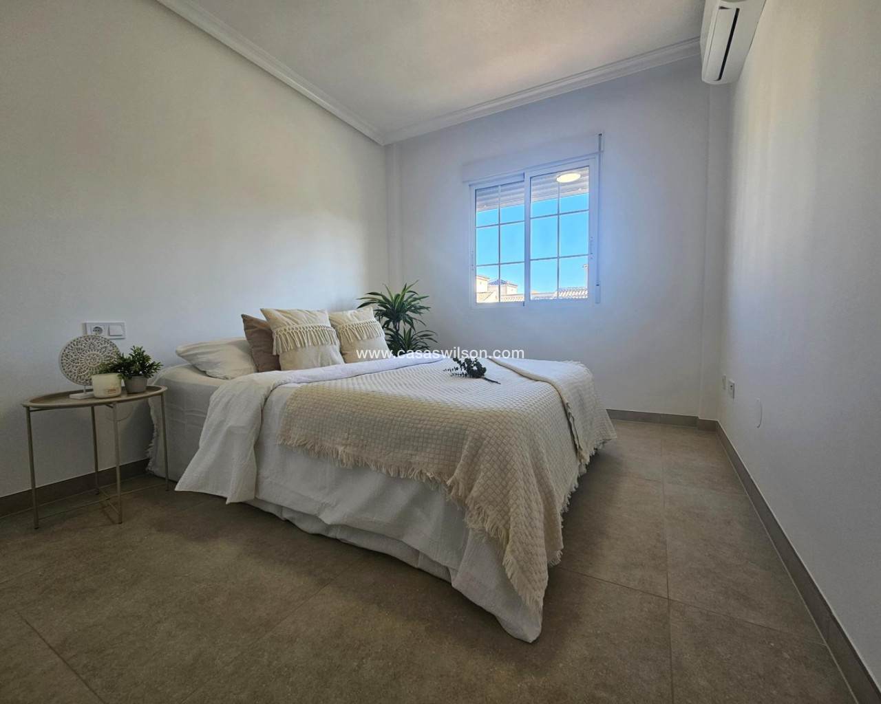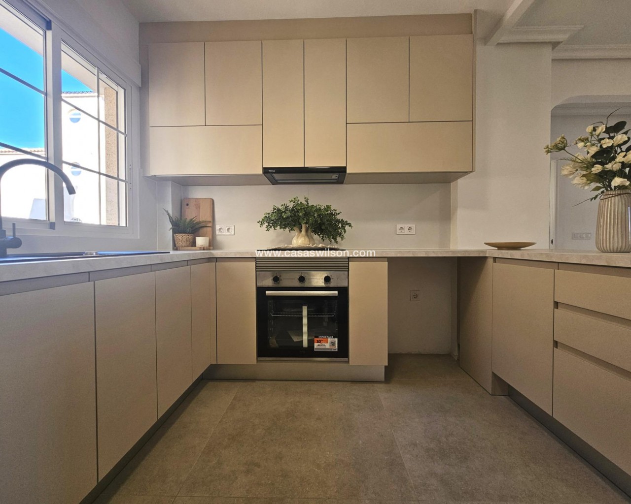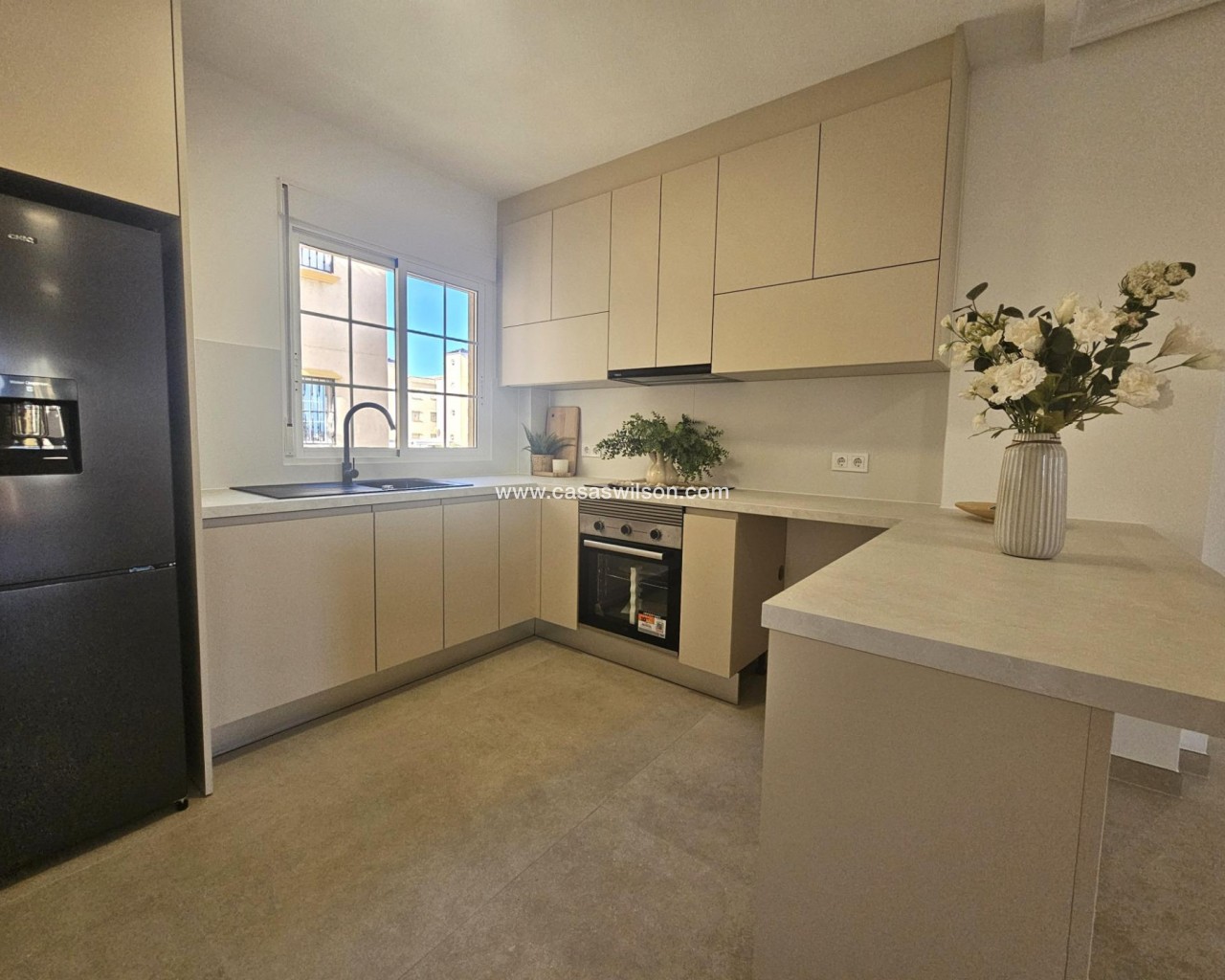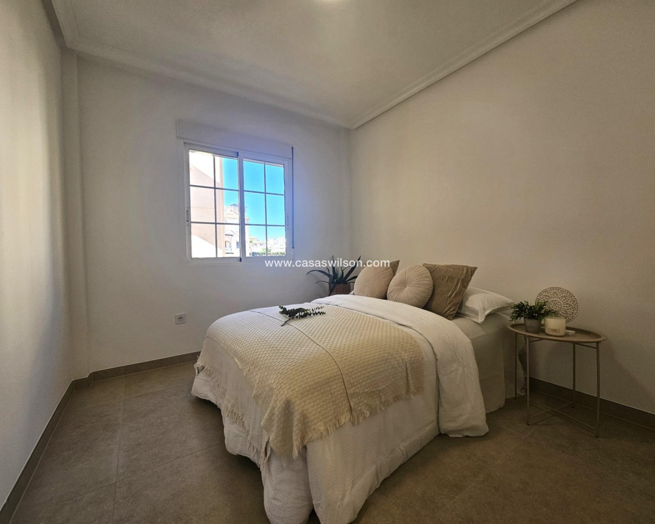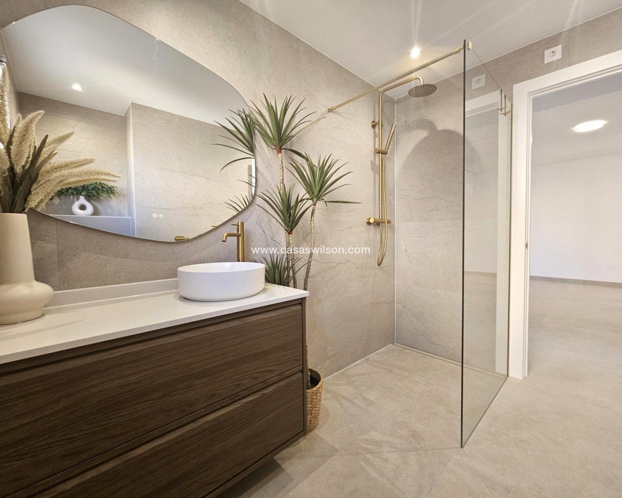 Discover a remarkable opportunity to own a beautifully renovated apartment that combines modern living in a traditional setting. This stunning first-floor apartment showcases the perfect blend of style and functionality. The living space is bathed in natural light and flows perfectly into the brand new kitchen with breakfast bar waiting to prepare delicious meals. The property comprises of 2 bedrooms, each including fitted wardrobes and 1 fully renovated bathroom with walk-in shower. The cabinet includes draws and a mirror with LED backlight and anti-condensation function. The golden finishes make this stunning bathroom really stand out. The kitchen comes with new white goods and a new electric waterheater. The East facing balcony offers views of the surrounding areas and gives the opportunity for al-fresco dining and your morning coffee, making sure you enjoy the mediteranean climate tot he maximum. Conveniently located just 2.8 kilometers from stunning blue flag beaches, you'll have quick access to sun-soaked shores and refreshing sea breezes. The area is also just a short stroll away from supermarkets and essential amenities, ensuring that everything you need is within easy reach. Alicante airport is only 50 minutes away by car. The property will be sold unfurnished giving the new owners the opportunity to put their own stampo on it and make it a real home. Features: •Hot/cold aircon in living room and master bedroom •Brand new appliances •New kitchen •New bathrooms •New floor •New doors and frames •New sockets and plugs •Open distribution •LED spotlights •Freshly painted •New mechanism in shutters •New waterheater Dont miss this unique opportunity. Schedule a viewing today and step into your new dream apartment.