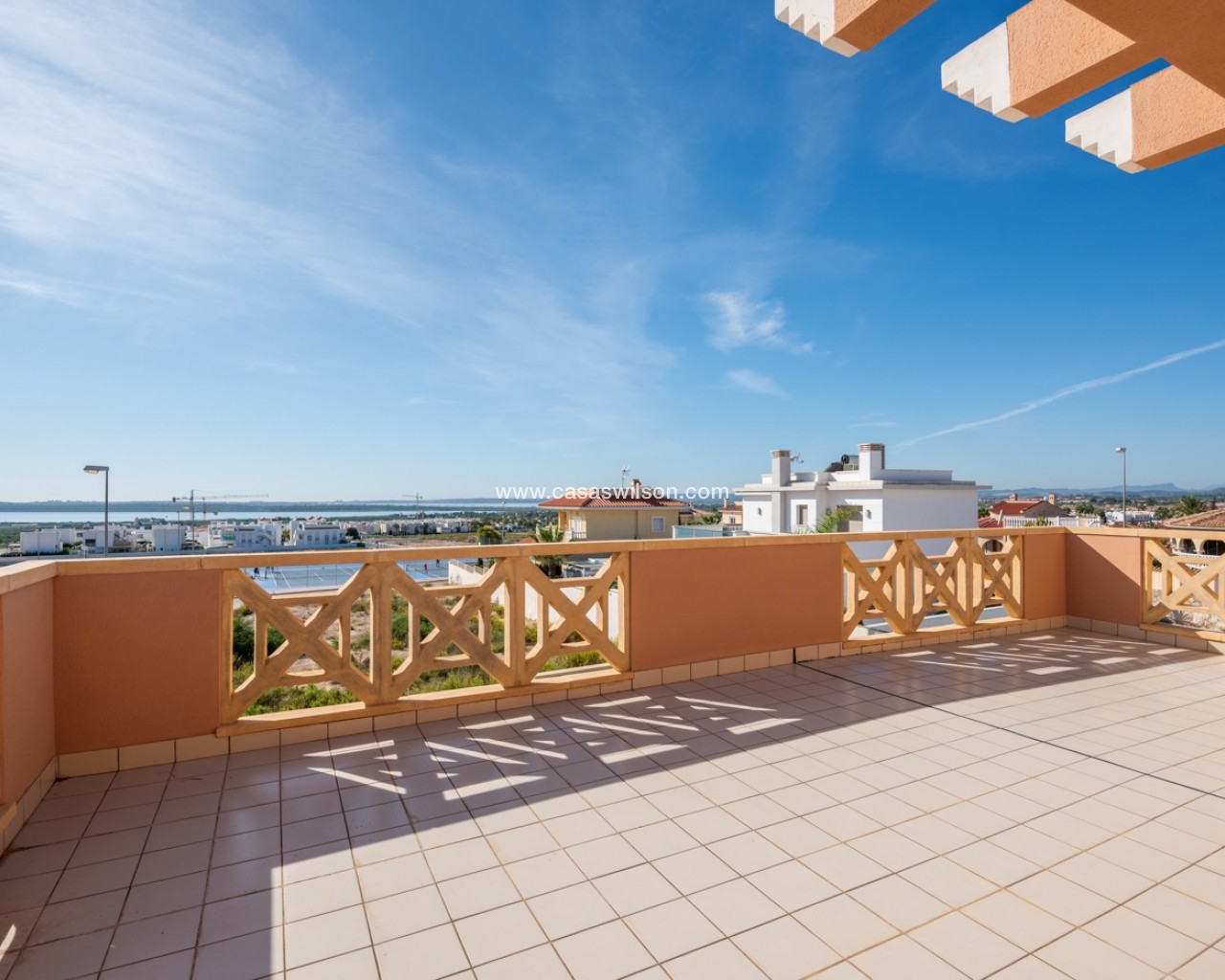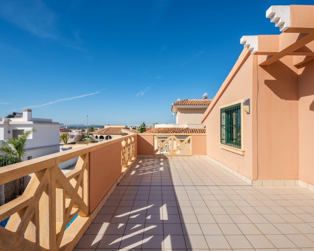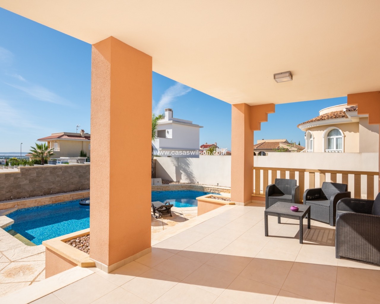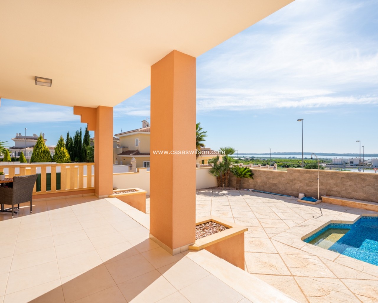This lovely 4 bedroom villa is located in Ciudad Quesada with amazing views over the salt lake. The villa has a living size of 192 sqm and is set over two floors. It consists of 4 double bedrooms, 2 bathrooms, a modern kitchen and a large living room with a dining area and lounge area. The villa also as a storage / utility room. The villa is equipped with air condition. Outdoor areaThe villa is set on a south facing plot of 546 sqm. It has a lovely tiled garden where you can find a swimming pool and a lot of space for outdoor seating areas and sun beds. By the entrance there is also a large covered terrace. At the back of the house there is a large parking area with space for several cars. The villa also has a large terrace in the first floor with amazing views over the salt lakes and Torrevieja. AreaCiudad Quesada is a cozy and popular place on the Costa Blanca coast. Here you will find shops, restaurants, cafes, bars, pharmacies, banks, hairdressers, medical and dental services and much more. In the main street it has recently been built a cozy shopping mall with several shops. Ciudad Quesada also offers several activities for the whole family, such as the famous La Marquesa golf course, bowling, mini golf, tennis courts, soccer fields, gyms, spas, seasonal water park and much more.