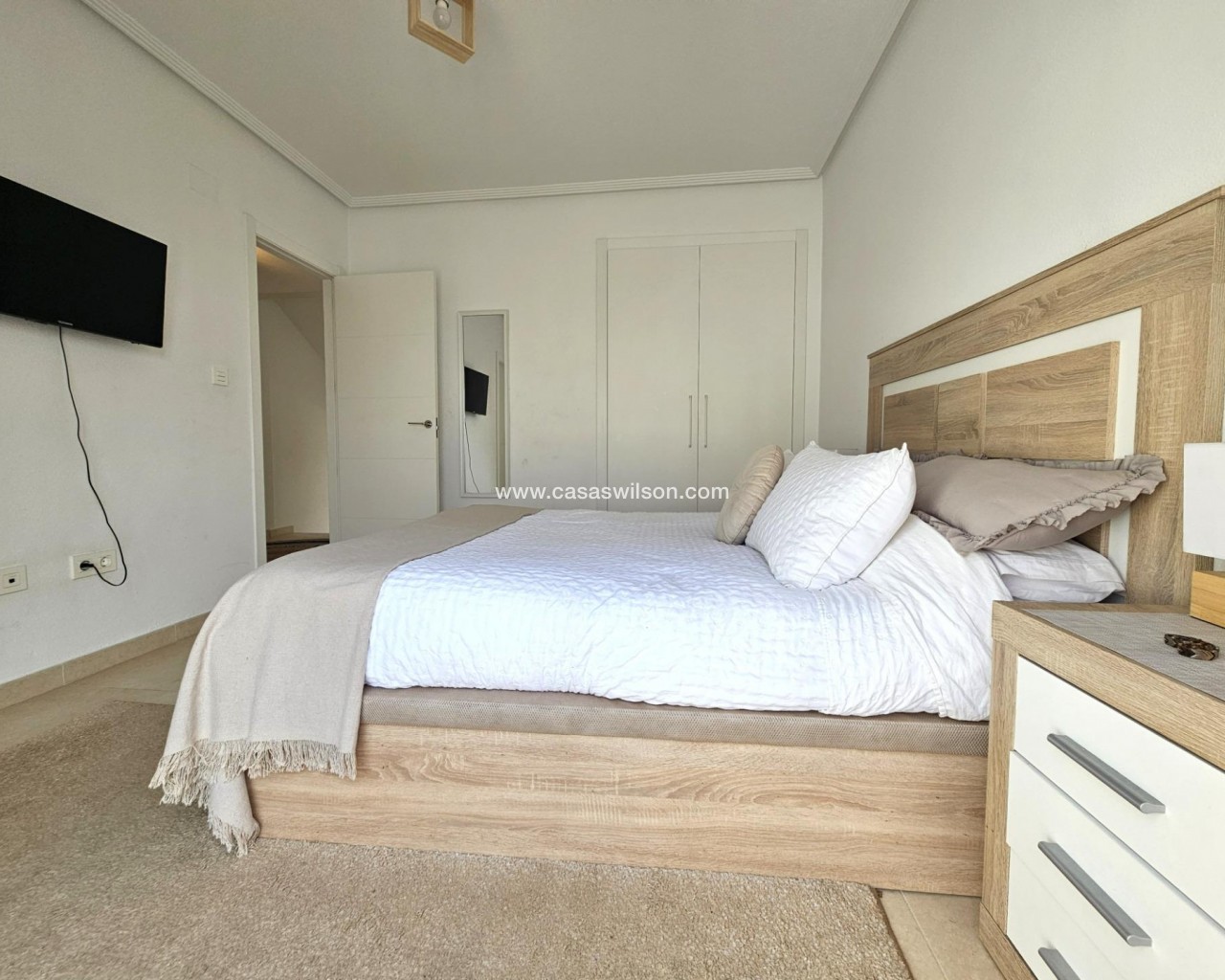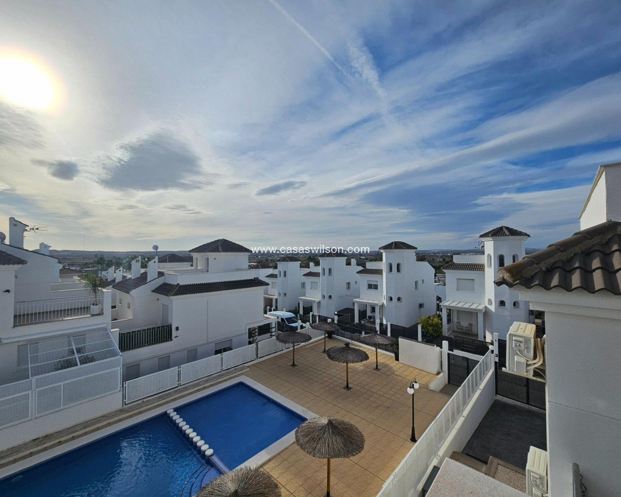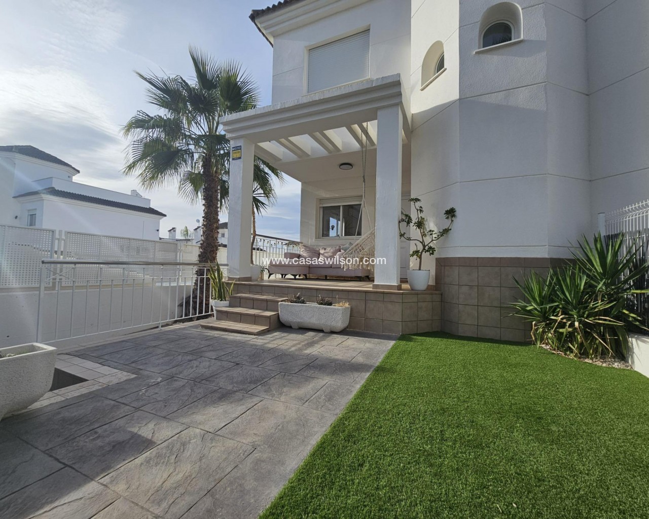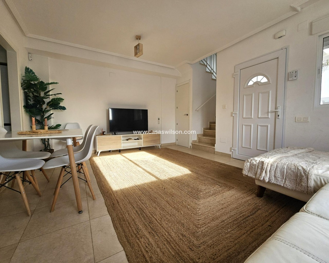 Welcome to your dream home in San Fulgencio, Alicante! This enchanting semi detached villa offers the perfect blend of comfort and luxury. With 3 bedrooms and 3 bathrooms, this bright and inviting residence is ideal for families or those who cherish spacious living. The independent kitchen is fully equipped, offers plenty of storage and has access to a little back patio. Each room comprises of hot and cold air conditioning, ensuring a pleasant atmosphere all year round. The highlight of this property is its stunning outdoor areas that invite relaxation and entertainment amidst magnificent panoramic views. A low maintenance garden area with artifical grass, terrace and lovely palmtrees and fruitplants are perfect so sip your morning coffee. The master bedroom on the first floor gives access to a large south east facing terrace with views at the communal pool and the mountains in the distance. The solarium offers 25M² for hosting an evening gathering under the stars or all day sunbathing. Further we have 2 en suite bathrooms and 1 family bathroom. Under the stairs we can find a confortable storage room. Located just 5km from pristine beaches, you can enjoy sun-soaked days by the sea whenever you desire. Plus, being close to local amenities means everything you need is within easy reach. Meticulously maintained and in good condition, this home promises a worry-free move-in experience. Don’t miss this opportunity to own a piece of paradise—schedule your viewing today and step into a brighter lifestyle!