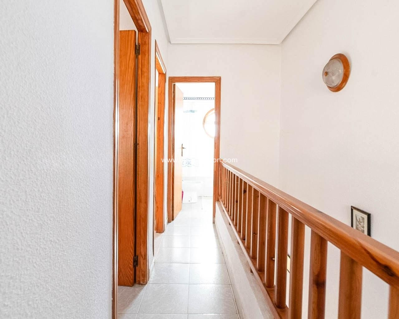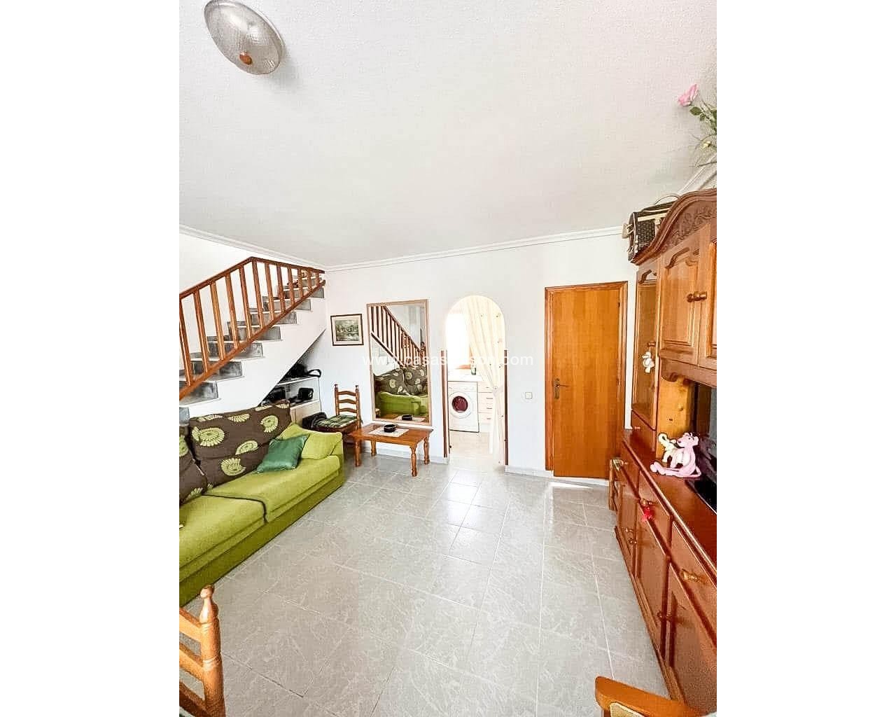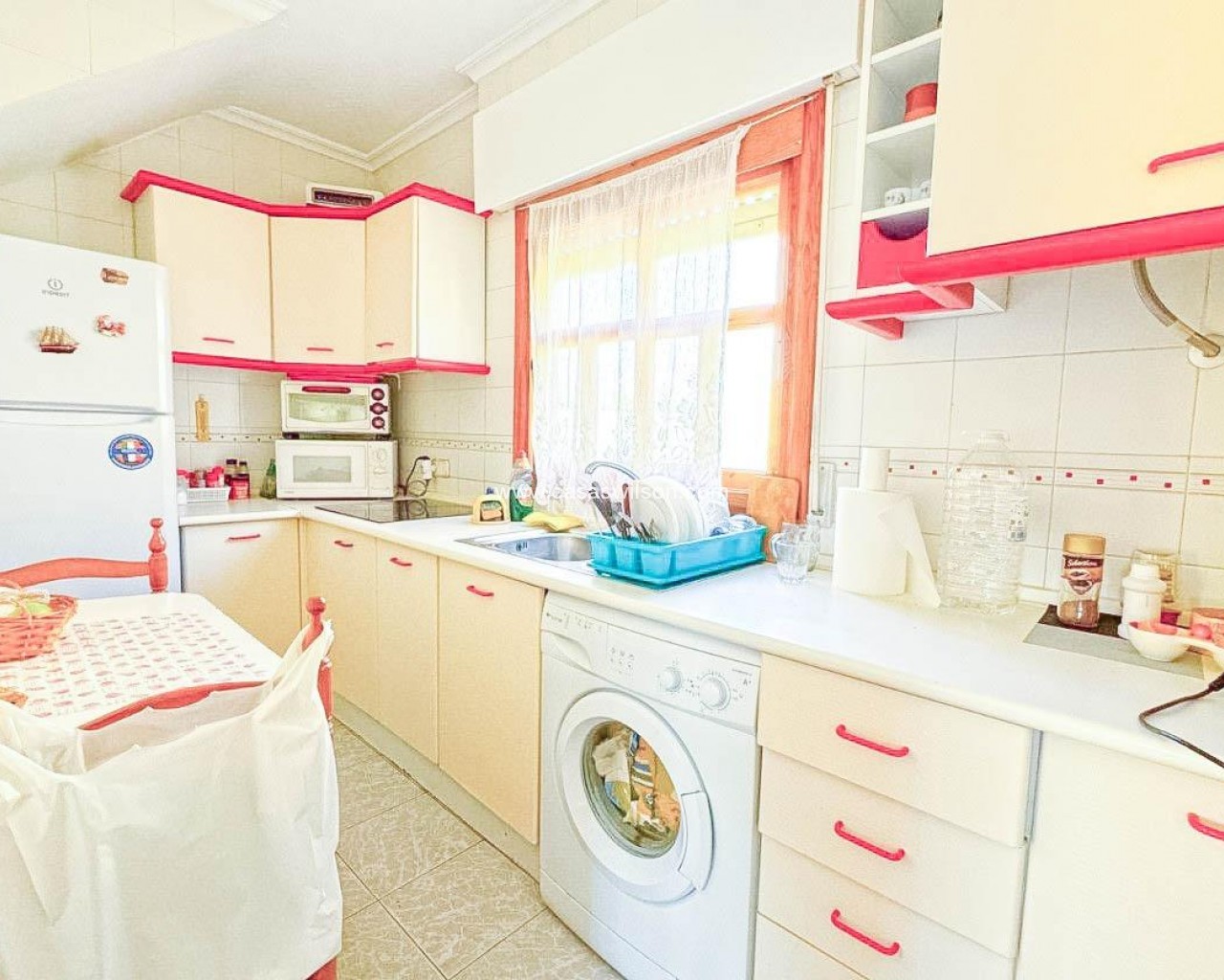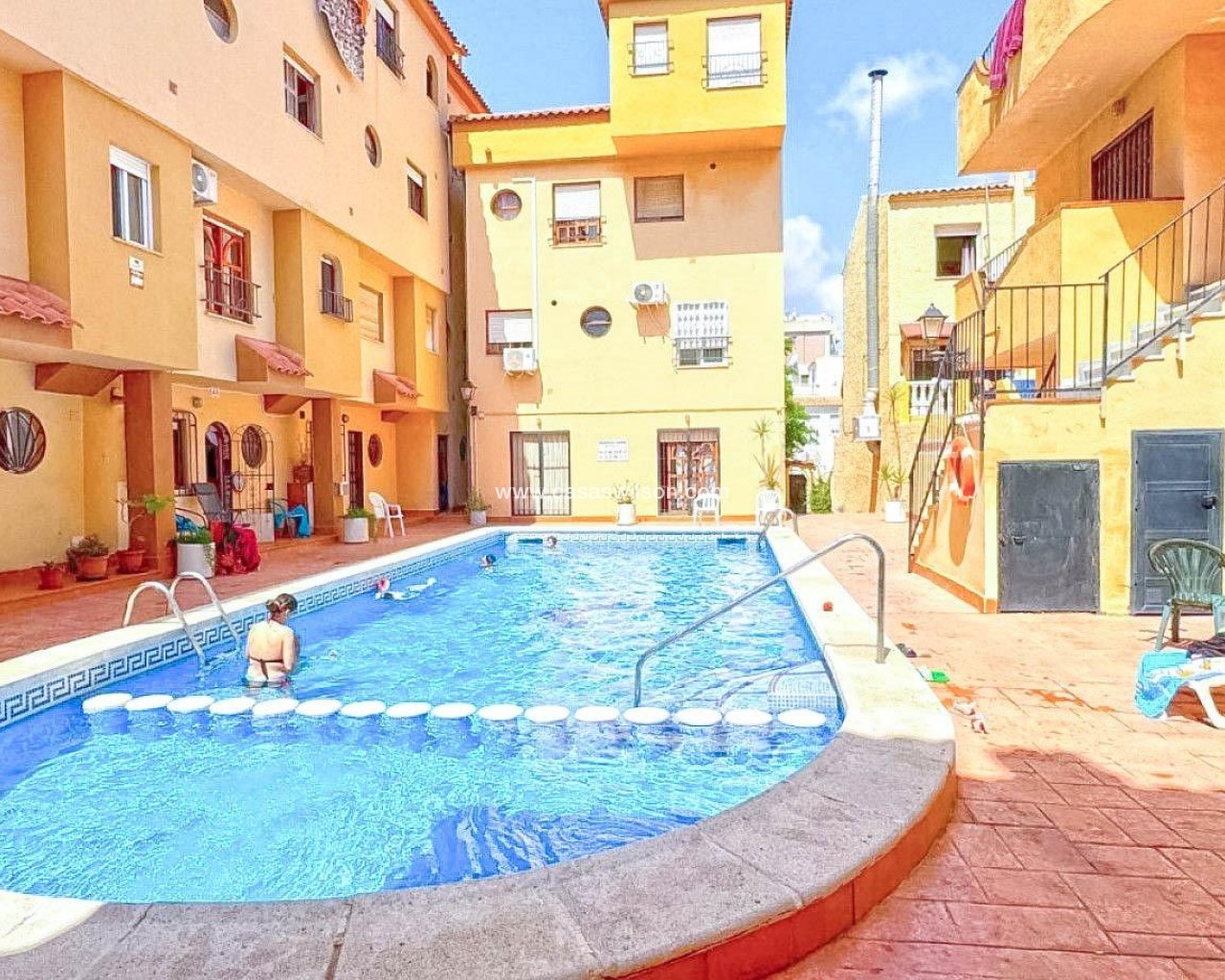 For sale a cozy and well-maintained duplex bungalow located in Nueva Torrevieja, just 1 km from the beach. An excellent choice both for holidays and for year-round living in one of the most peaceful and desirable areas of the city. Main features: - 76 m² built (75 m² usable) - 2 spacious bedrooms with double beds - 2 bathrooms - East and west orientation - Air conditioning - Beautiful communal pool in a closed, well-kept urbanization Layout: Ground floor: - Separate fully equipped kitchen - Spacious living room - Bathroom Second floor: - Two large, bright bedrooms - Second bathroom