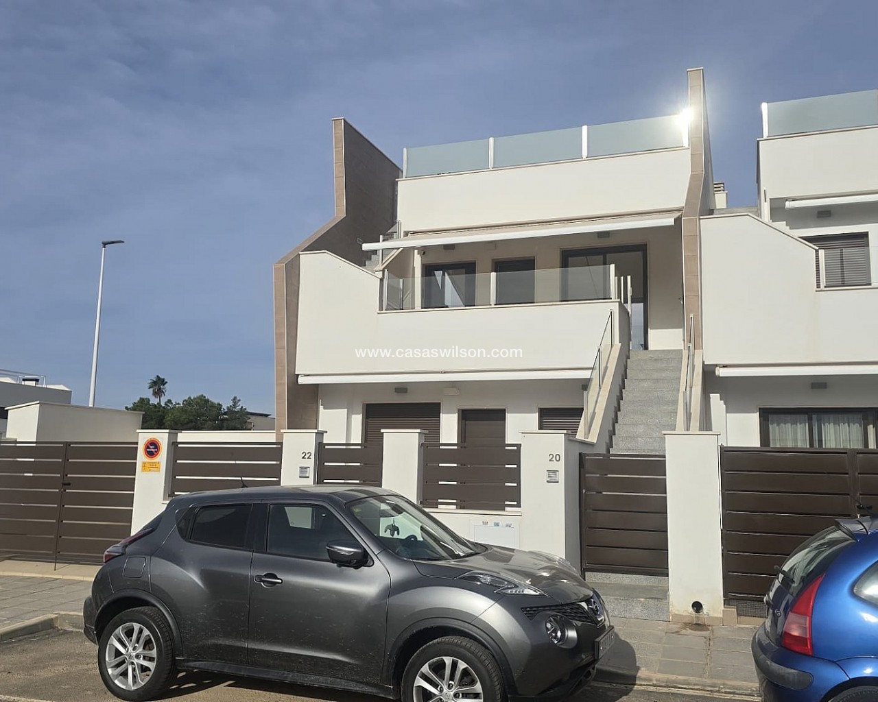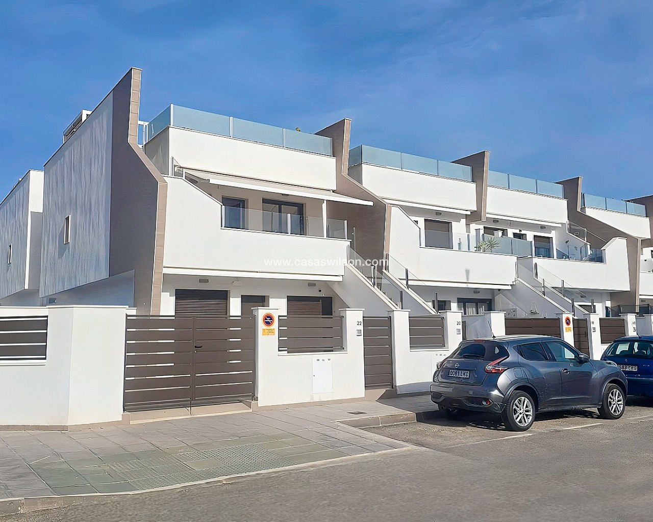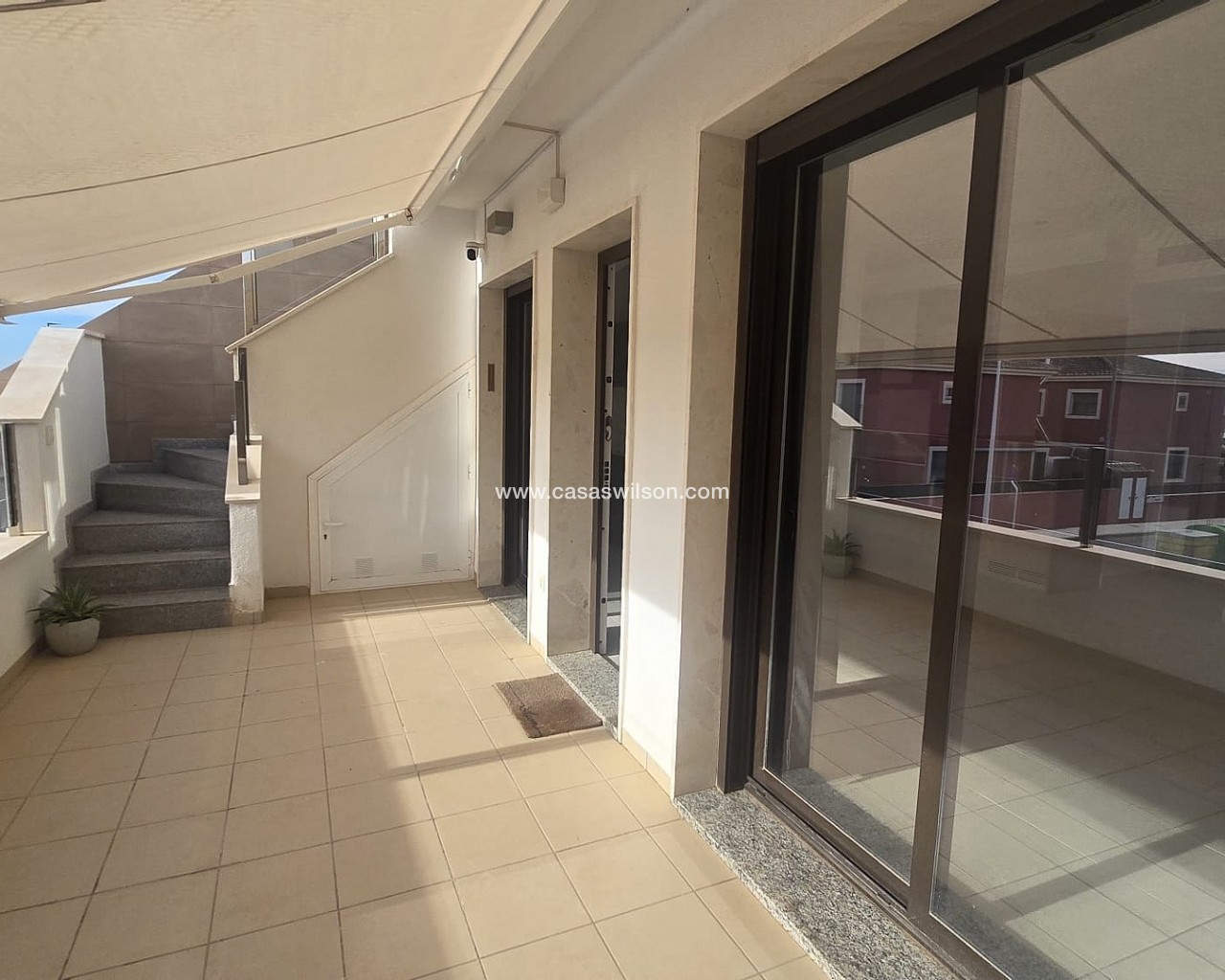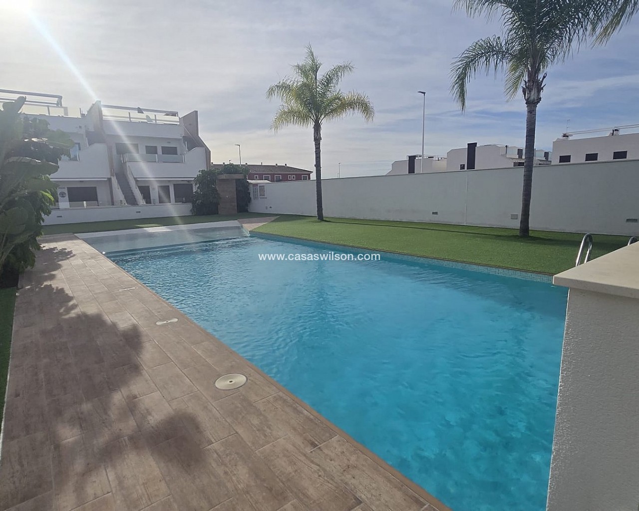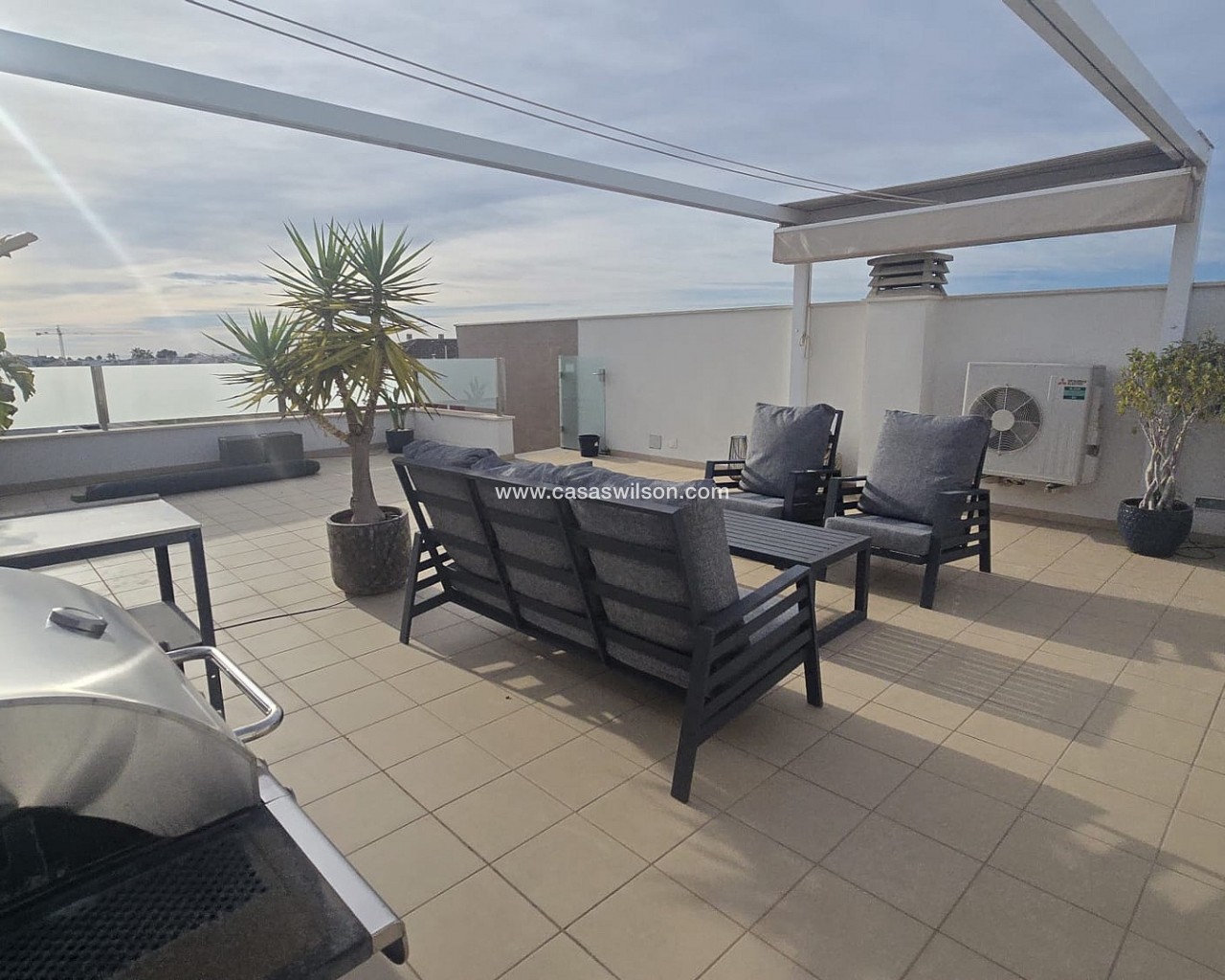 Corner Penthouse within walking distance of the lively center. Spacious corner house with solarium near the center of Pilar de la HoradadaThis well-maintained corner house with solarium is within walking distance of the center of Pilar de la Horadada and offers comfortable living in a pleasant location.The bright living room is built across the width of the house, allowing for abundant natural light. The open-plan kitchen is equipped with various built-in appliances and flows seamlessly into the living area.The house features two spacious bedrooms, both with built-in wardrobes. The master bedroom has its own ensuite bathroom, and there is also a second, full bathroom.Behind the ensuite bedroom is a patio that is fully enclosed, but with an opening roof. The washing machine and boiler are also neatly concealed in a separate closet.The house is part of a well-maintained community with a communal swimming pool and a bicycle shed with space for three bicycles. There is also a private parking space on the property.Thanks to its location close to all amenities and the town center, this house is suitable for both permanent residence and holiday use.