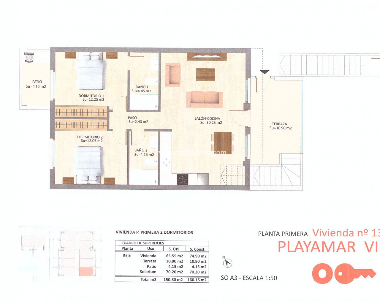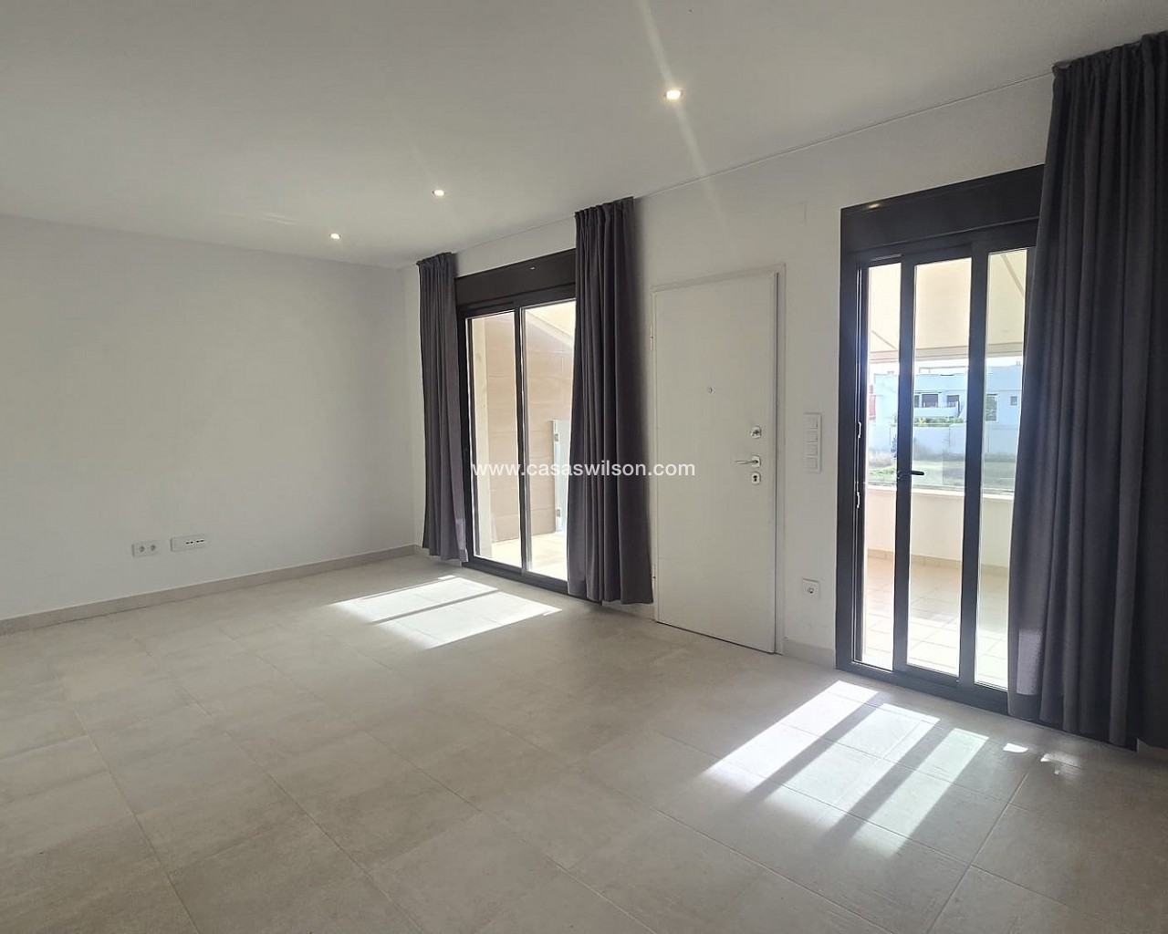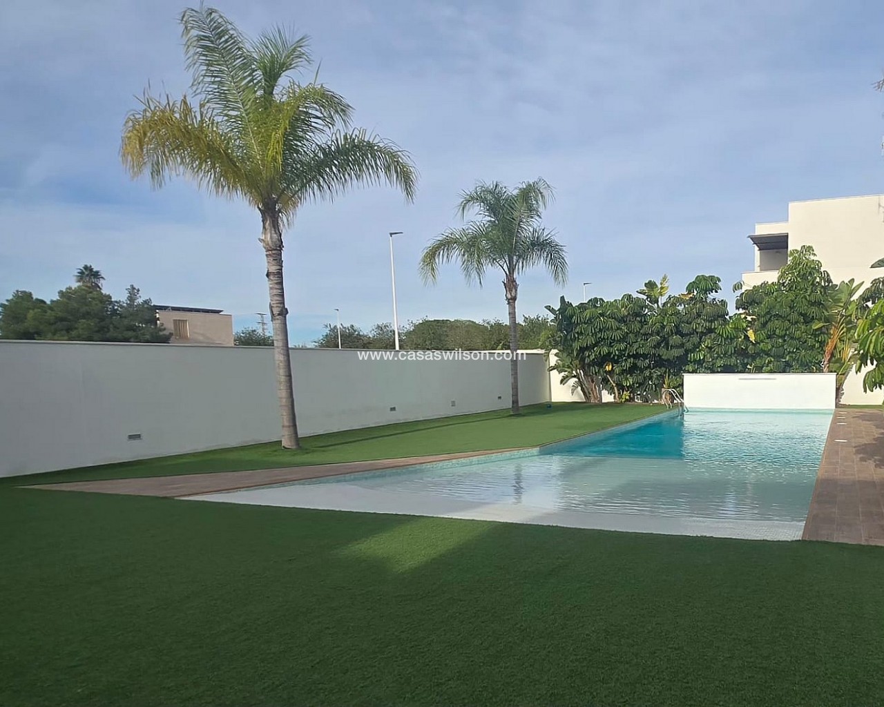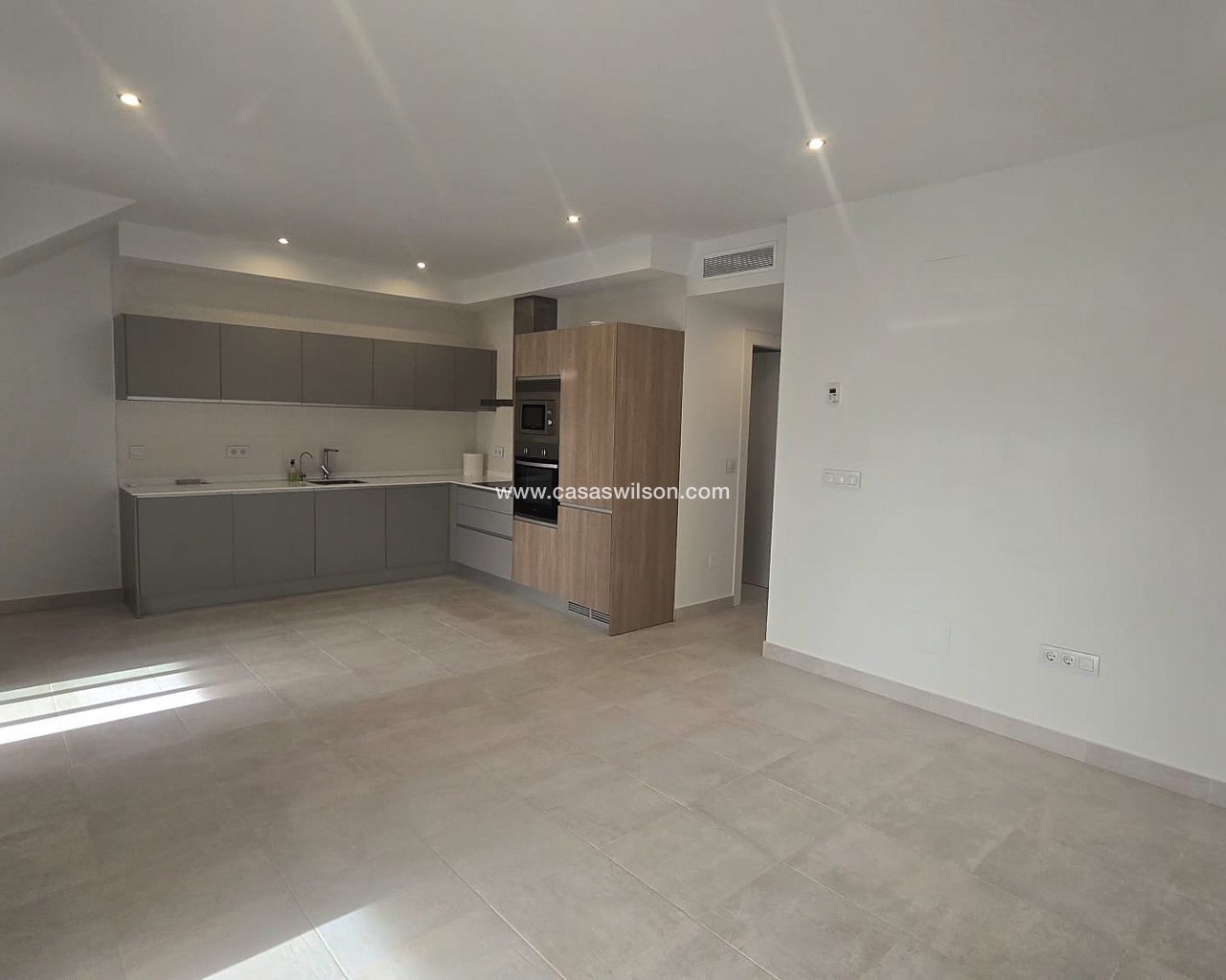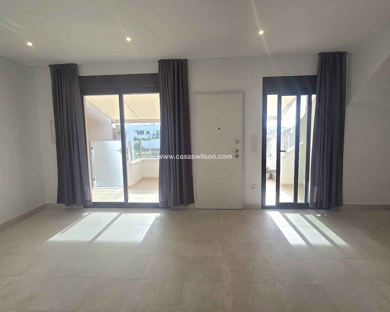 Corner Penthouse within walking distance of the lively center. Spacious corner house with solarium near the center of Pilar de la HoradadaThis well-maintained corner house with solarium is within walking distance of the center of Pilar de la Horadada and offers comfortable living in a pleasant location.The bright living room is built across the width of the house, allowing for abundant natural light. The open-plan kitchen is equipped with various built-in appliances and flows seamlessly into the living area.The house features two spacious bedrooms, both with built-in wardrobes. The master bedroom has its own ensuite bathroom, and there is also a second, full bathroom.Behind the ensuite bedroom is a patio that is fully enclosed, but with an opening roof. The washing machine and boiler are also neatly concealed in a separate closet.The house is part of a well-maintained community with a communal swimming pool and a bicycle shed with space for three bicycles. There is also a private parking space on the property.Thanks to its location close to all amenities and the town center, this house is suitable for both permanent residence and holiday use.