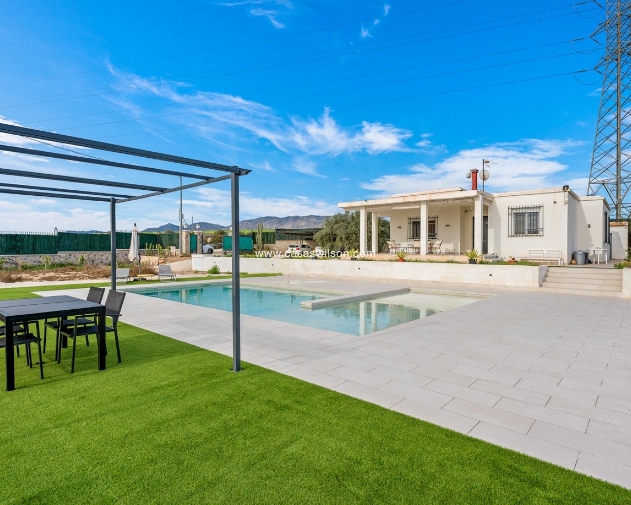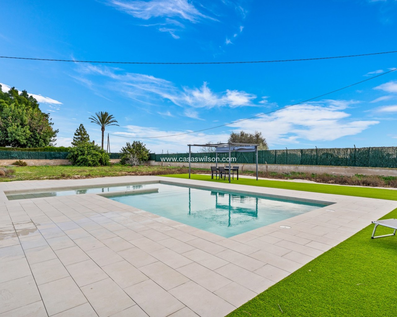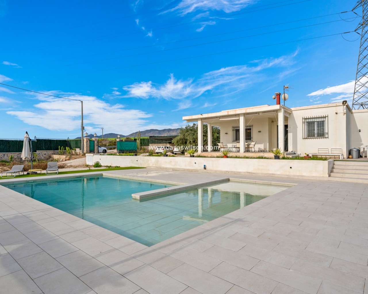 Welcome to this spacious villa on a rustic plot of 3.500 m2, with a great location in Elche, just 5 minutes away from L'Aljub shopping centre, and 1 minute from the highway. The house is build on one level and consists of 3 bedrooms, 2 bathrooms, a spacious kitchen and living room with a fireplace. The house was renovated four years ago. Outside you can enjoy a nice terracce, big garden and a brand new swimming pool that measures 10x8 meters. Here you will also find a barbeque under construction and a separate toilet. The property has irrigation water with a filtering system for domestic use, legal electricity, its own well, and a septic tank. The perfect house for those looking for a spacious and private property, but still wants to be close to shops and all other services. Please contact us for more information, or if you want to arrange a viewing.