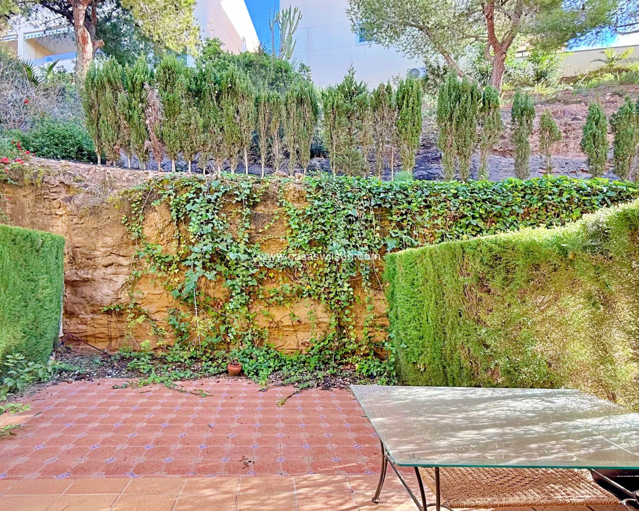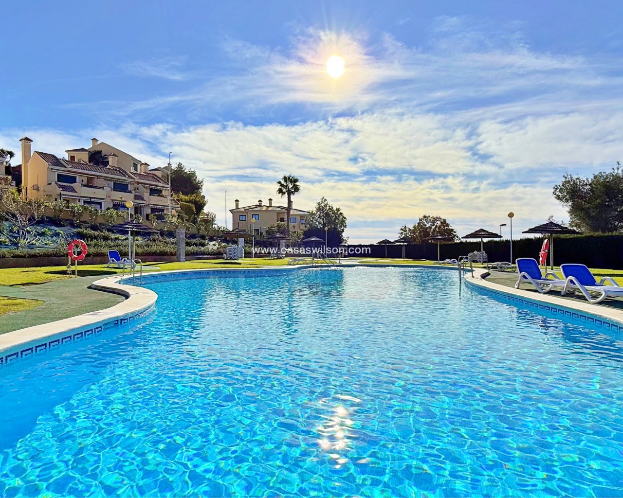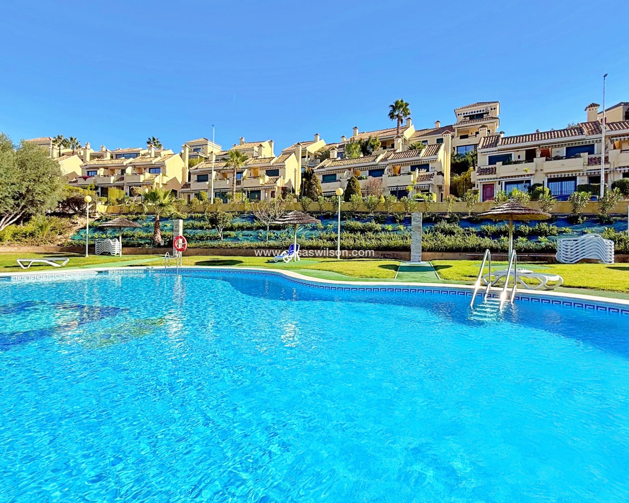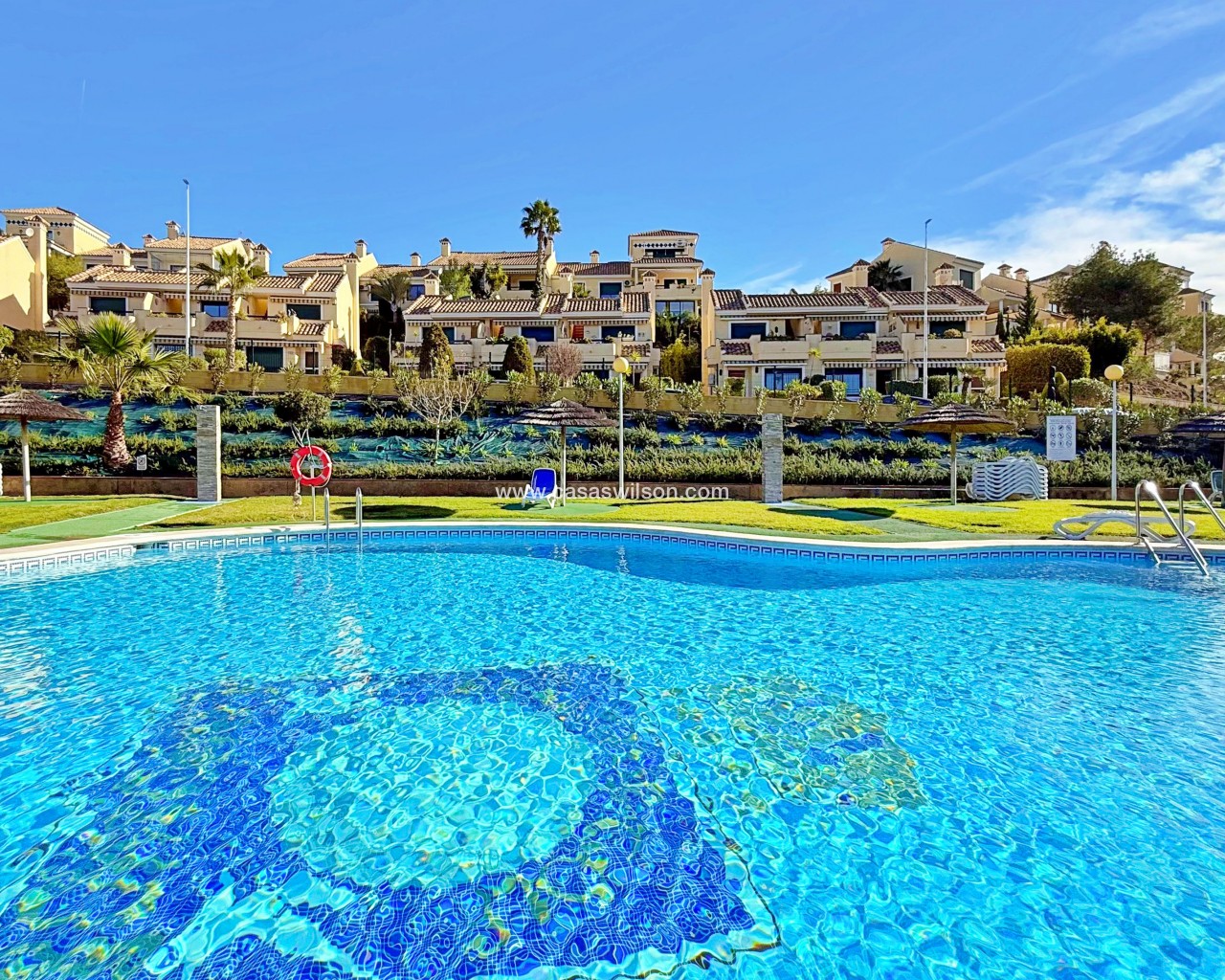 This townhouse in Lomas de Campoamor stands out for its southwest orientation and excellent use of outdoor spaces, designed to enjoy the afternoon sun and sunsets. With 83 m² of living space, it offers a functional layout of 2 bedrooms and 2 bathrooms, is in good condition, and comes equipped with air conditioning.The property's key value lies in its three outdoor areas: a 25 m² garden plot at the entrance, a 15 m² rear porch, and a 33 m² rooftop solarium, offering unobstructed direct views of the golf course.The complex features green areas and a large communal swimming pool. Its location is strategic for golfers and holidaymakers alike: just 500 meters from the Real Club de Golf Campoamor and adjacent to commercial areas with supermarkets and restaurants, offering all amenities within walking distance without sacrificing the tranquility of the surroundings.