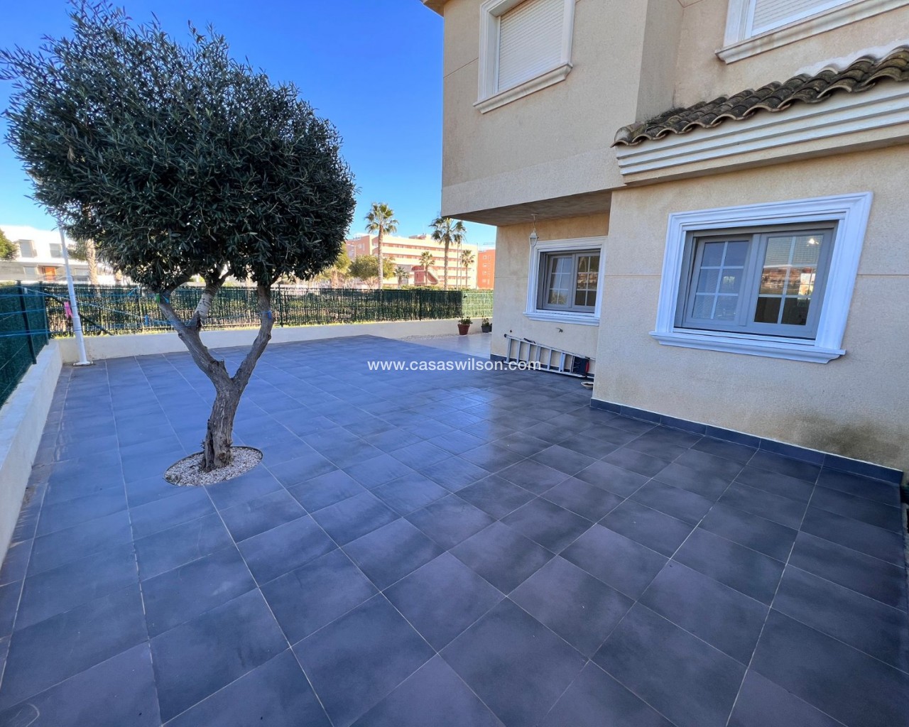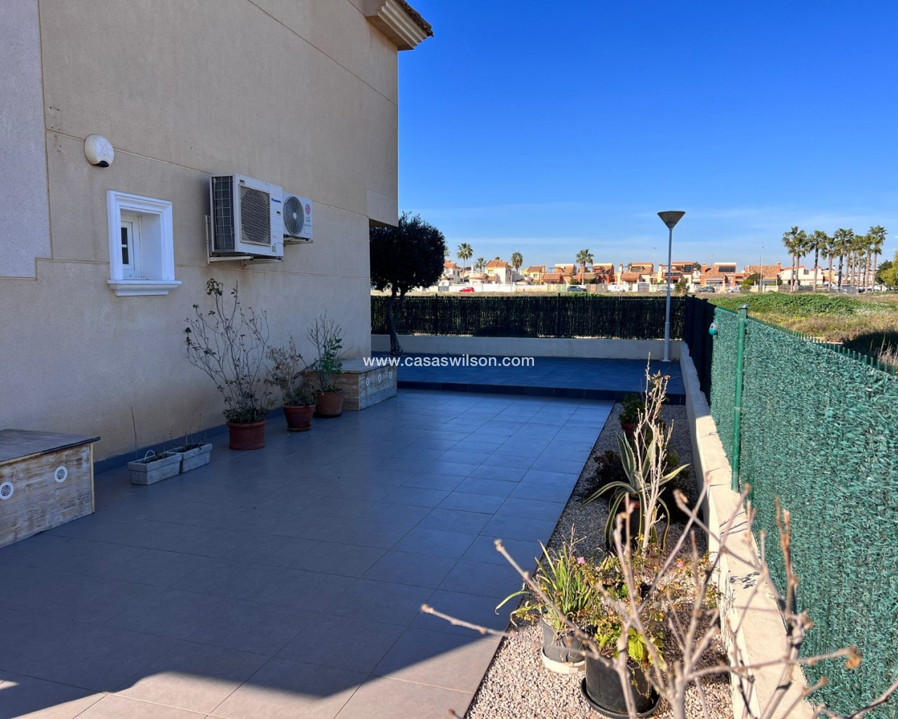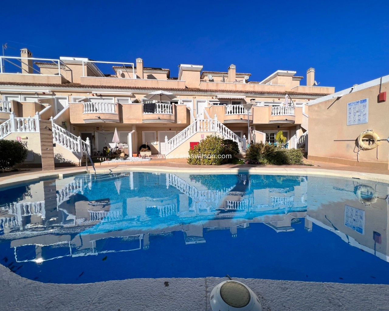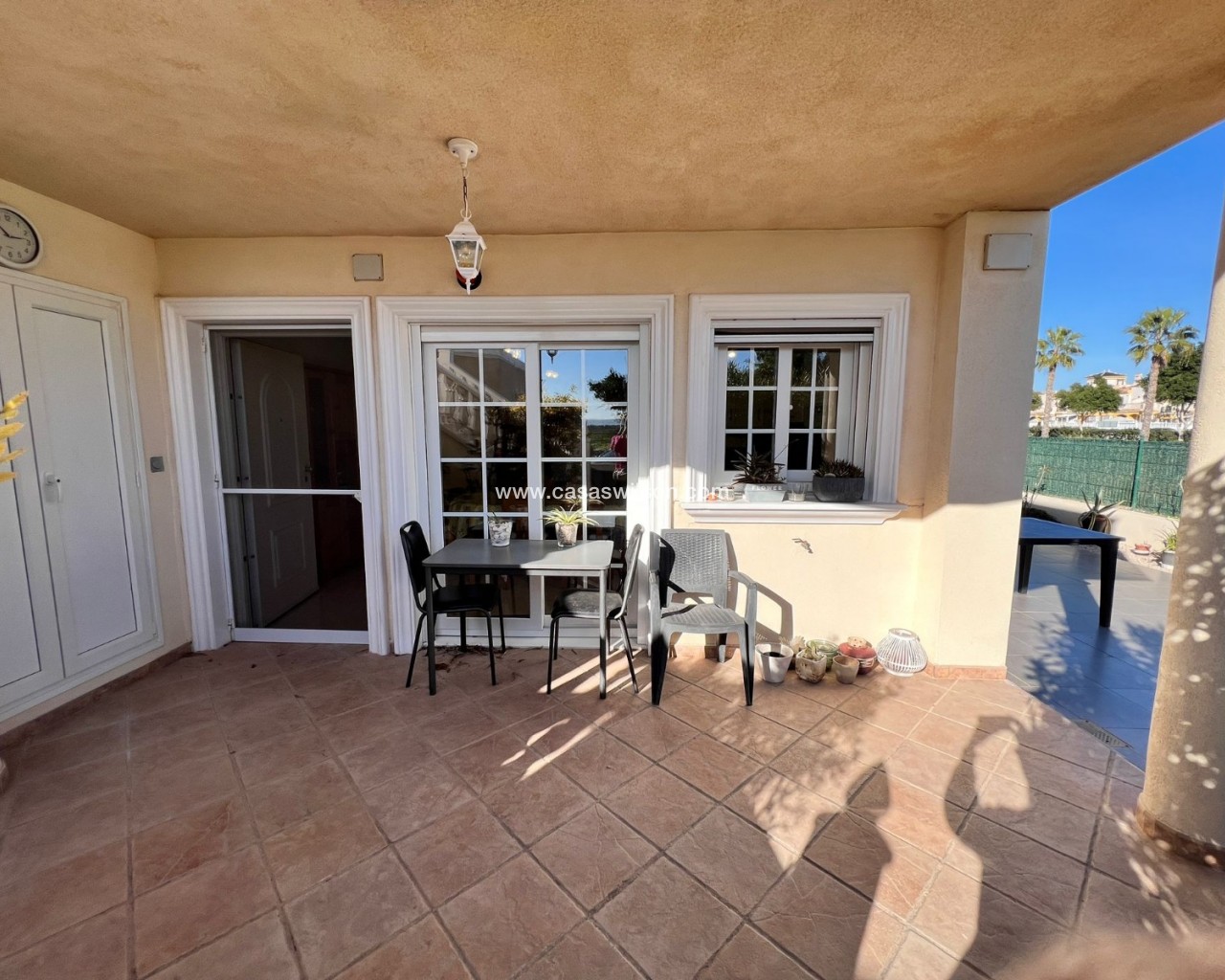 We are pleased to present this spacious two-bedroom corner apartment, situated on a large private plot within the secure, small-scale El Raso complex. With only 12 apartments, this gated complex offers a pleasant combination of tranquility, privacy, and comfort. The south-facing corner apartment boasts an exceptional amount of outdoor space, setting it apart from similar apartments in the area. The complex is accessible via an electric gate and includes a secure parking garage with a private parking space directly adjacent to the apartment. At the front of the building is a well-maintained communal swimming pool surrounded by mature gardens, as well as a convenient communal storage room. The apartment is particularly notable for its generous outdoor spaces. At the front is a covered terrace with two storage rooms, which extends into a spacious side and back garden. This outdoor space offers ample opportunities for relaxing, entertaining, or enjoying the pleasant climate year-round. Inside, the apartment features a bright, open-plan living, dining, and kitchen area with French doors, electric shutters, and air conditioning. Two well-sized bedrooms, both with fitted wardrobes, are accessible from the hallway. The master bedroom has direct access to the rear terrace. There is also a spacious bathroom with a shower and a practical utility room. This apartment combines the comfort of a low-maintenance home with the space and privacy typically expected of a villa. Situated in a quiet and popular location, a short distance from the coast, various amenities, and a golf course, this presents an attractive and unique living opportunity.