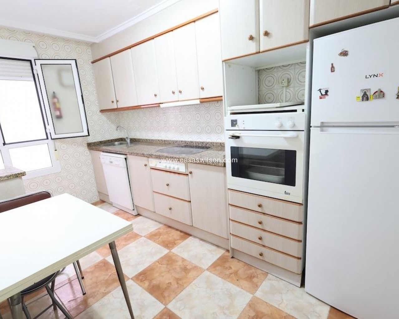 Torrevieja Center – Calle Azorín 3rd-floor south-facing apartment (with elevator). 117 m2, 3 bedrooms, 2 bathrooms, large independent kitchen, living-dining room, and terrace. Sold fully furnished and equipped with AC. Side sea views.. . Optional garage available nearby!