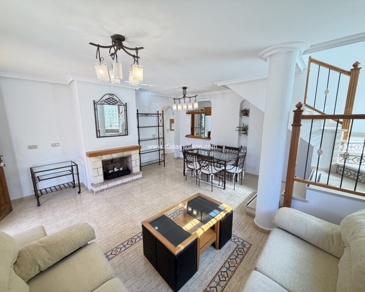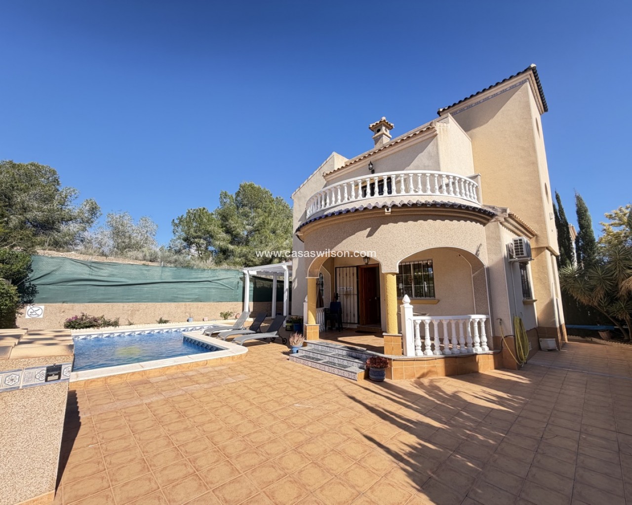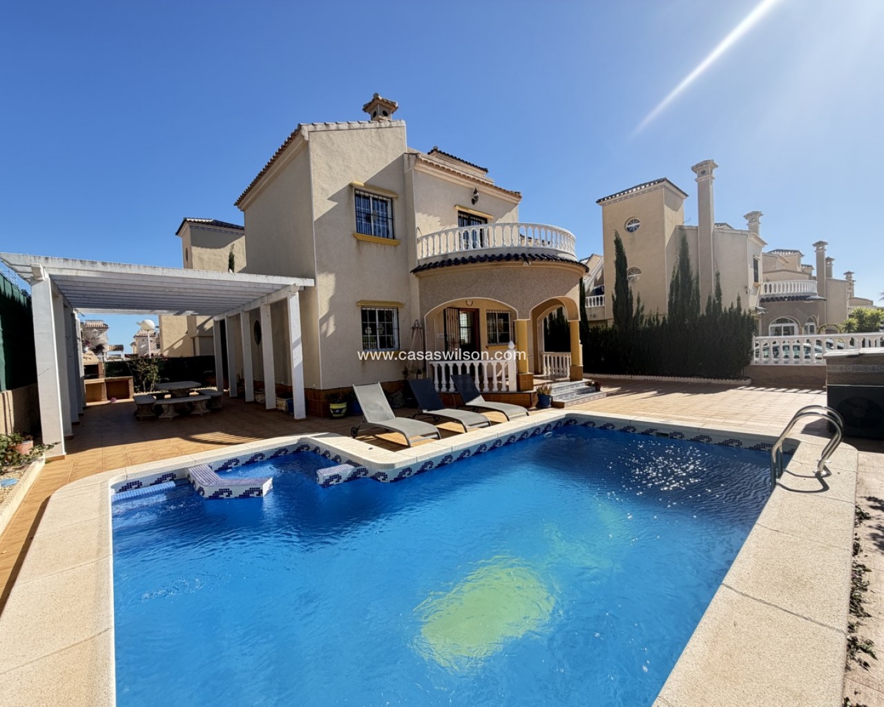 Discover this stunning detached villa in the heart of Villamartin, perfectly situated in a secure gated complex on Pau 26. Enjoy the ultimate in comfort and relaxation in this spacious 3-bedroom home. Key Features: - 3 Spacious Bedrooms: 1 bedroom on ground floor, 2 bedrooms on 1st floor, including a master bedroom with balcony and built-in wardrobes - Large Outdoor Space: Heated private pool, rear terrace, and roof solarium with fantastic views - Secure Gated Complex: Overlooks communal pool and mature gardens - Accommodation: - Large lounge with fireplace and dining area - Separate kitchen and utility room - Modern bathrooms on ground and 1st floors - Additional Features: - Large storage cupboard - Roof solarium with panoramic views Highlights: - Perfect blend of indoor and outdoor living - Ideal for families or those seeking a luxurious lifestyle - Excellent location in Villamartin, close to amenities and services Schedule a viewing today and make this stunning villa your dream home!