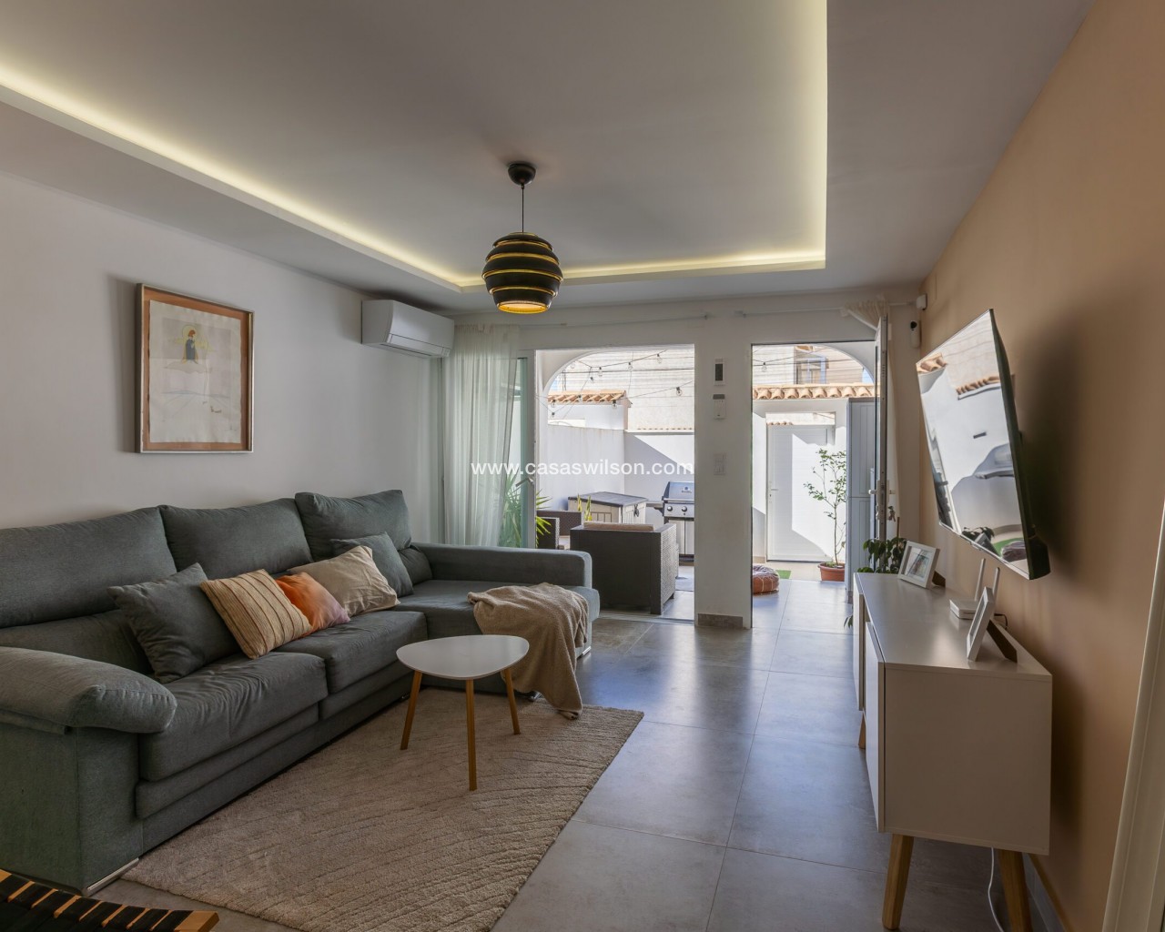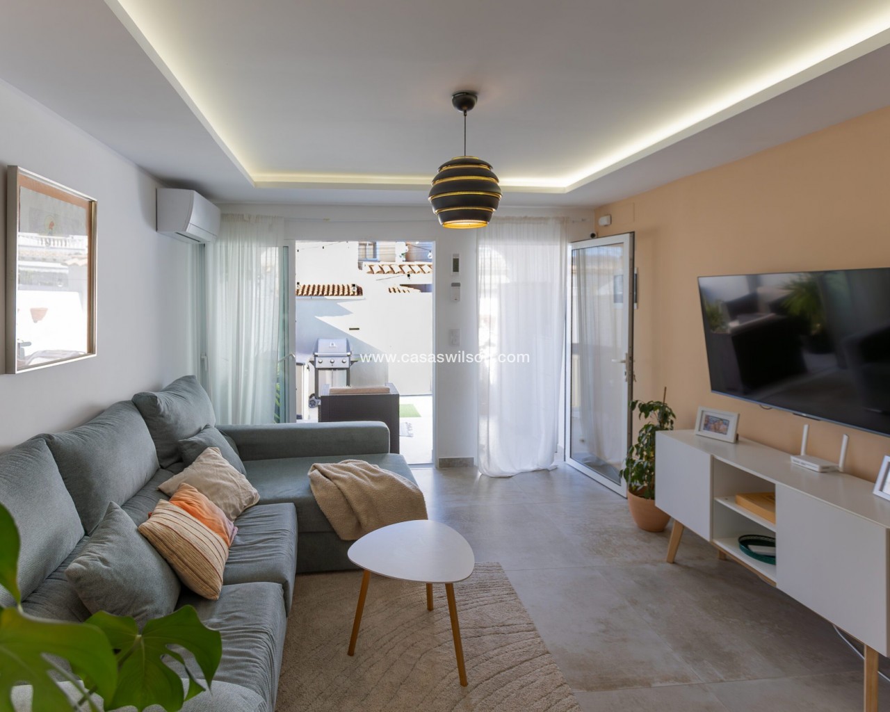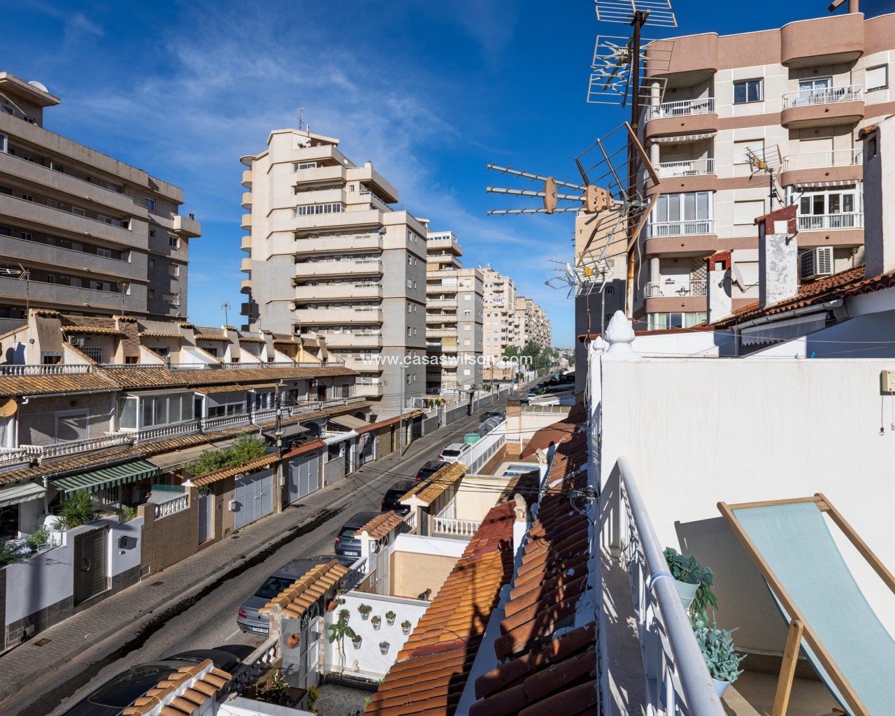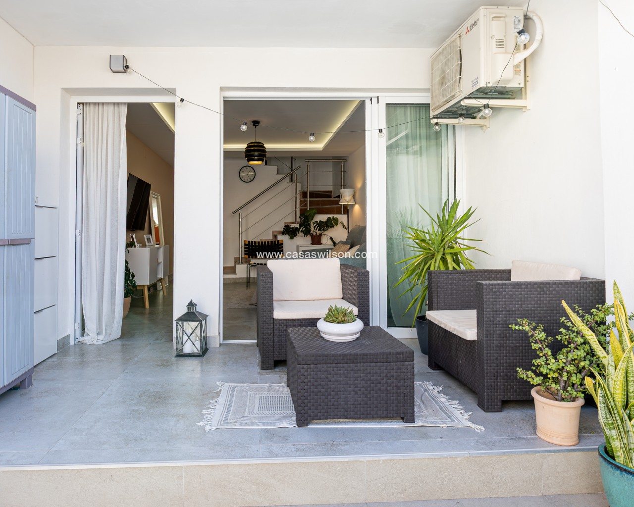 Fully Renovated Townhouse for sale in Nueva Torrevieja. Discover this stunning fully renovated 3-storey townhouse located in the quiet and sought-after area of Nueva Torrevieja, offering modern design, high-quality finishes and ready-to-move-in comfort. The property features 3 spacious bedrooms and 2 full bathrooms, a separate fully equipped kitchen with dining area, and a bright, airy living room with impressive triple sliding glass doors opening directly onto the front garden. Its west-facing orientation guarantees beautiful afternoon sunshine. The home has been completely upgraded with new electrical and plumbing installations, new flooring, smooth walls, double-glazed windows, security entrance door and video intercom. It also benefits from a stylish stainless steel staircase railings, spotlights throughout the house, air conditioning in all rooms and built-in wardrobes in all bedrooms. Property layout: Ground floor: Bright living room with beautiful LED ambient lighting, a fully equipped independent kitchen and a complete bathroom. First floor: Two bedrooms and a full bathroom: The main bedroom features triple sliding doors and a private open balcony, and the second bedroom a private glazed balcony. Second floor: Large master bedroom and acceso to a spacious solarium. Located in a peaceful residential area, close to all amenities: supermarkets, bars, schools, public transport, Torrevieja town centre and the beaches. A perfect home for permanent living. Do not miss the chance to buy this fully renovated townhouse in Nueva Torrevieja.