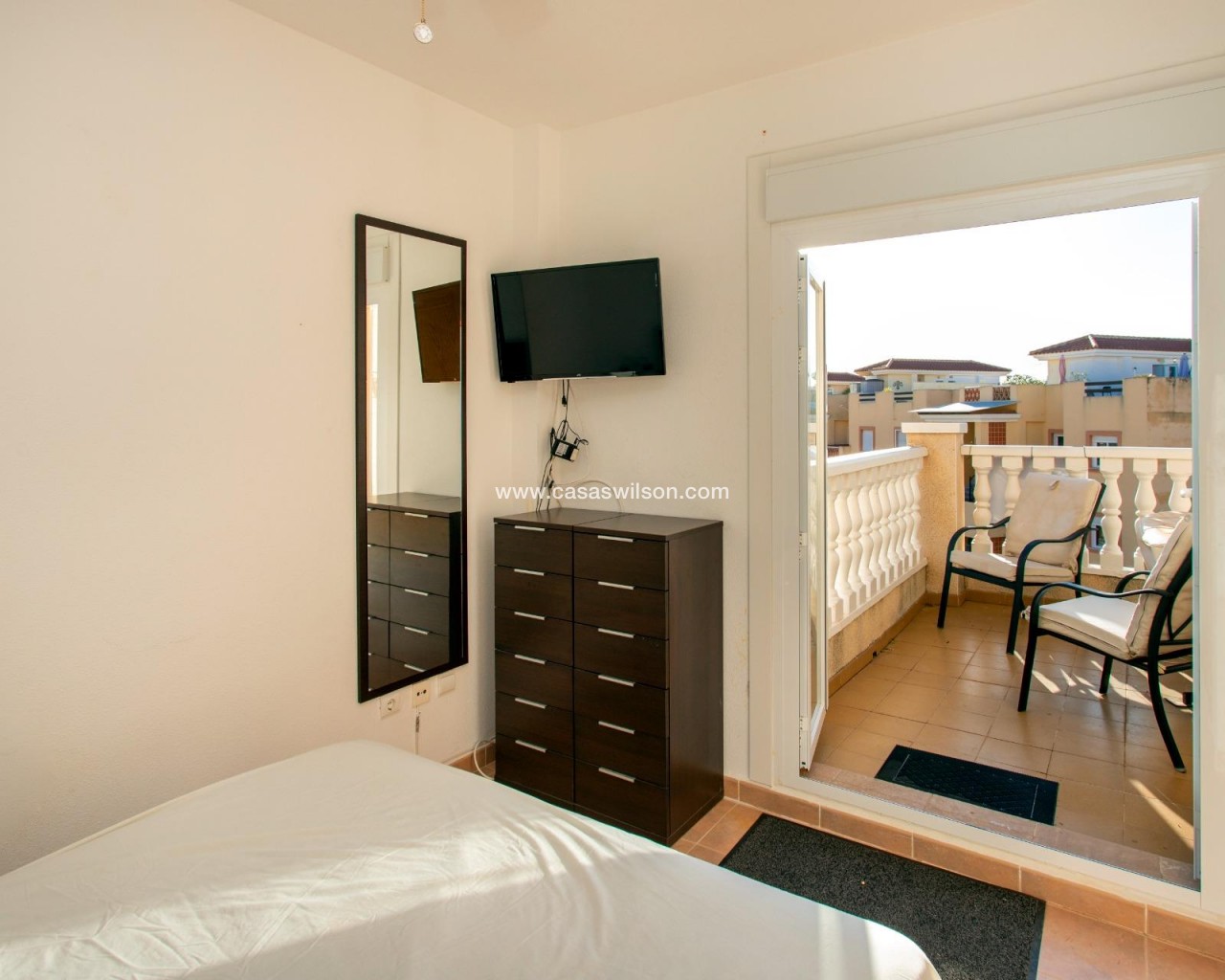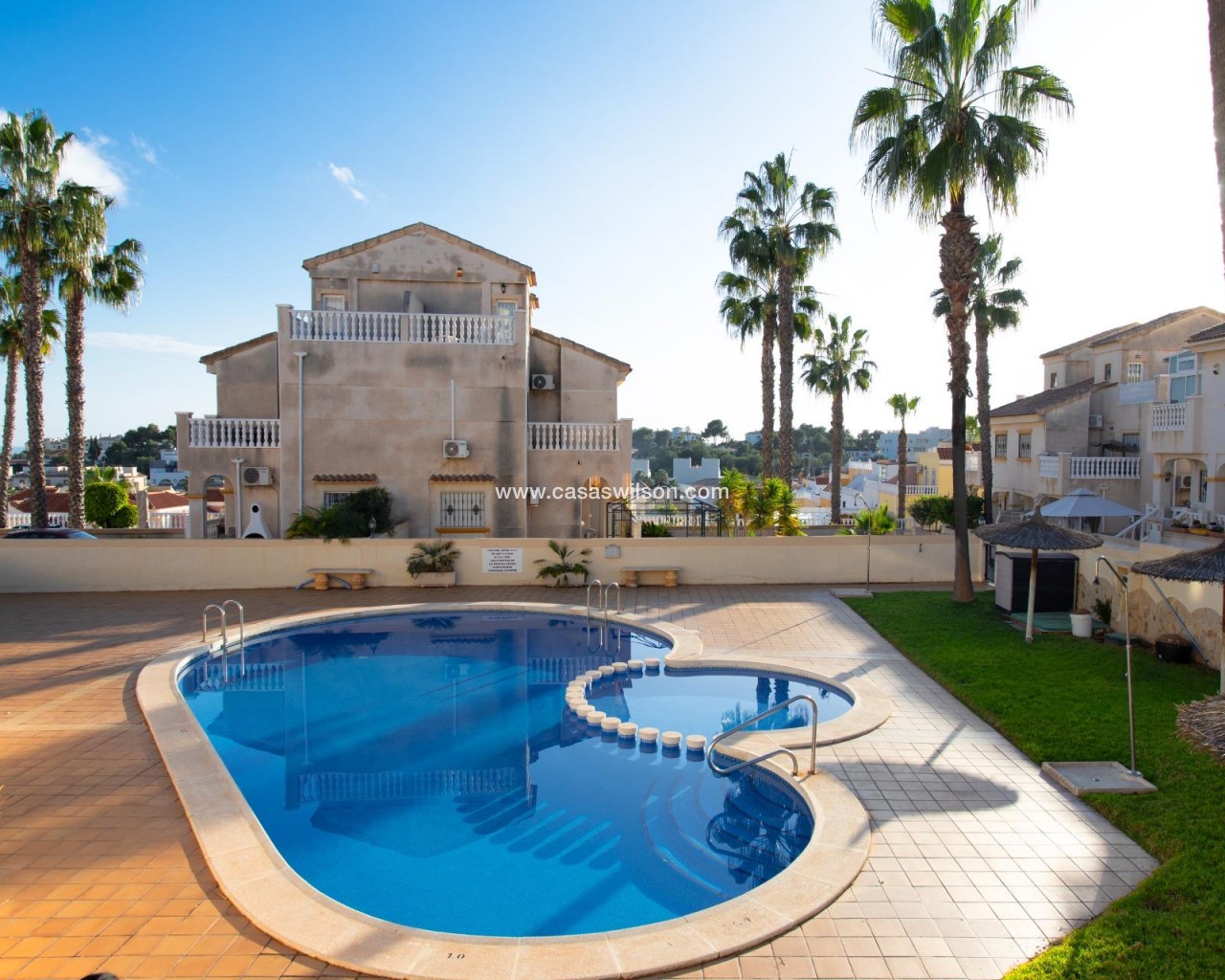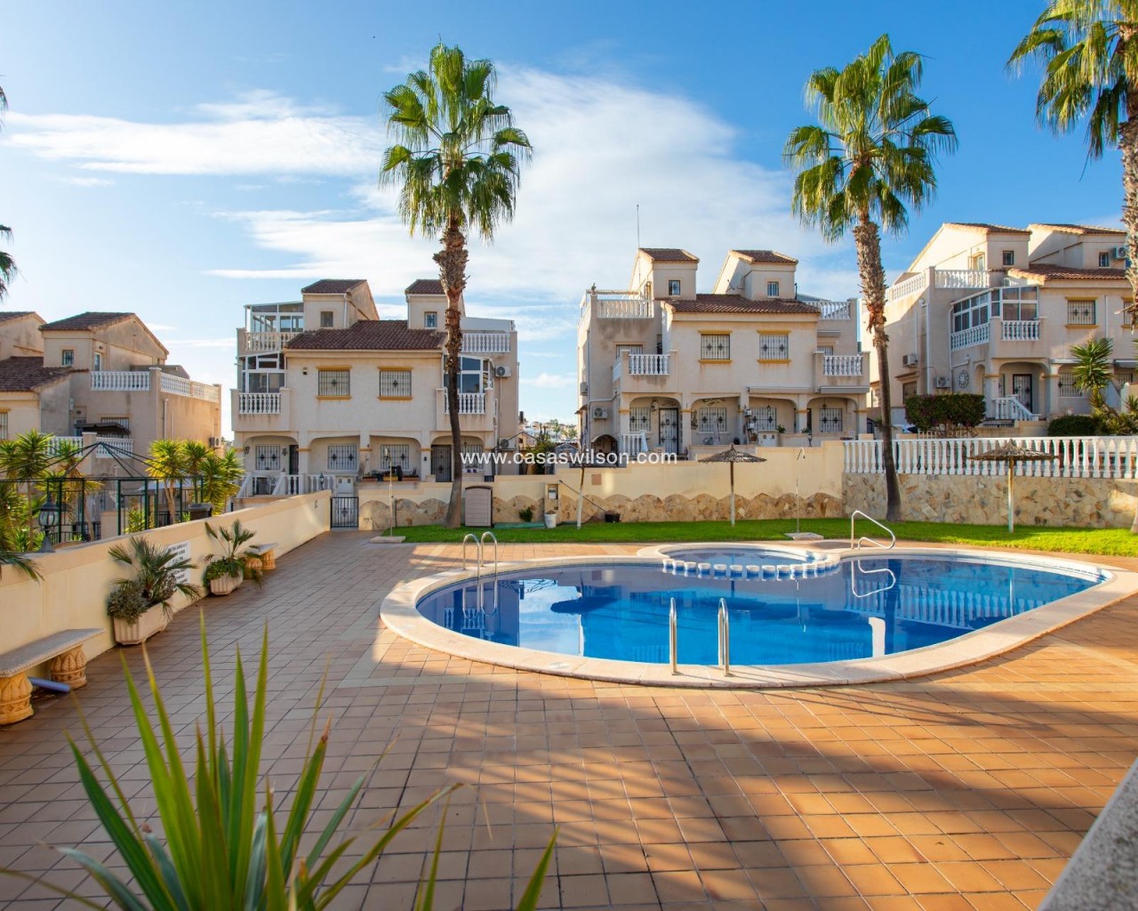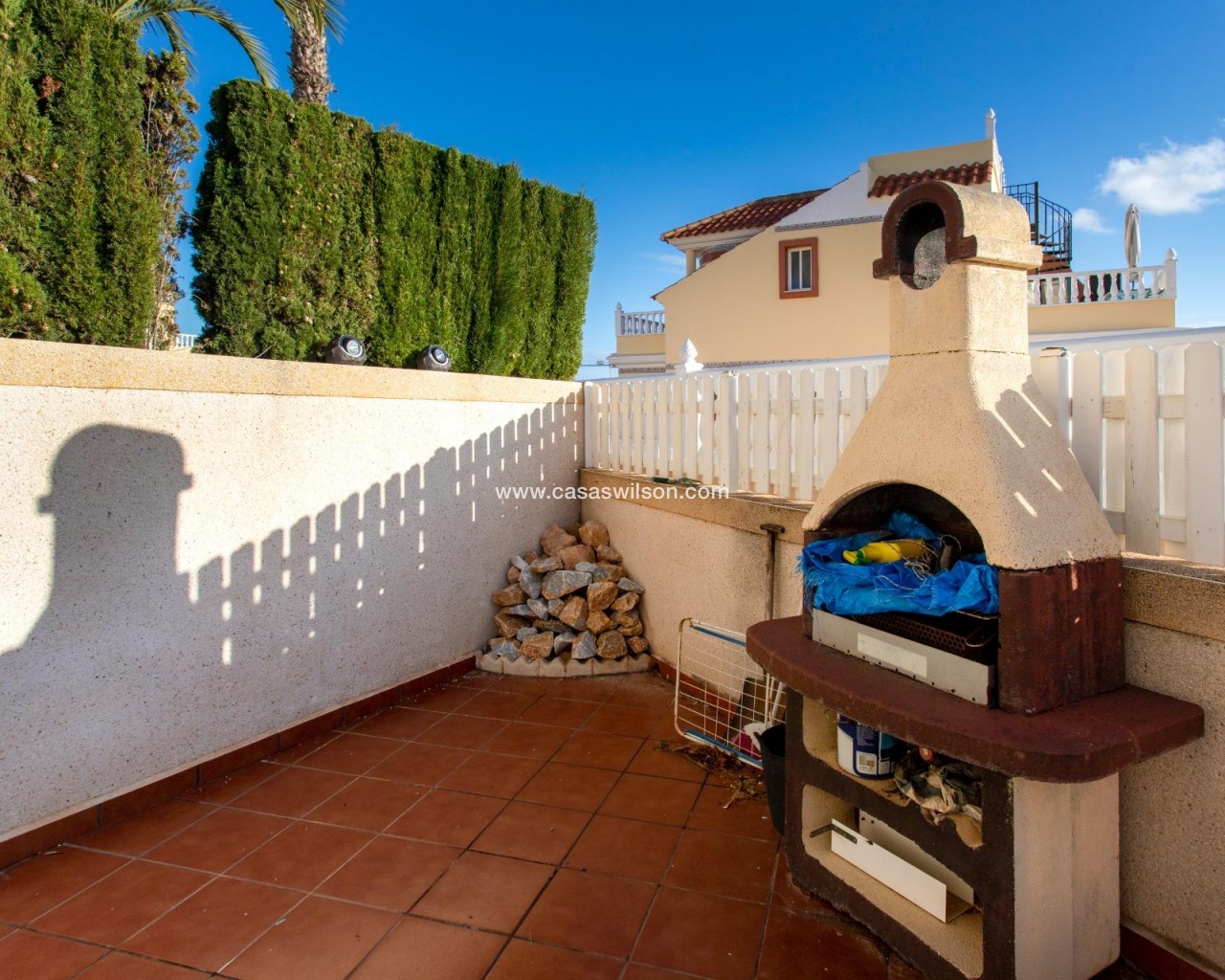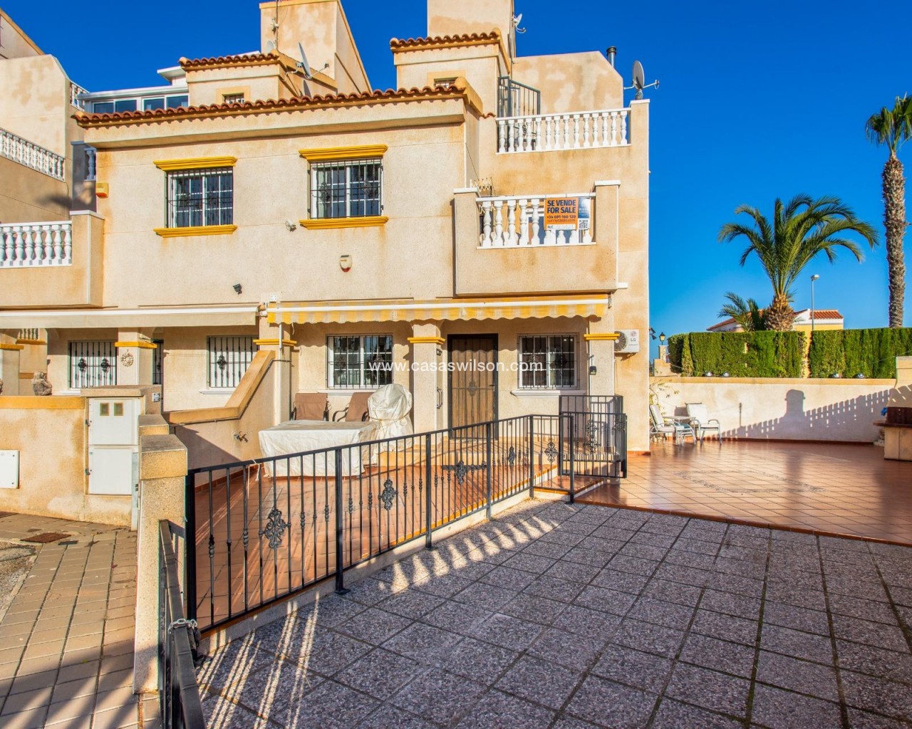 SEA VIEW · PRIVATE SOLARIUM · SOUTH FACING 2-bedroom townhouse in Las Filipinas, Villamartin, Orihuela Costa. Refurbished resale corner townhouse with 79 m² built, arranged over three levels (built in 2003). The ground floor includes an enclosed terrace and private front patio connecting to a large corner terrace, plus a gated side area used for on-plot parking and a barbecue zone. Inside is a combined living–dining room with an open American-style kitchen, a guest toilet (no shower), and a separate storage room. On the first floor there are two double bedrooms with built-in wardrobes; one has direct access to a balcony with open scenic views. This level also has the main bathroom with shower. The top floor features a corner solarium with sea views and panoramic views over the surrounding area. Additional parking is also available in the inner street. Approx. 4.8 km from the beach (around 15 minutes by car), very close to Villamartin Golf, and about 45 minutes’ drive from the airport. No tourist license in place, and no legal notes stated. Suitable for year-round living or as a low-maintenance holiday base.