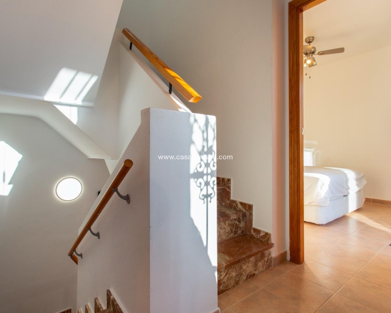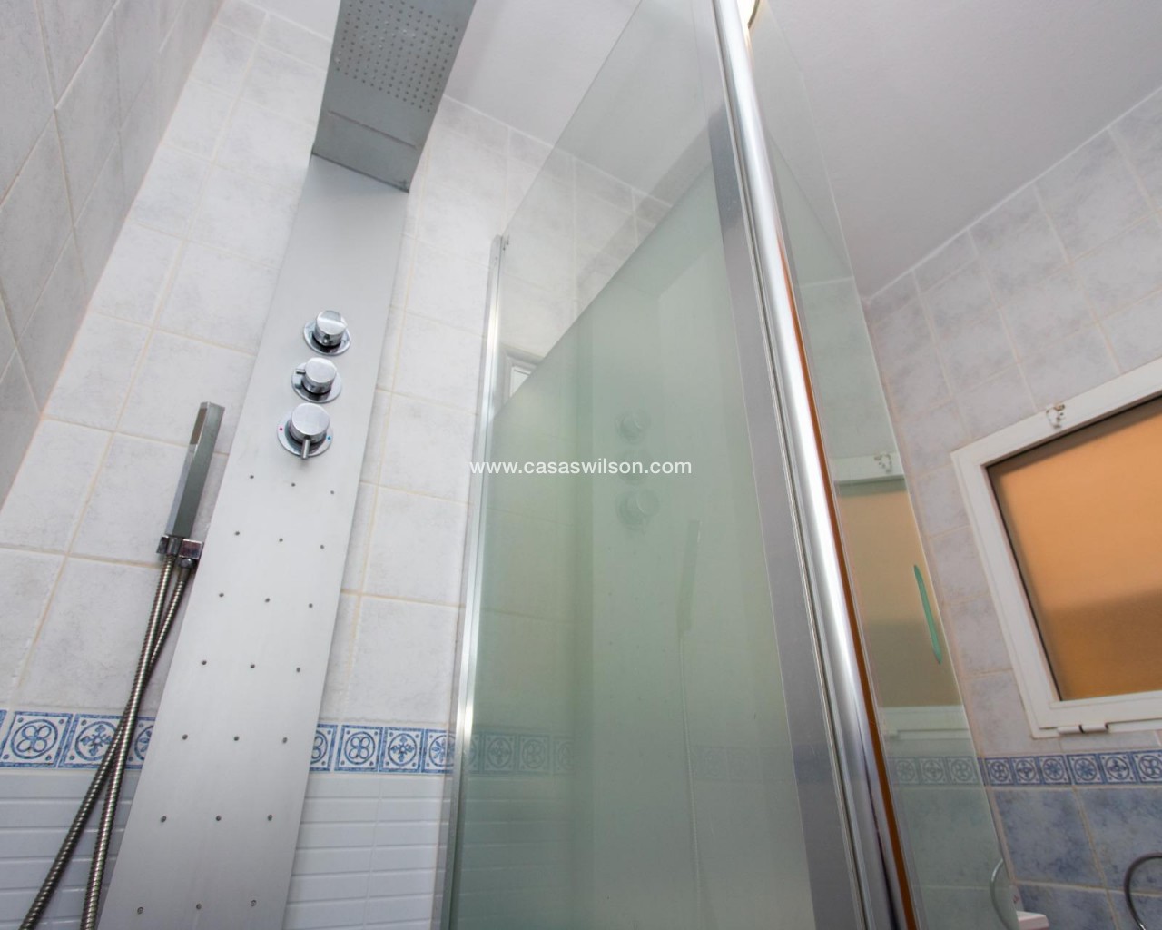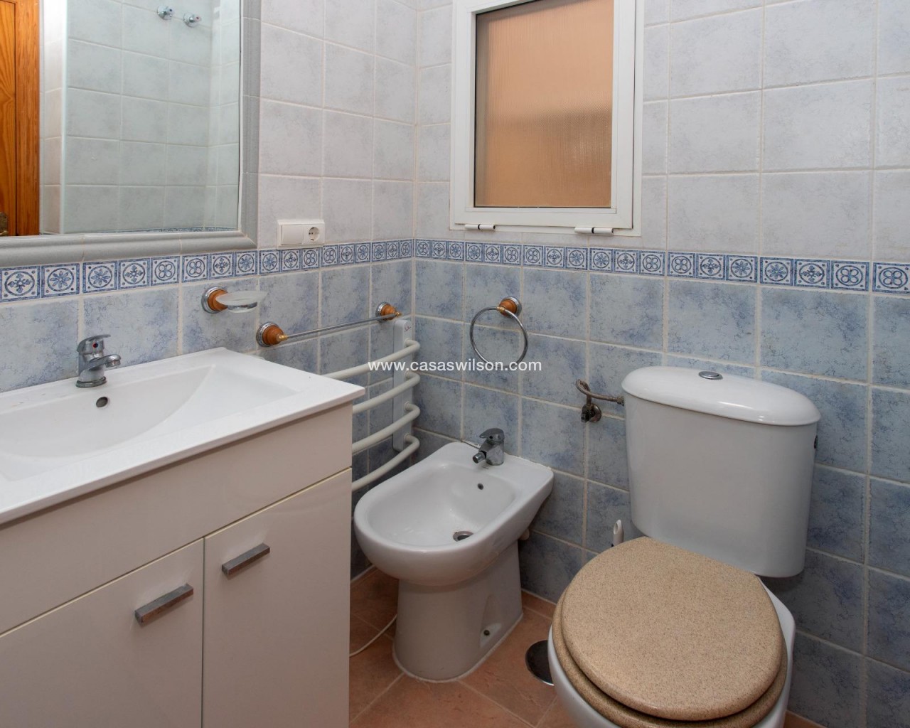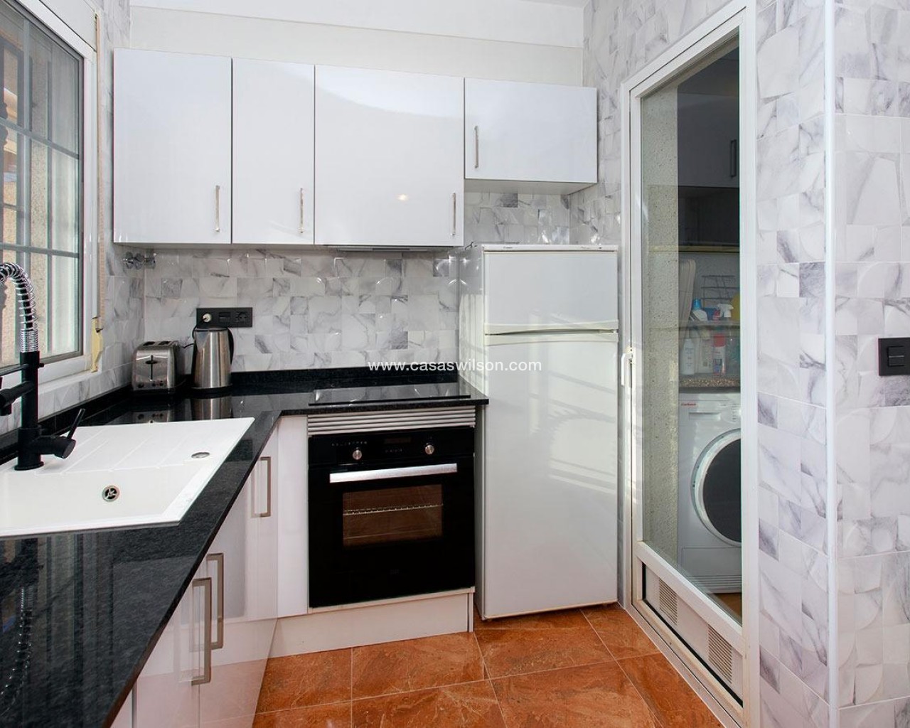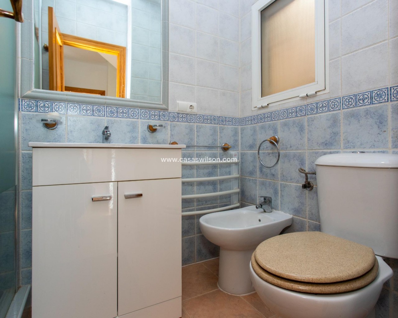 SEA VIEW · PRIVATE SOLARIUM · SOUTH FACING 2-bedroom townhouse in Las Filipinas, Villamartin, Orihuela Costa. Refurbished resale corner townhouse with 79 m² built, arranged over three levels (built in 2003). The ground floor includes an enclosed terrace and private front patio connecting to a large corner terrace, plus a gated side area used for on-plot parking and a barbecue zone. Inside is a combined living–dining room with an open American-style kitchen, a guest toilet (no shower), and a separate storage room. On the first floor there are two double bedrooms with built-in wardrobes; one has direct access to a balcony with open scenic views. This level also has the main bathroom with shower. The top floor features a corner solarium with sea views and panoramic views over the surrounding area. Additional parking is also available in the inner street. Approx. 4.8 km from the beach (around 15 minutes by car), very close to Villamartin Golf, and about 45 minutes’ drive from the airport. No tourist license in place, and no legal notes stated. Suitable for year-round living or as a low-maintenance holiday base.