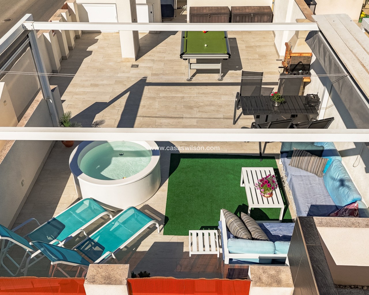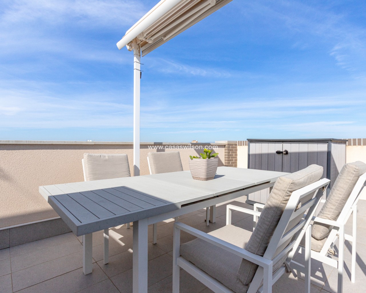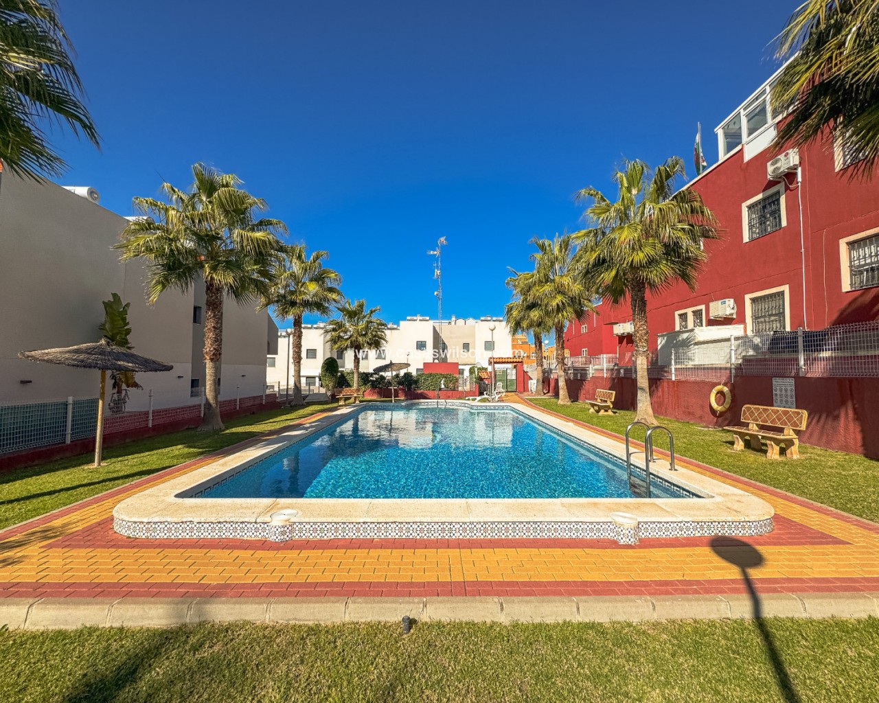 Welcome to this modern and bright top floor bungalow with its own roof terrace the size of the entire apartment! From the front door you enter the spacious living room, which is connected to the dining area and at the back is a well-equipped kitchen. The master bedroom has its own en-suite bathroom, while the second bathroom serves the second bedroom. Both the living room and the master bedroom have patio doors to a south-facing balcony, from which external stairs lead to the roof terrace. The roof terrace offers expansive views of the mountains and the surrounding area. You can open the roof terrace awning and create a sheltered space to enjoy the Mediterranean climate. The communal pool area is just twenty meters away, offering a green oasis for relaxation. The Aldi supermarket is just a stone's throw away, and there are also several restaurants and bars within walking distance in the Via Park 3 shopping center. The sandy beaches of Punta Prima and Playa Flamenca are only about a 10-minute drive away. Zenia Boulevard is about a 10-minute drive away, you can also get to Zenia Boulevard by bus from the stop directly in front of the apartment.