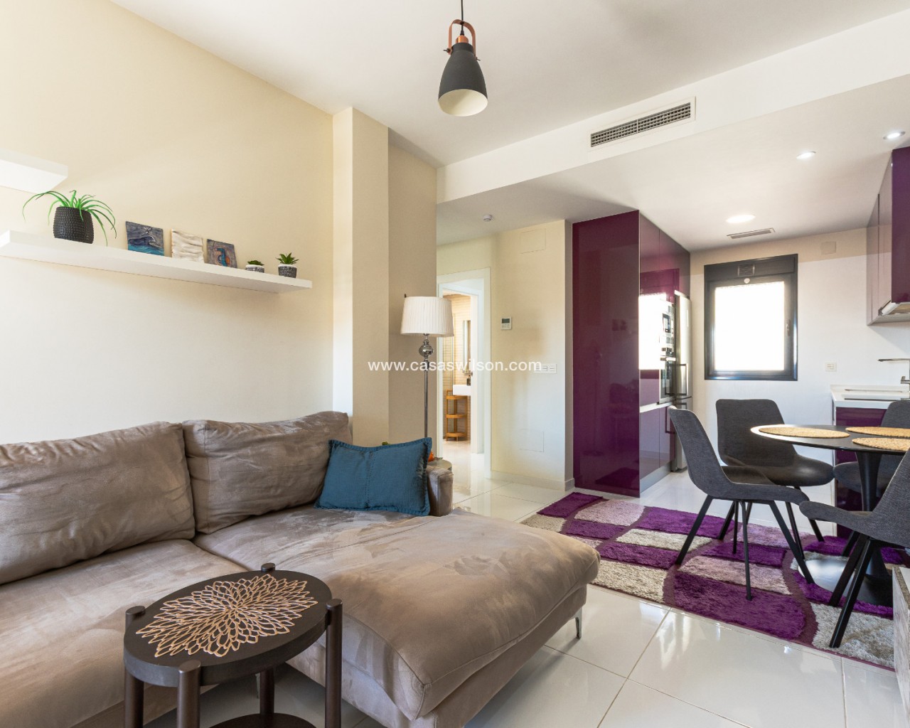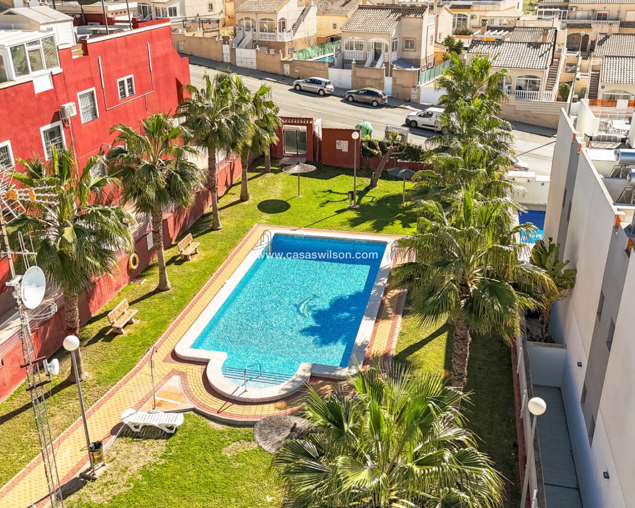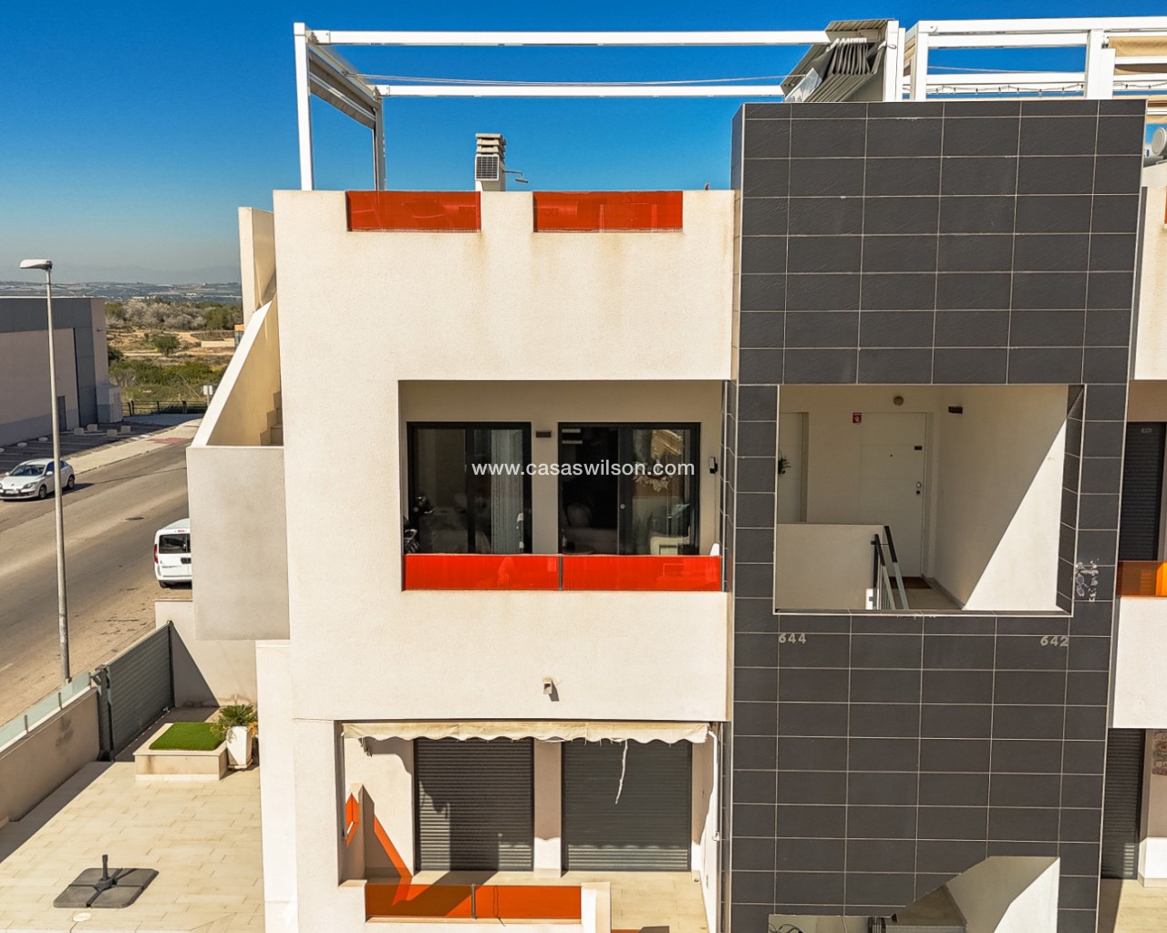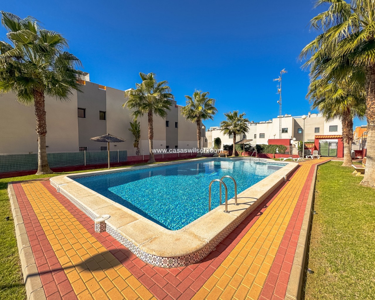 Welcome to this modern and bright top floor bungalow with its own roof terrace the size of the entire apartment! From the front door you enter the spacious living room, which is connected to the dining area and at the back is a well-equipped kitchen. The master bedroom has its own en-suite bathroom, while the second bathroom serves the second bedroom. Both the living room and the master bedroom have patio doors to a south-facing balcony, from which external stairs lead to the roof terrace. The roof terrace offers expansive views of the mountains and the surrounding area. You can open the roof terrace awning and create a sheltered space to enjoy the Mediterranean climate. The communal pool area is just twenty meters away, offering a green oasis for relaxation. The Aldi supermarket is just a stone's throw away, and there are also several restaurants and bars within walking distance in the Via Park 3 shopping center. The sandy beaches of Punta Prima and Playa Flamenca are only about a 10-minute drive away. Zenia Boulevard is about a 10-minute drive away, you can also get to Zenia Boulevard by bus from the stop directly in front of the apartment.