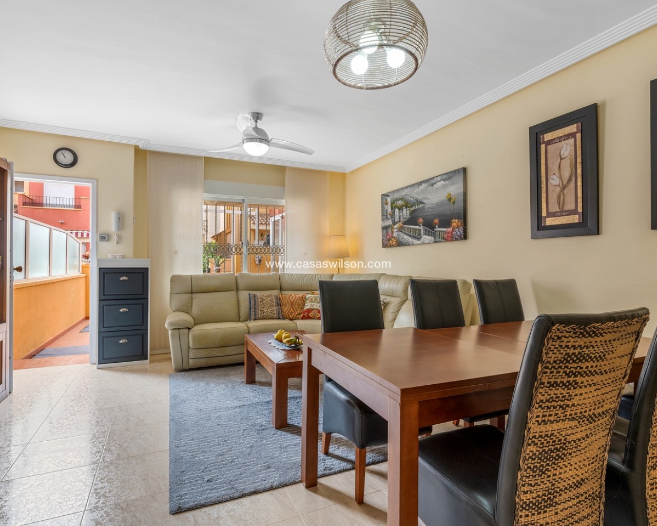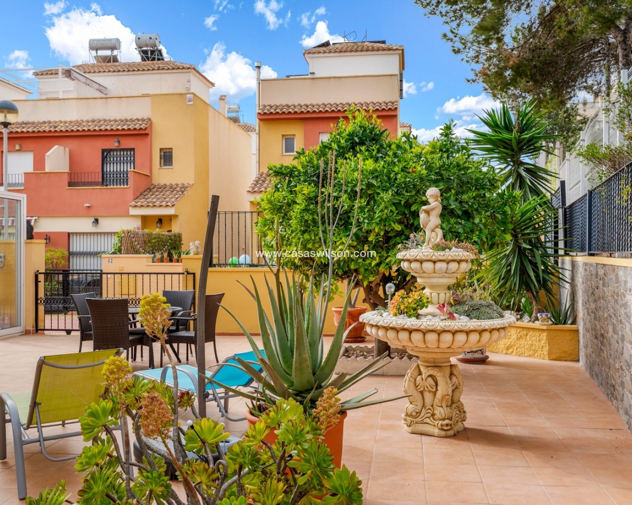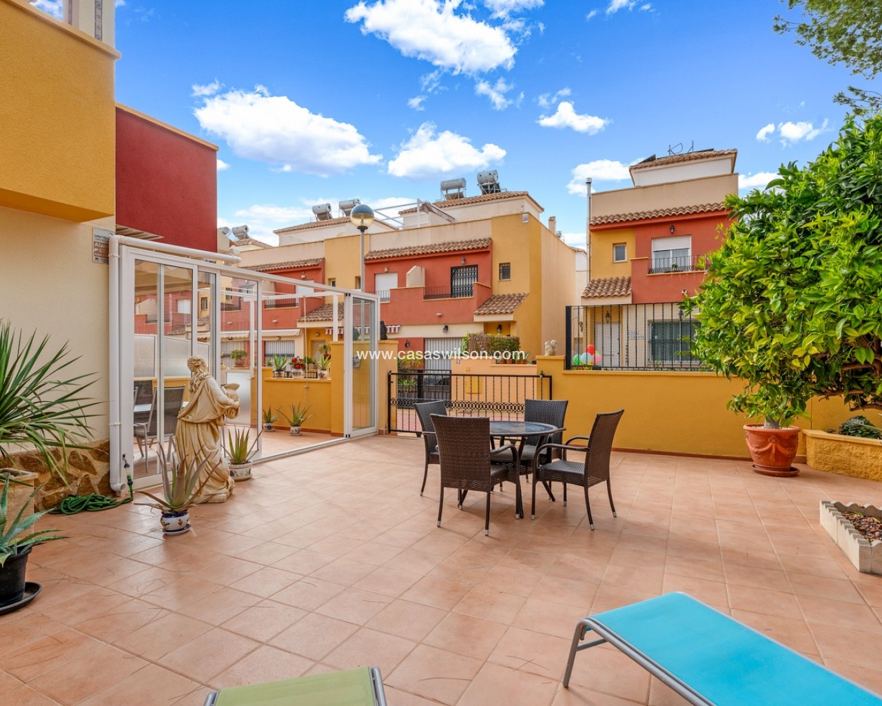 Located in the highly sought-after area of Villamartín on the beautiful Costa Blanca, this charming south-facing corner townhouse offers the perfect combination of space, privacy and Mediterranean lifestyle. The property sits on a large private corner plot of over 200 m², allowing plenty of outdoor space and sunshine throughout the day thanks to its excellent south orientation. Being a corner property also provides extra privacy, natural light and a more open feel compared to standard townhouses. The home is distributed over three levels: Ground floor: bright living and dining area, separate fully equipped kitchen, one bedroom and one bathroom — ideal for guests or convenient single-level living. First floor: two spacious bedrooms, both with their own private balconies, plus a second bathroom. Top floor: a private rooftop solarium, perfect for sunbathing, relaxing or creating a chill-out area with excellent privacy. The property is part of a gated residential community with access to a beautiful communal swimming pool, ideal for enjoying the warm Mediterranean climate. The location is another major highlight. The house is within easy reach of restaurants, bars, supermarkets and shops, and just a few minutes from the popular shopping destination La Zenia Boulevard — one of the largest shopping centres in the region Key Features Corner townhouse with large 200+ m² plotSouth-facing orientation (sun all day)3 bedrooms / 2 bathrooms1 bedroom on the ground floorSeparate fully equipped kitchen + closed patioPrivate balconies for both upstairs bedroomsPrivate rooftop solariumGated communityCommunal swimming poolPrime location in VillamartínMinutes from La Zenia Boulevard This property is perfect as a holiday home, permanent residence or rental investment, thanks to its prime location and excellent outdoor space.