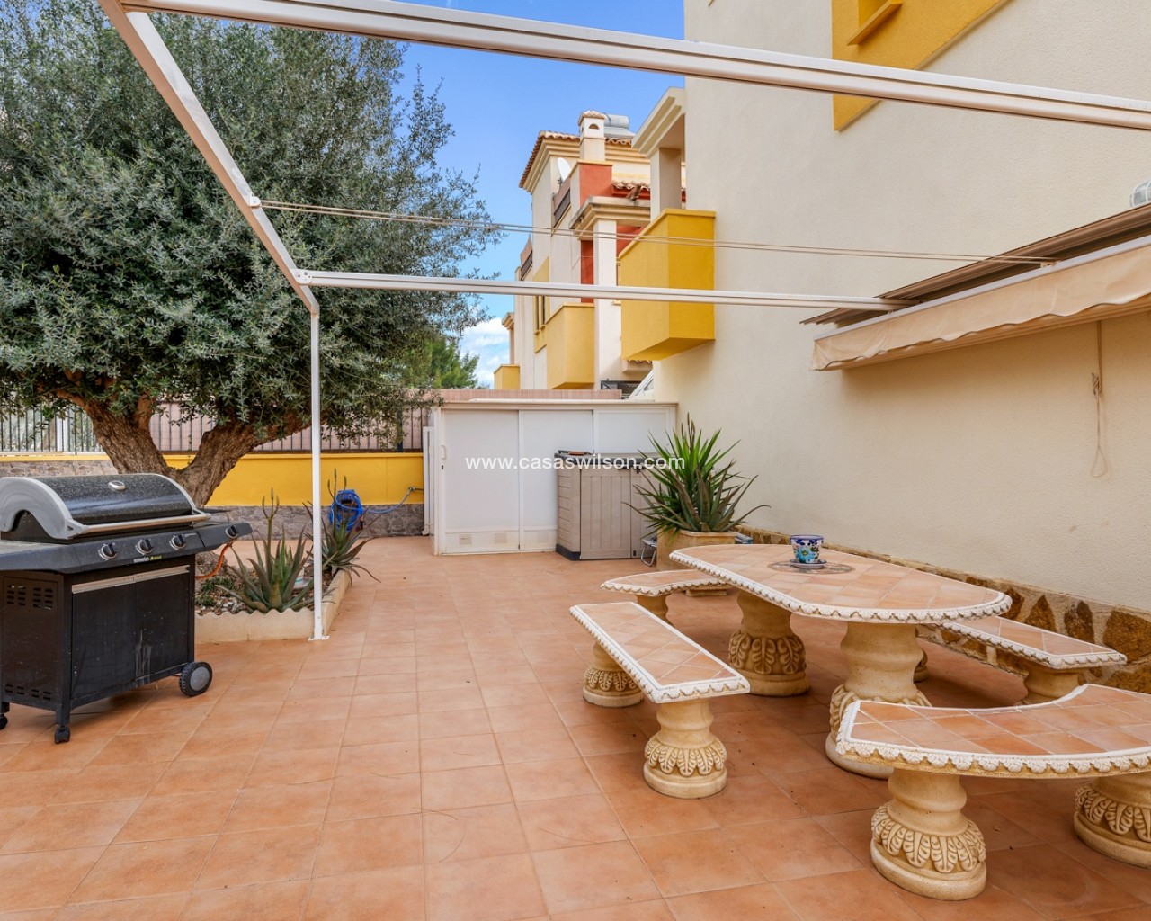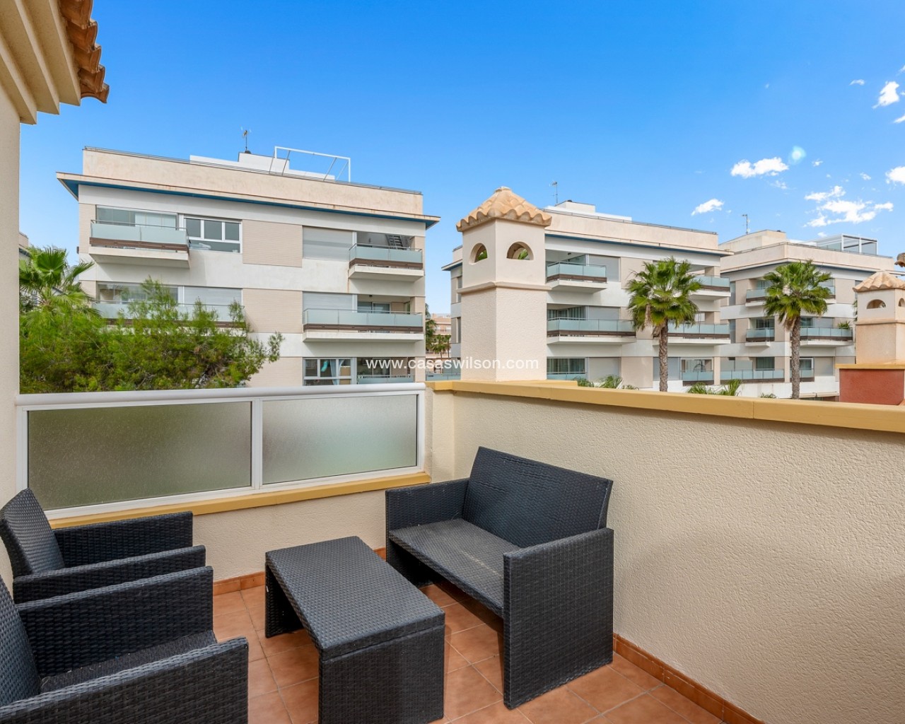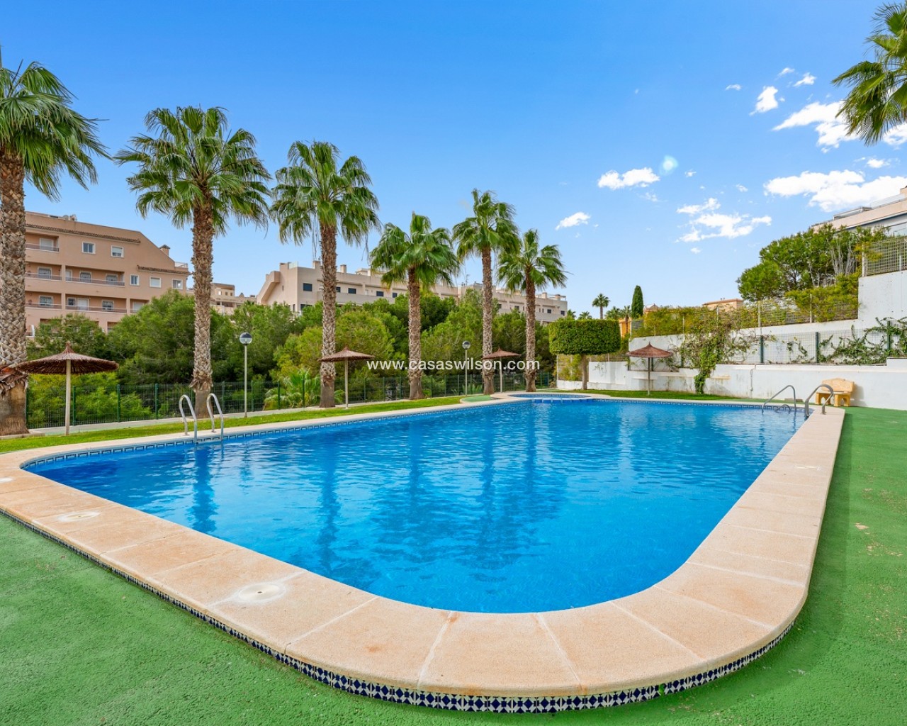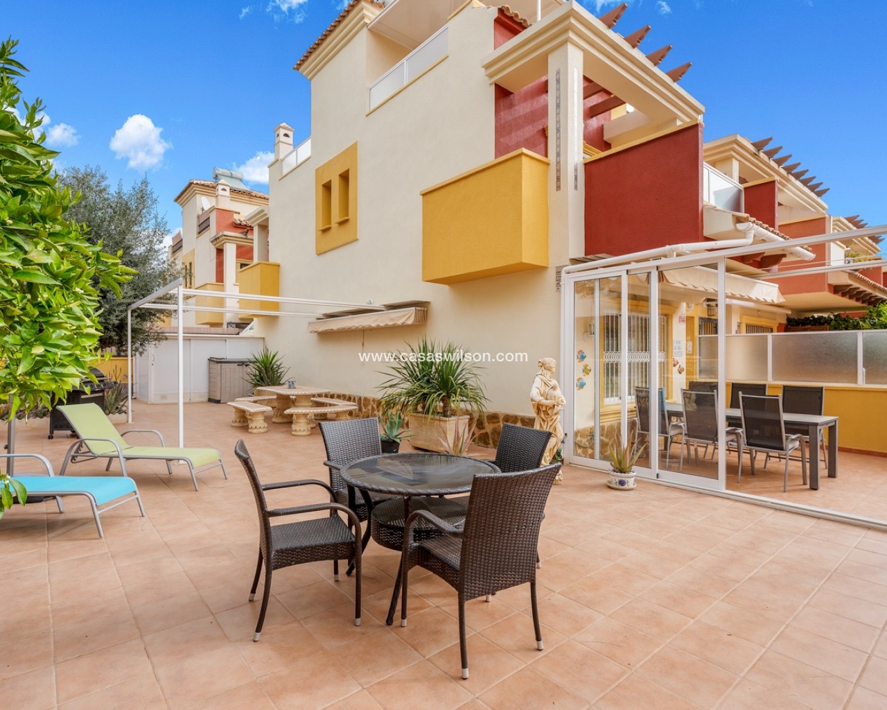 Located in the highly sought-after area of Villamartín on the beautiful Costa Blanca, this charming south-facing corner townhouse offers the perfect combination of space, privacy and Mediterranean lifestyle. The property sits on a large private corner plot of over 200 m², allowing plenty of outdoor space and sunshine throughout the day thanks to its excellent south orientation. Being a corner property also provides extra privacy, natural light and a more open feel compared to standard townhouses. The home is distributed over three levels: Ground floor: bright living and dining area, separate fully equipped kitchen, one bedroom and one bathroom — ideal for guests or convenient single-level living. First floor: two spacious bedrooms, both with their own private balconies, plus a second bathroom. Top floor: a private rooftop solarium, perfect for sunbathing, relaxing or creating a chill-out area with excellent privacy. The property is part of a gated residential community with access to a beautiful communal swimming pool, ideal for enjoying the warm Mediterranean climate. The location is another major highlight. The house is within easy reach of restaurants, bars, supermarkets and shops, and just a few minutes from the popular shopping destination La Zenia Boulevard — one of the largest shopping centres in the region Key Features Corner townhouse with large 200+ m² plotSouth-facing orientation (sun all day)3 bedrooms / 2 bathrooms1 bedroom on the ground floorSeparate fully equipped kitchen + closed patioPrivate balconies for both upstairs bedroomsPrivate rooftop solariumGated communityCommunal swimming poolPrime location in VillamartínMinutes from La Zenia Boulevard This property is perfect as a holiday home, permanent residence or rental investment, thanks to its prime location and excellent outdoor space.