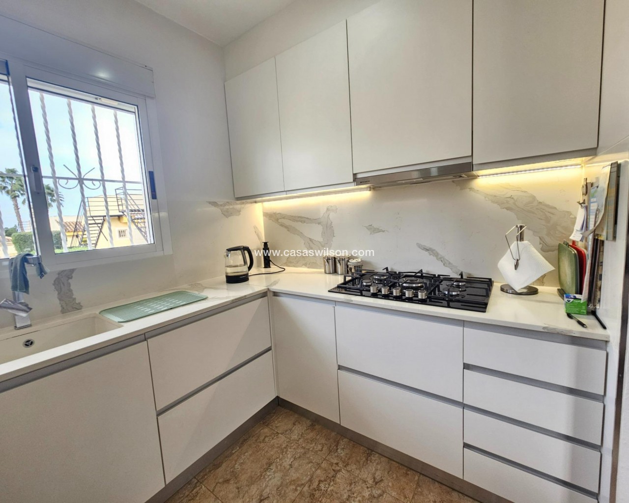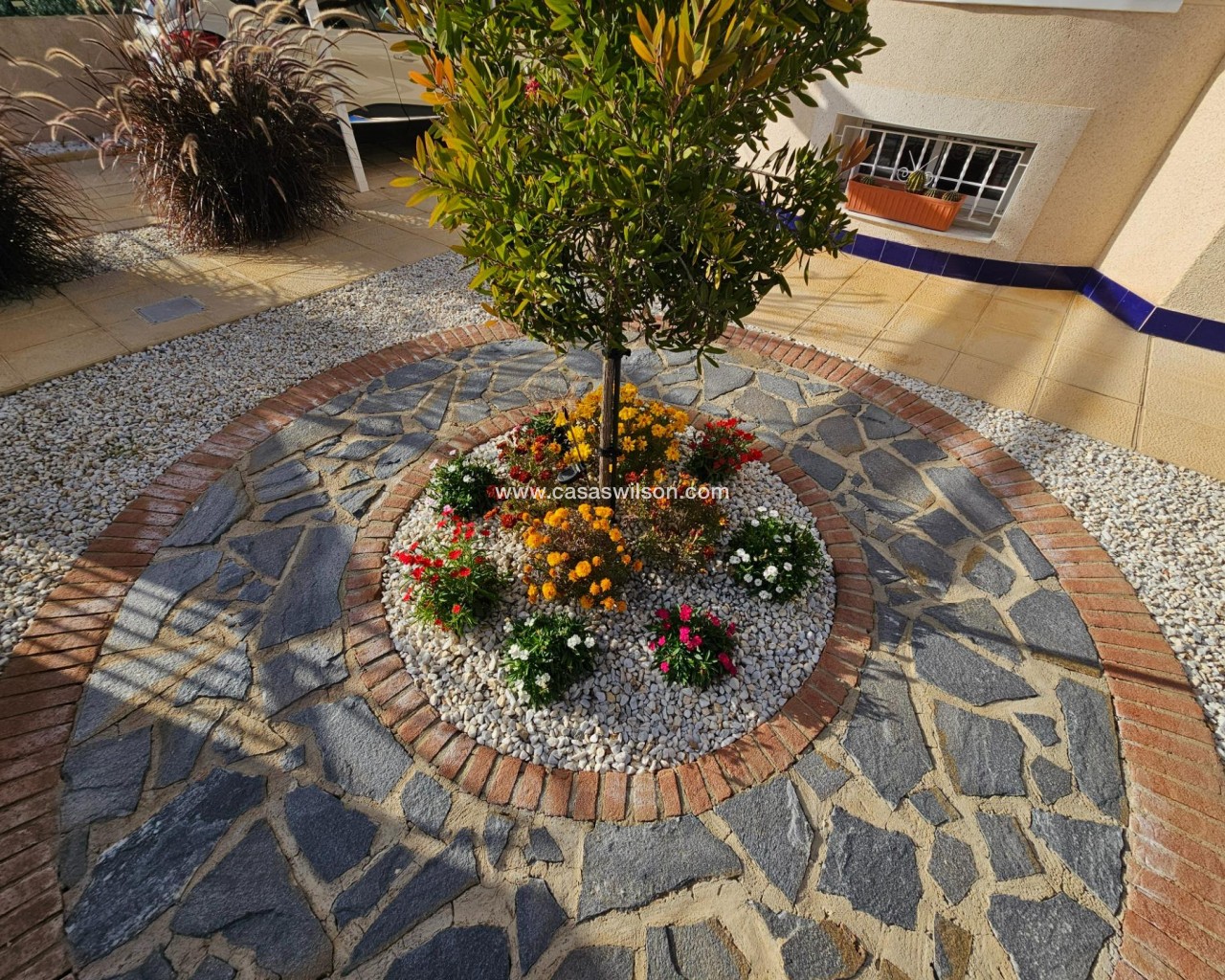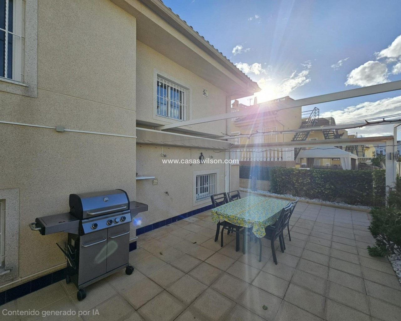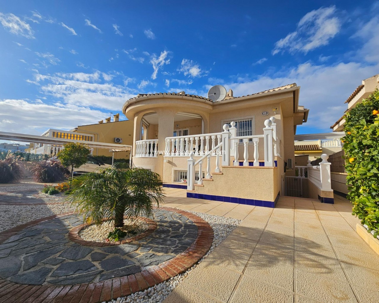 We are proud to present to you a 3 bed 2,5 bath detached villa with separated underbuild in absolutely stunning condition, located in the sought after urbanisation Benimar III, conjunto Maite VII. Sitting on a plot of 228M² offering off road parking, low maintainance garden with automatic irregation system, lovely fruit plants, and a covered terrace to enjoy your morning coffee and a-fresco dining. Stained glass next to the entrance gives you a colorful welcome into the home which consist on the ground floor of a ample lounge/living room, a fully equipped open plan kitchen, a dining area, a double bedroom, a showerrroom and a guest toillet. From the living room there is direct access trough French doors to the sunny terrace, overlooking the beautiful garden and the surrounding areas. The underbuild can be accessed through a separated entrance which comprises of 2 double bedrooms, a showerroom, laundryroom and a large livingroom, including a kitchen, perfect to organise family gatherings. The property has been upgraded during the years and has been very well looked after. The community pool can be found just around the corner, same as the natural park Cañada Marsá, ideal for romantic strolls and enjoy the local wildlife. EXTRAS: airconditioning, ceiling fans, double glazed windows, underfloor heating on ground floor, renovated bathrooms, water softener, partially furnished, sky tv, marble kitchen worktop, towelrack, drinkwaterfilter, appliances. Benimar is a popular urbanisation with a nice expat community comprising of low buildings and wide streets, and full of amenities. The proximity to larger towns of Benijófar, Rojales en Ciudad Quesada make this an outstanding option for both residential living or as a second home. The beaches of Guardamar are only a short drive away and the airport of Alicante can be reached in less then 40 minutes.