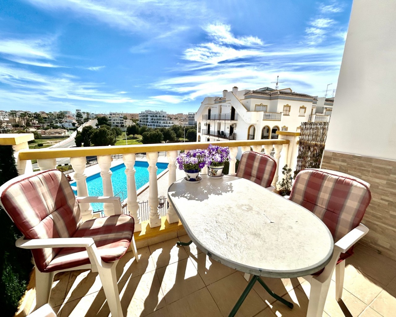 This beautifully presented south-facing penthouse is located in the highly desirable Molino Blanco urbanisation, in the heart of La Zenia. Enjoying an elevated position overlooking the communal pool, the property offers both privacy and attractive open views within a well-maintained residential setting.The apartment features 3 spacious bedrooms and 2 modern bathrooms, with a bright and airy living area that benefits from its south-facing orientation, filling the home with natural light throughout the day. A generous terrace provides the perfect space for outdoor dining and relaxing while enjoying views over the landscaped gardens and pool.One of the standout features of this property is its private rooftop solarium, offering additional outdoor living space ideal for sunbathing, entertaining, or simply enjoying the Mediterranean climate in complete privacy.The location is exceptional — just a few steps from a wide selection of bars, restaurants, and local shops, with the popular La Zenia Boulevard only a short walk away. The sandy shores of La Zenia Beach are also within easy walking distance, making this an ideal home for both holidays and year-round living.Whether you’re seeking a permanent residence, a holiday getaway, or a strong rental investment, this penthouse offers space, sunshine, and an unbeatable location in one of the most sought-after areas of the Costa Blanca.