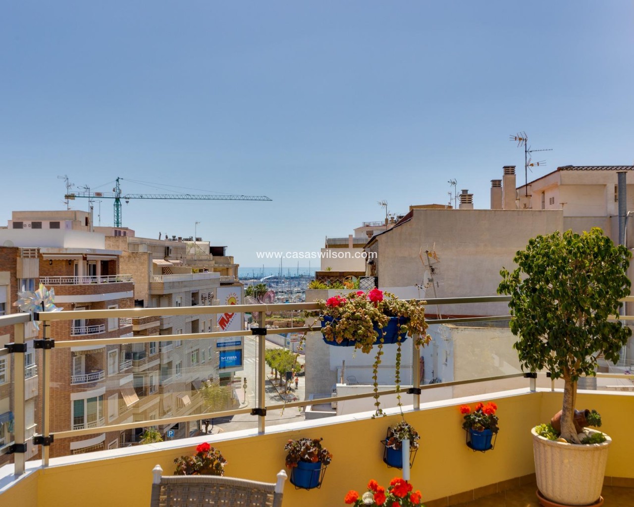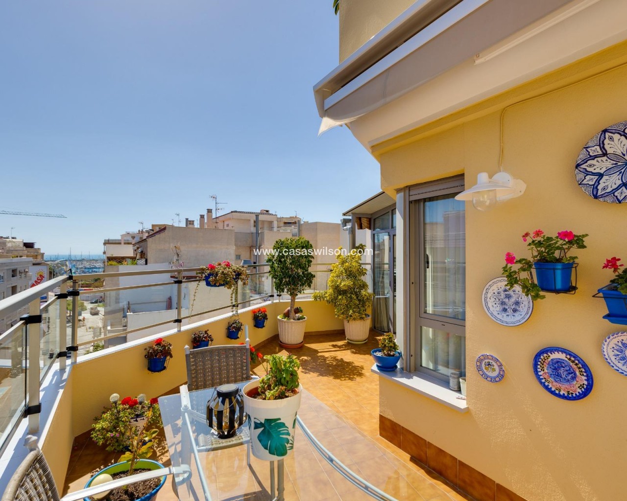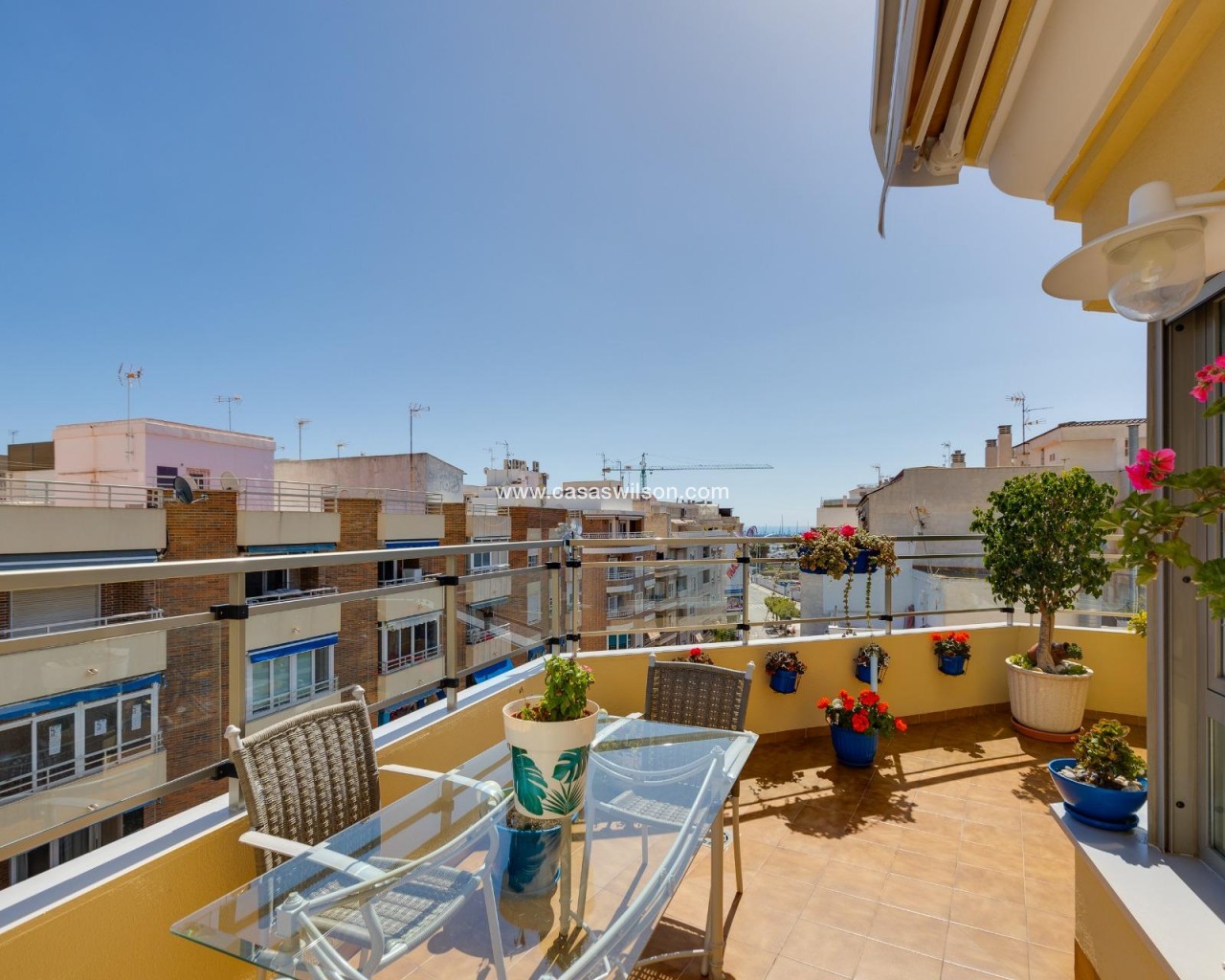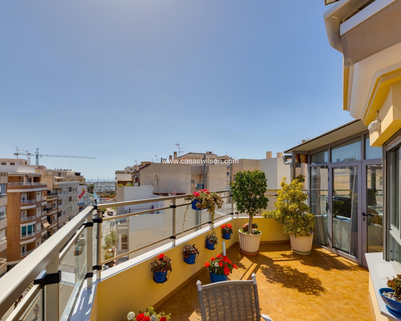 This beautiful penthouse located on the fifth floor with an elevator offers a strategic location in the center of Torrevieja, just a few meters from the Las Cañas restaurant and surrounded by all essential services such as restaurants, pharmacies, bus stops, supermarkets, etc. The property stands out for its functionality and its excellent use of natural light thanks to its dual south and east orientation. The interior is distributed into a living-dining room integrated with an open-plan kitchen, two bright bedrooms, and a fully equipped bathroom with a shower. The living room connects directly to a spacious L-shaped terrace that surrounds the property; this space is divided into a glazed area and an open area, allowing for both practical and recreational use throughout the year while enjoying open views and sea views. Additionally, the property includes a private solarium on the upper floor with wonderful views and a kitchen area, providing an additional outdoor space of great value for gatherings with friends or family. Don’t miss the penthouse you’ve always dreamed of. Contact us now and come discover your next terrace with sea views!