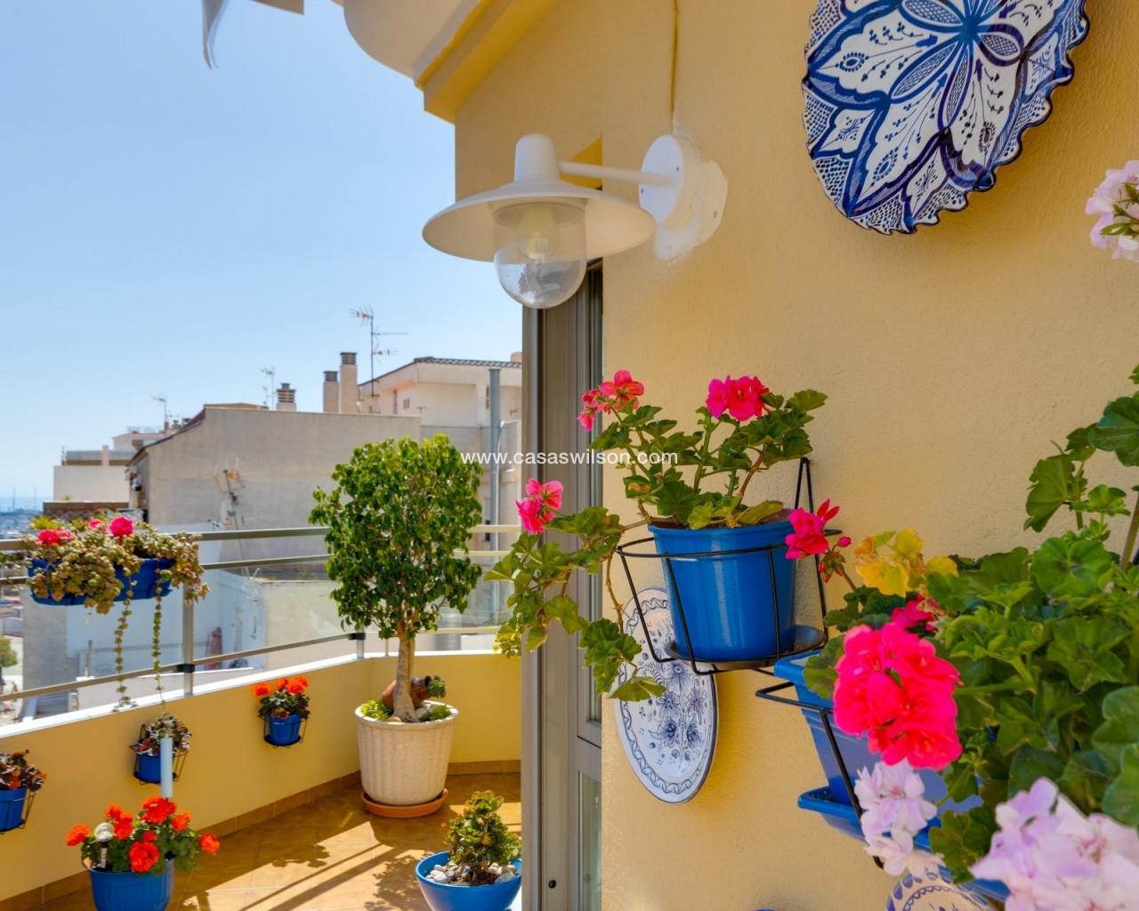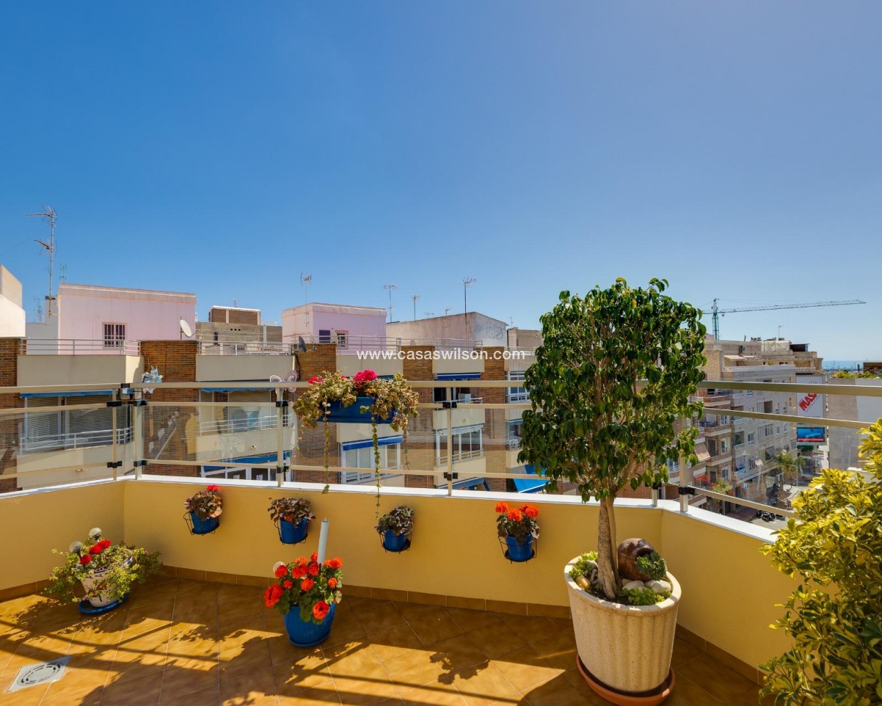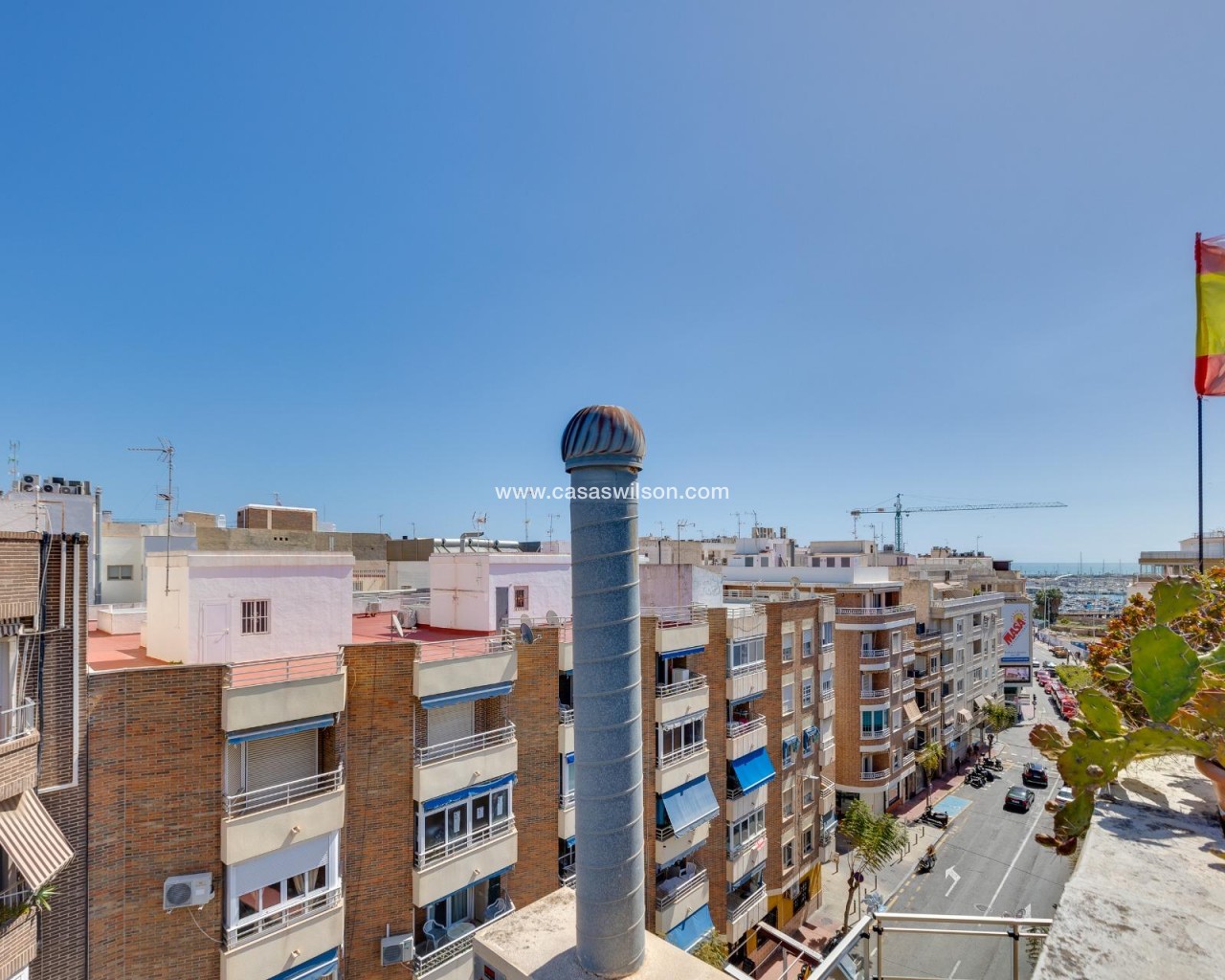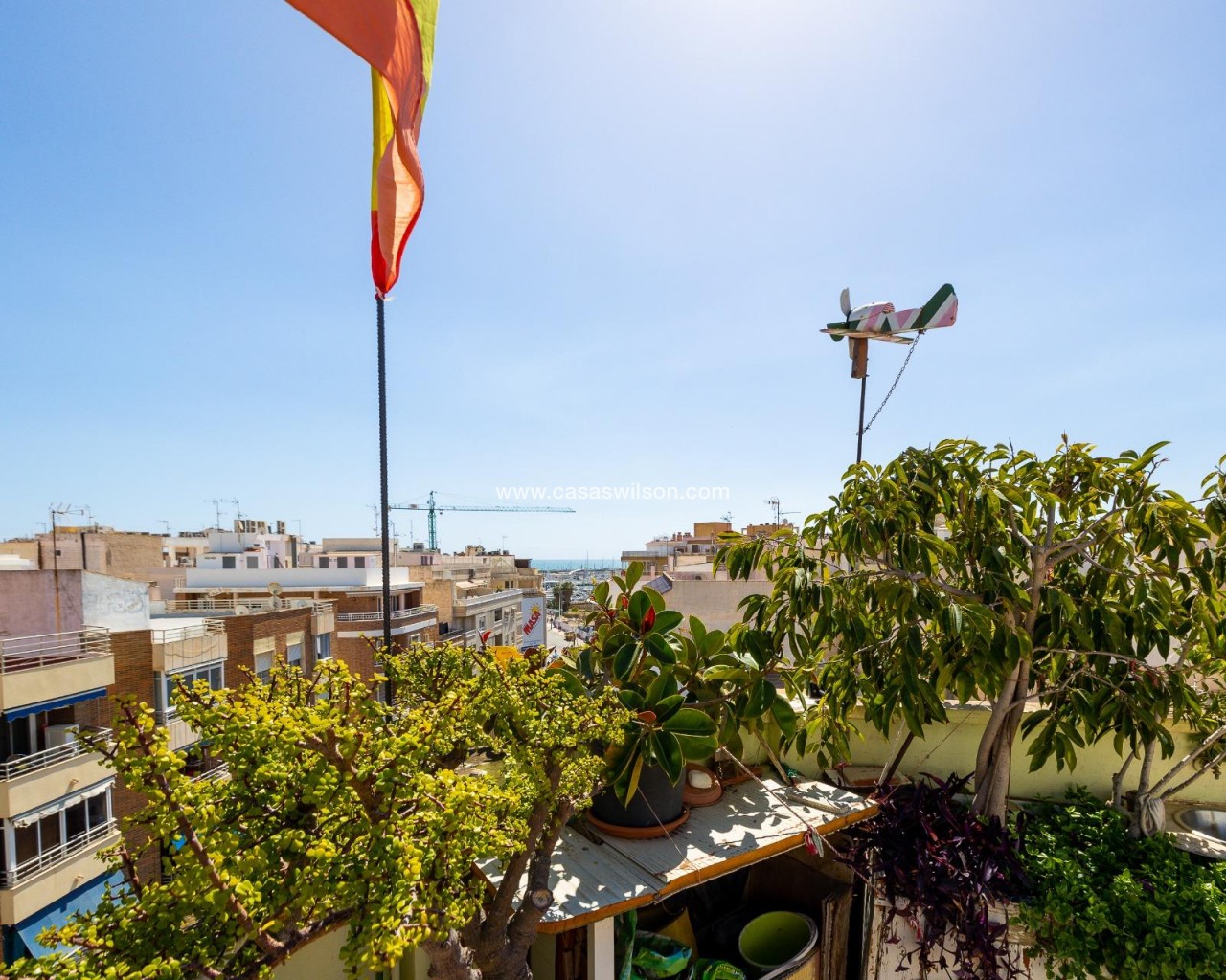 This beautiful penthouse located on the fifth floor with an elevator offers a strategic location in the center of Torrevieja, just a few meters from the Las Cañas restaurant and surrounded by all essential services such as restaurants, pharmacies, bus stops, supermarkets, etc. The property stands out for its functionality and its excellent use of natural light thanks to its dual south and east orientation. The interior is distributed into a living-dining room integrated with an open-plan kitchen, two bright bedrooms, and a fully equipped bathroom with a shower. The living room connects directly to a spacious L-shaped terrace that surrounds the property; this space is divided into a glazed area and an open area, allowing for both practical and recreational use throughout the year while enjoying open views and sea views. Additionally, the property includes a private solarium on the upper floor with wonderful views and a kitchen area, providing an additional outdoor space of great value for gatherings with friends or family. Don’t miss the penthouse you’ve always dreamed of. Contact us now and come discover your next terrace with sea views!