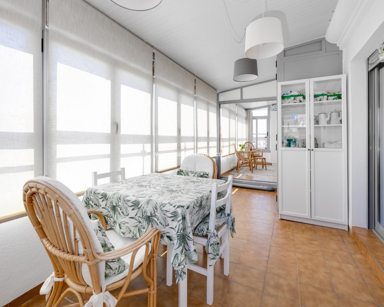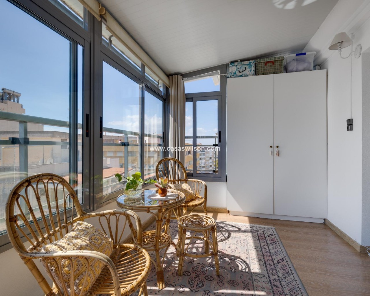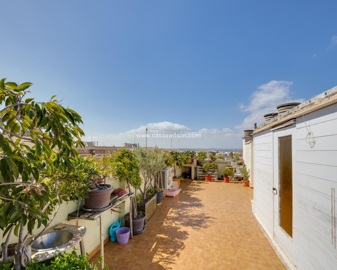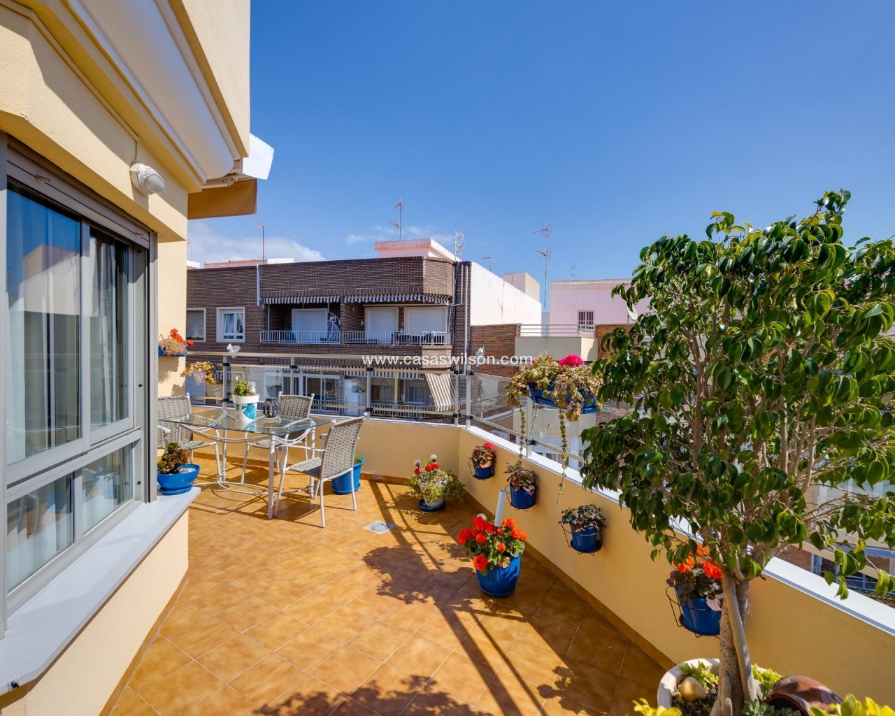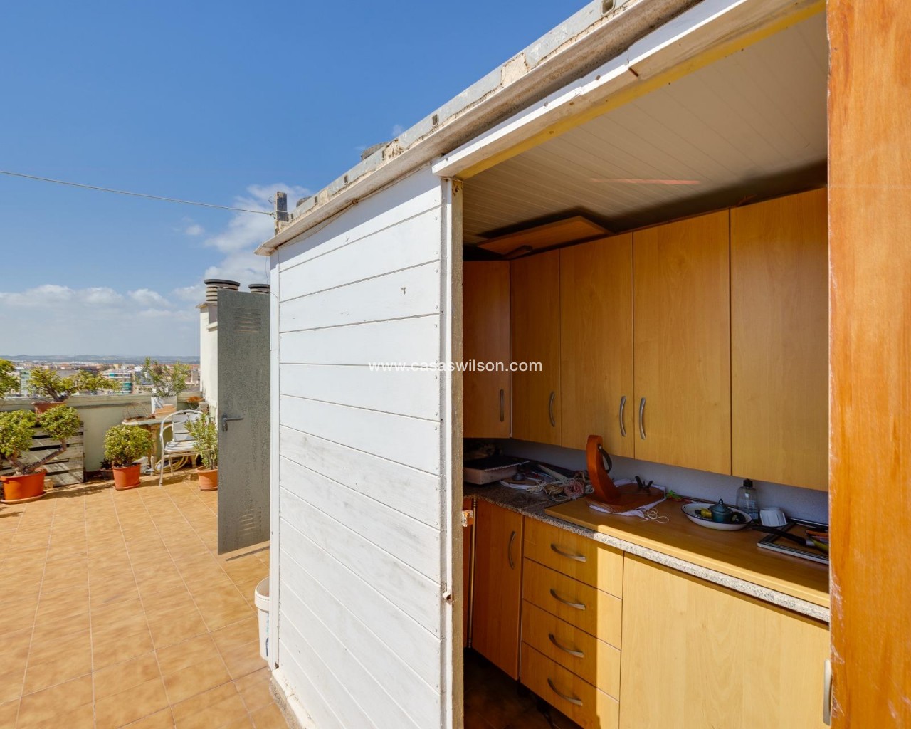 This beautiful penthouse located on the fifth floor with an elevator offers a strategic location in the center of Torrevieja, just a few meters from the Las Cañas restaurant and surrounded by all essential services such as restaurants, pharmacies, bus stops, supermarkets, etc. The property stands out for its functionality and its excellent use of natural light thanks to its dual south and east orientation. The interior is distributed into a living-dining room integrated with an open-plan kitchen, two bright bedrooms, and a fully equipped bathroom with a shower. The living room connects directly to a spacious L-shaped terrace that surrounds the property; this space is divided into a glazed area and an open area, allowing for both practical and recreational use throughout the year while enjoying open views and sea views. Additionally, the property includes a private solarium on the upper floor with wonderful views and a kitchen area, providing an additional outdoor space of great value for gatherings with friends or family. Don’t miss the penthouse you’ve always dreamed of. Contact us now and come discover your next terrace with sea views!