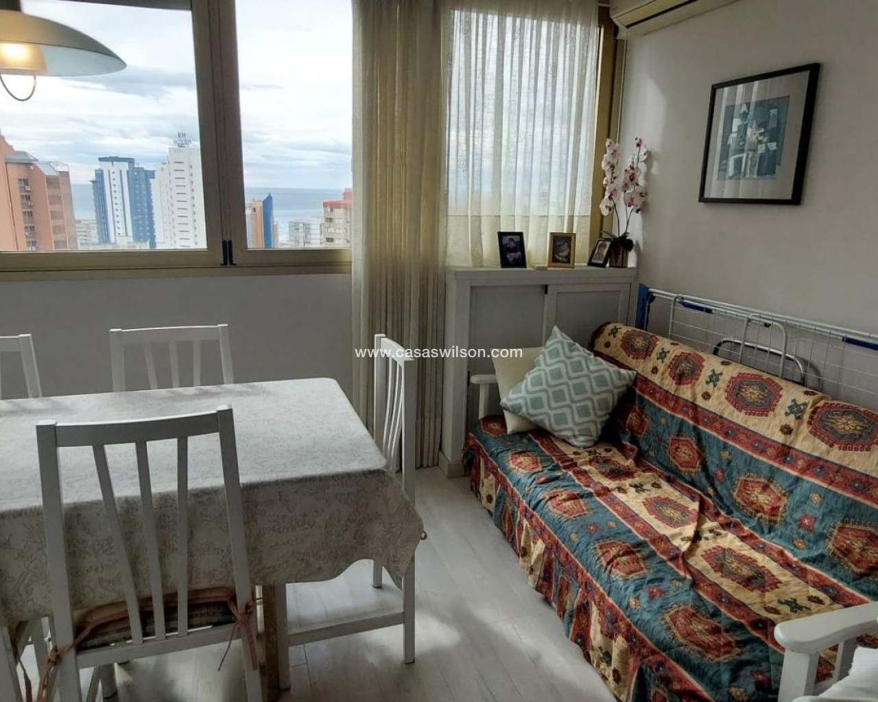 Discover this fantastic apartment for sale located in the Mercadona area of Benidorm, situated on a privileged high floor, offering stunning sea views and excellent natural light throughout the day. It is an ideal property both as a permanent residence, a second home, or an investment, thanks to its strategic location and features. The apartment has a cozy bedroom, a full bathroom, and a functional layout that makes the most of every space. The property has been renovated, featuring a modern style and is ready to move into without the need for improvements. One of its main highlights is its enclosed terrace, perfect for enjoying sea views at any time of the year, creating a very versatile additional space. The residential complex where it is located offers excellent amenities, including a communal swimming pool and garage, providing comfort and tranquility to its residents. In addition, it is a well-kept and maintained environment, ideal for enjoying the Mediterranean lifestyle. The location is another of its greatest strengths, as it is close to all necessary services: supermarkets (Mercadona, 100 m), restaurants, public transport, and leisure areas. Just a few minutes away are Levante Beach, L’Aigüera Park (166 m), and the center of Benidorm (350 m), where you can enjoy a wide range of shopping and entertainment options all year round. Don’t miss this opportunity to acquire a property with sea views in one of the most sought-after areas of Benidorm. Come visit it and fall in love with its potential.